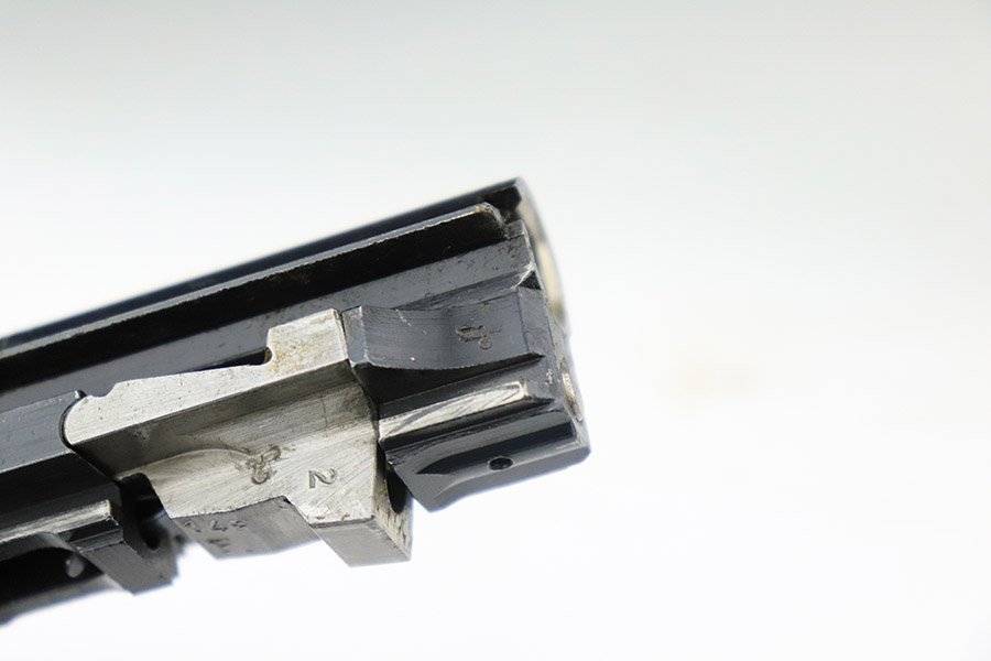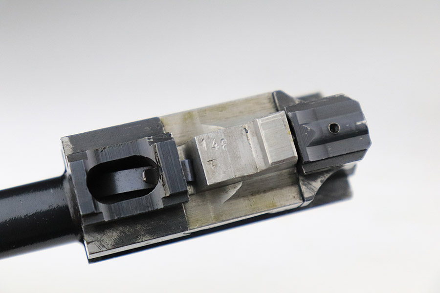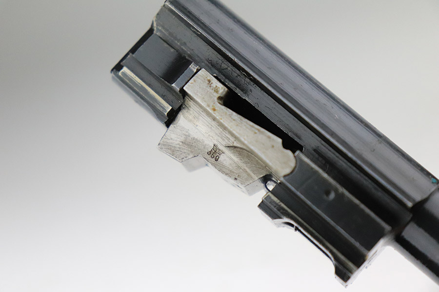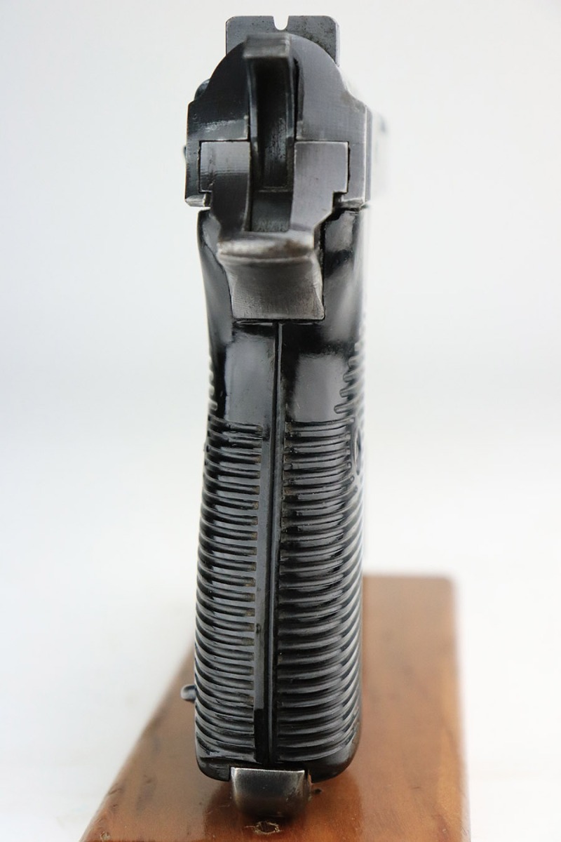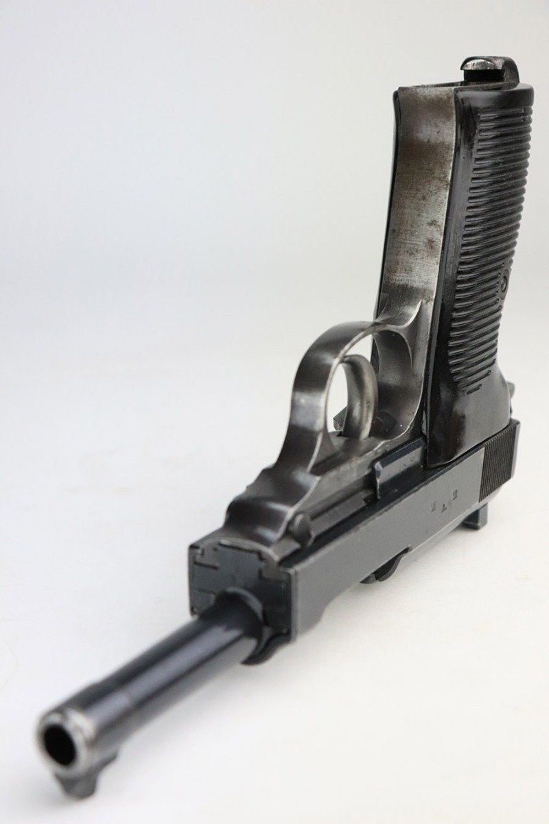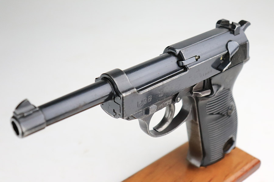 11/7/22 – This is a nice example of an AC 43 Walther P.38 issued to the Nazi military in 1943. It is all matching and has the proper “Eagle 359” military acceptance proofs throughout. It has retained roughly 85% of its original finish. The majority of the finish loss is on the front strap, but there is also very minor wear around the muzzle and high edges of the slide. There are areas of spotty oxidation on the front strap, along both sides of the slide, and a little bit along the barrel. Comes with nice blackish-brown bakelite grips and a “Eagle 135” marked Mauser magazine. The bore is near-mint. De-cocker is functional.