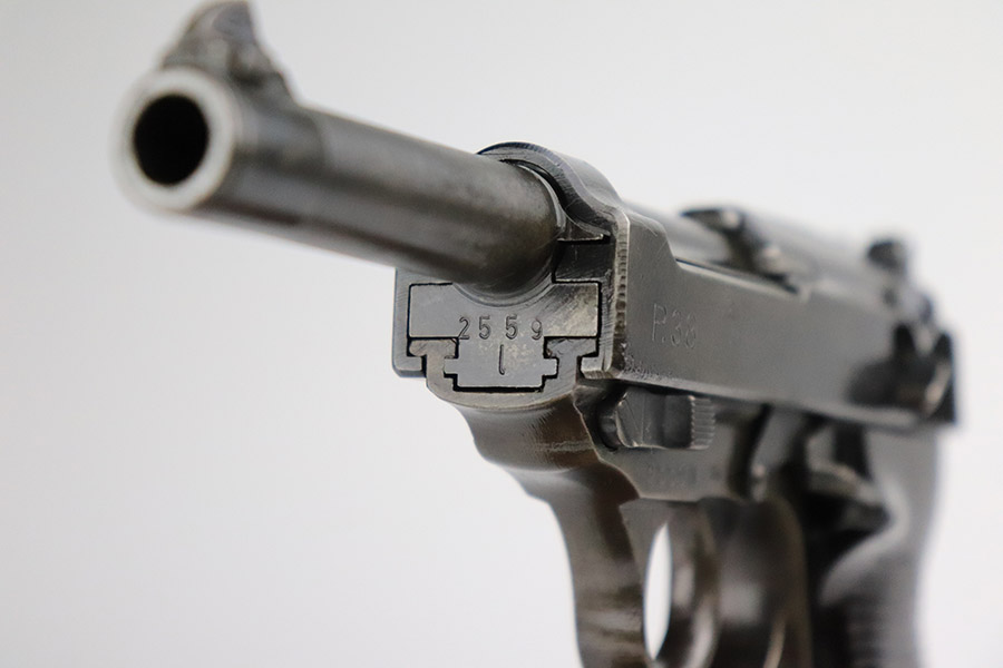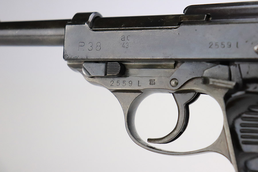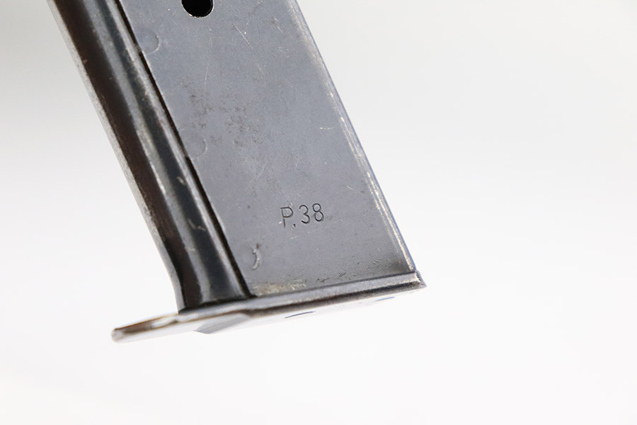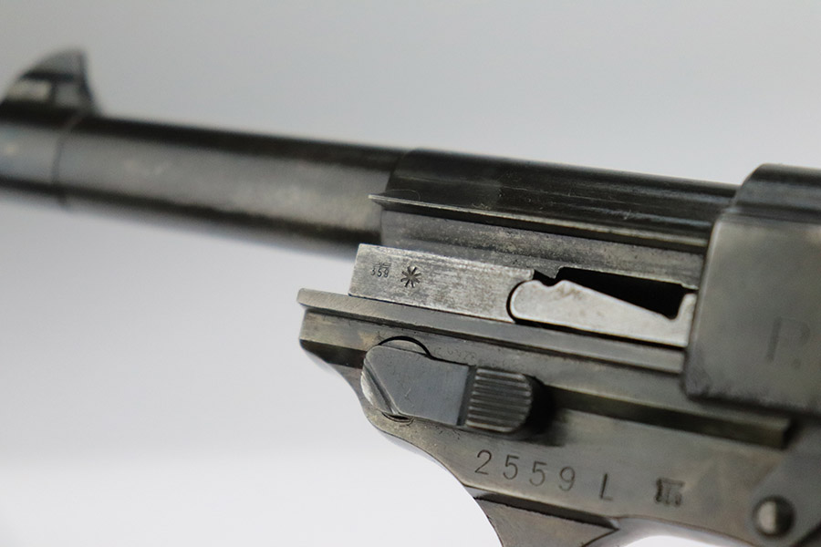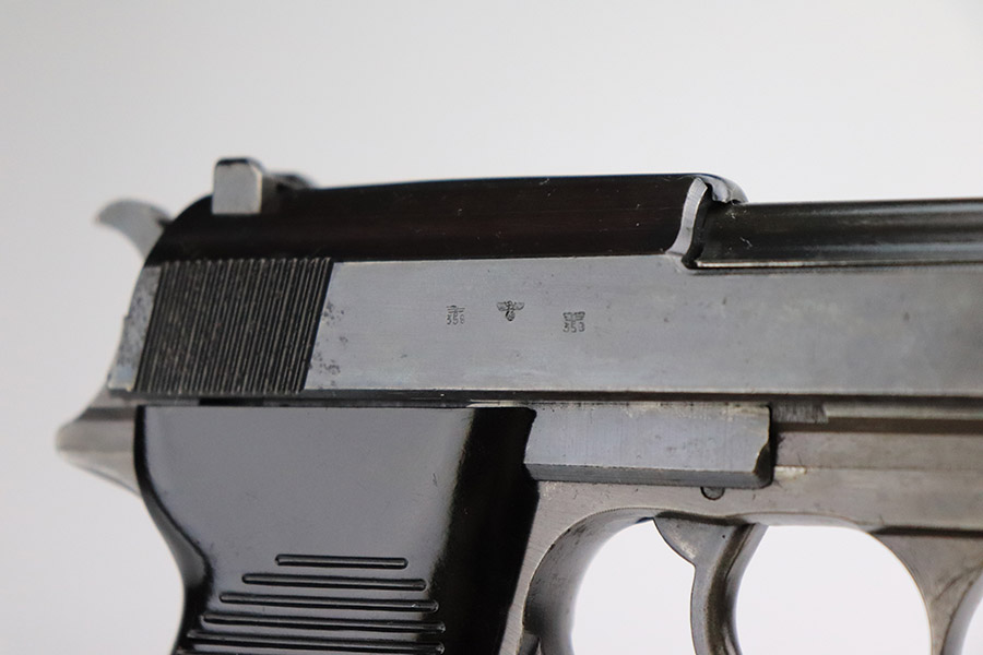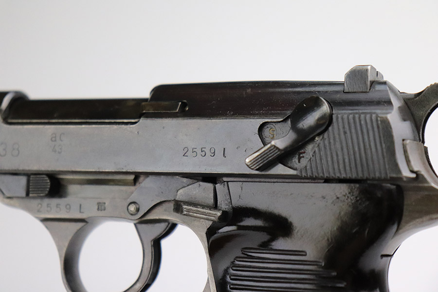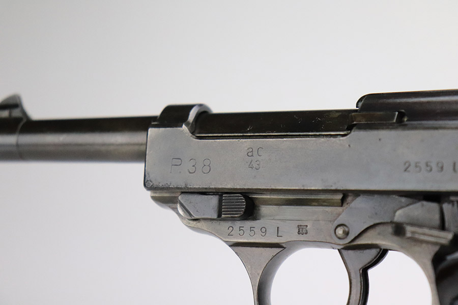 11/8/22 – This an AC 43 Walther P.38 issued to the Nazi military in 1943. It is all matching and has the proper “Eagle 359” military acceptance proofs throughout. There is an “asterisk” marking on the barrel, indicating it failed initial inspection and was sent back to the factory for repair – desirable for some collectors. The gun has been refinished and has retained about 70% of its new bluing. There is not a ton of actual finish loss, but there are areas of splotchy discoloration and spotty oxidation throughout. Areas of pitting at the front left and back right of the slide. Comes with nice blackish-brown bakelite grips and an “Eagle 359” marked Walther magazine. The bore has decent rifling, but there is minor pitting throughout. De-cocker is functional.