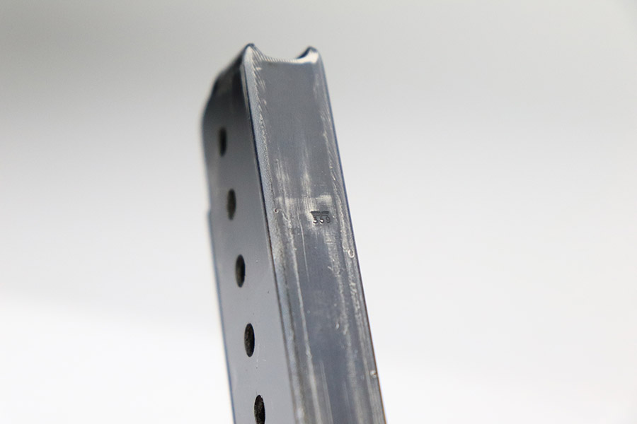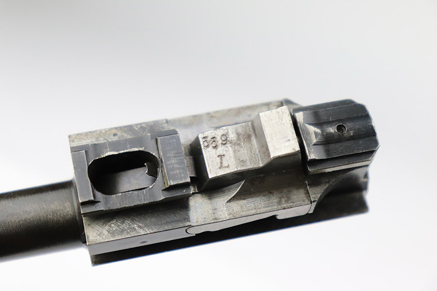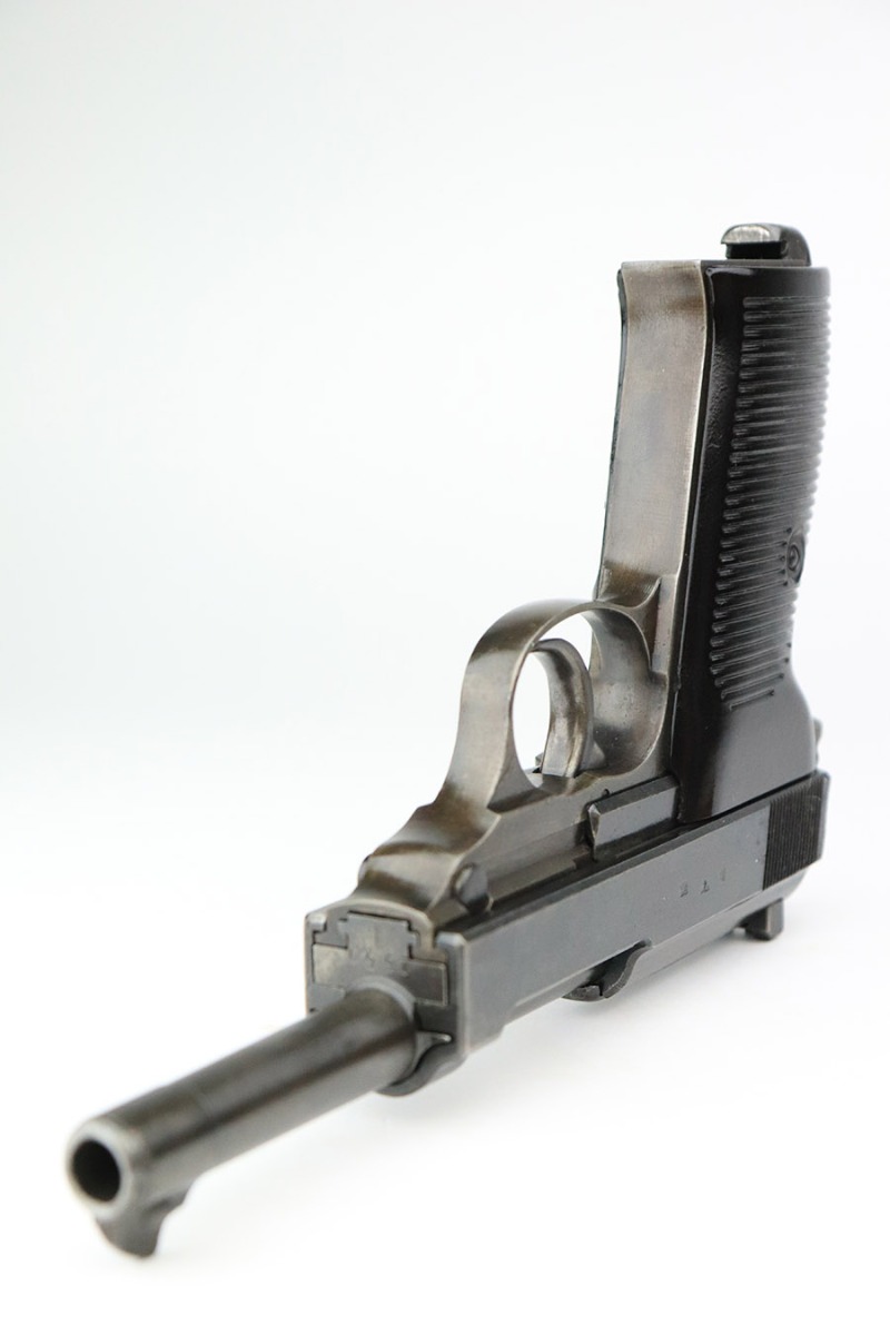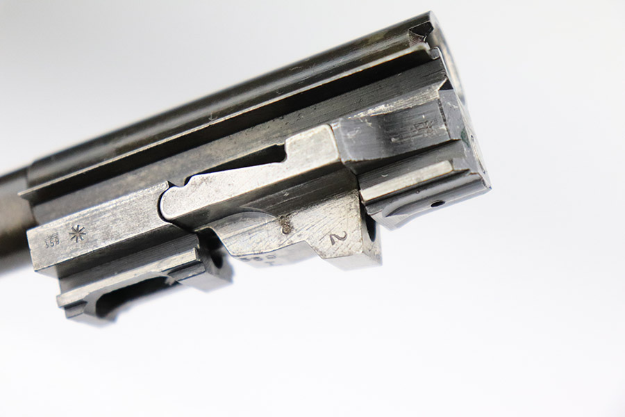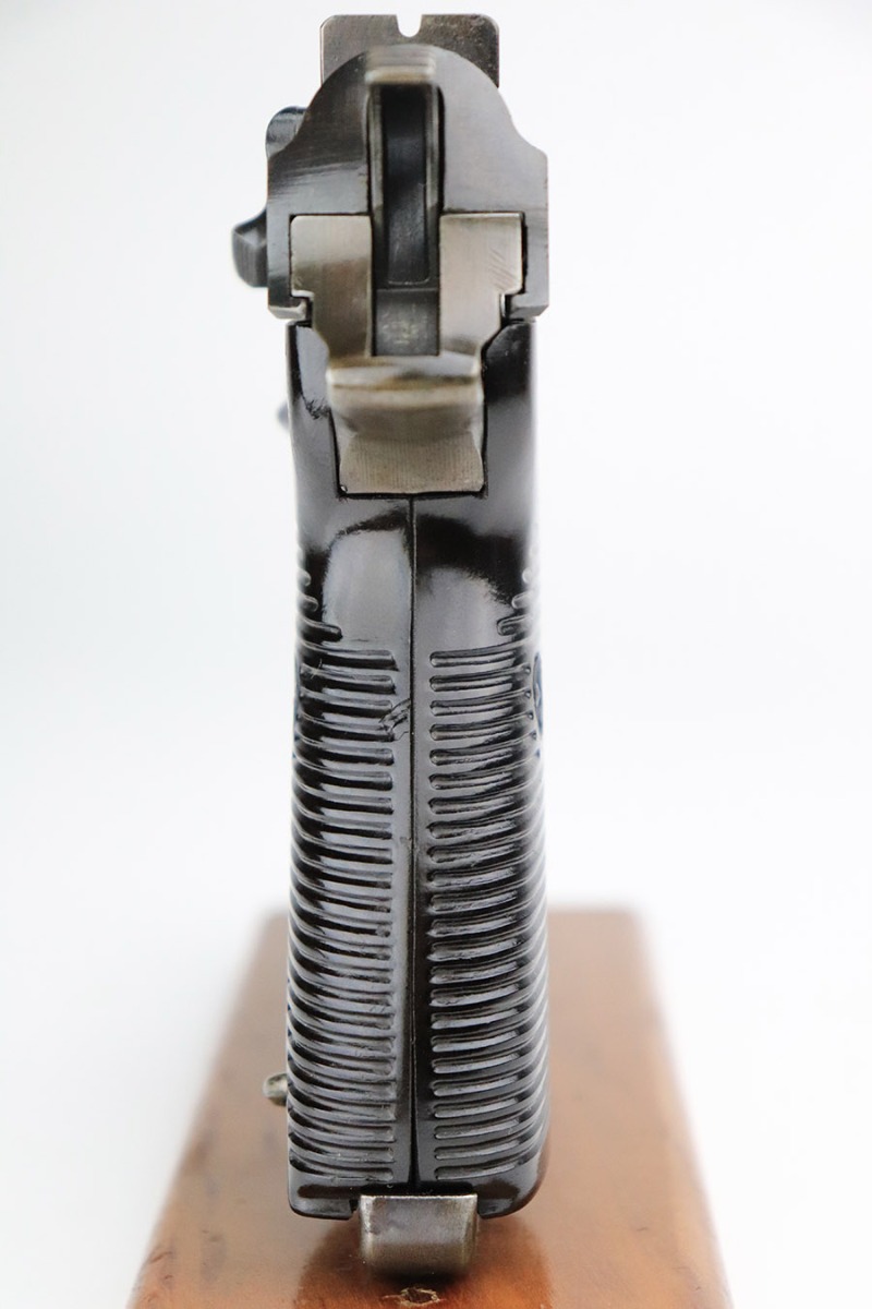 11/8/22 – This an AC 43 Walther P.38 issued to the Nazi military in 1943. It is all matching and has the proper “Eagle 359” military acceptance proofs throughout. There is an “asterisk” marking on the barrel, indicating it failed initial inspection and was sent back to the factory for repair – desirable for some collectors. The gun has been refinished and has retained about 70% of its new bluing. There is not a ton of actual finish loss, but there are areas of splotchy discoloration and spotty oxidation throughout. Areas of pitting at the front left and back right of the slide. Comes with nice blackish-brown bakelite grips and an “Eagle 359” marked Walther magazine. The bore has decent rifling, but there is minor pitting throughout. De-cocker is functional.