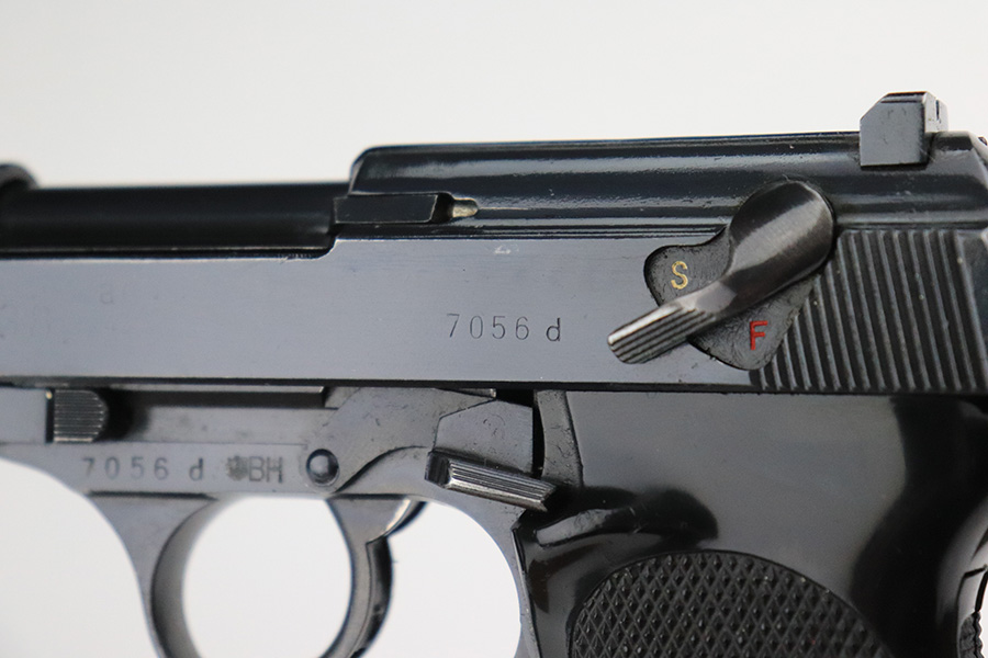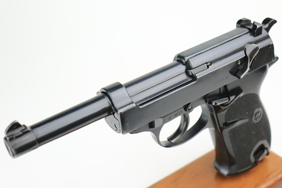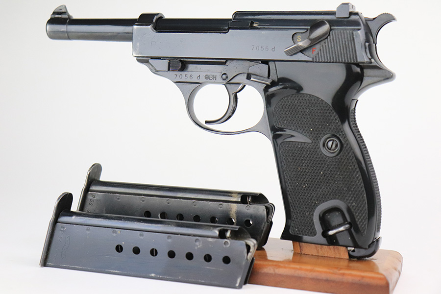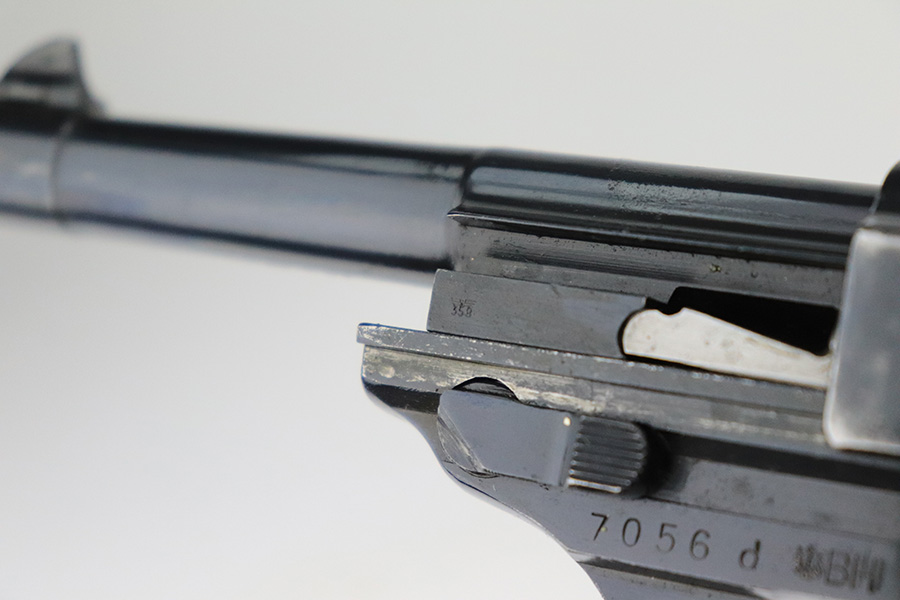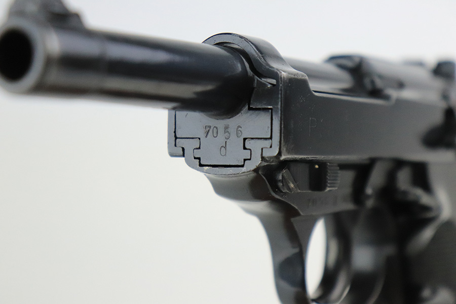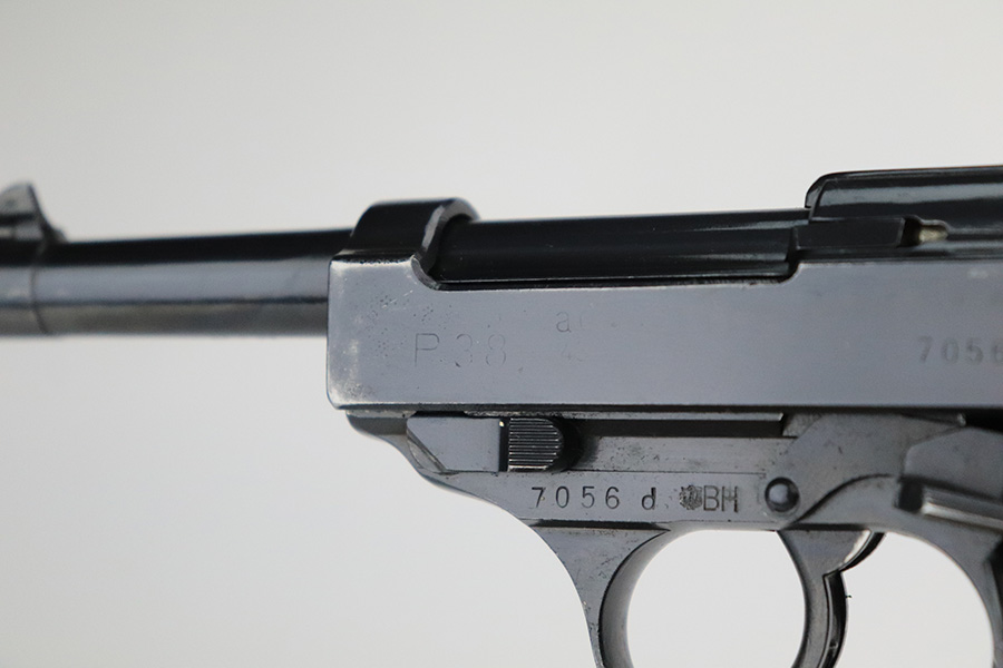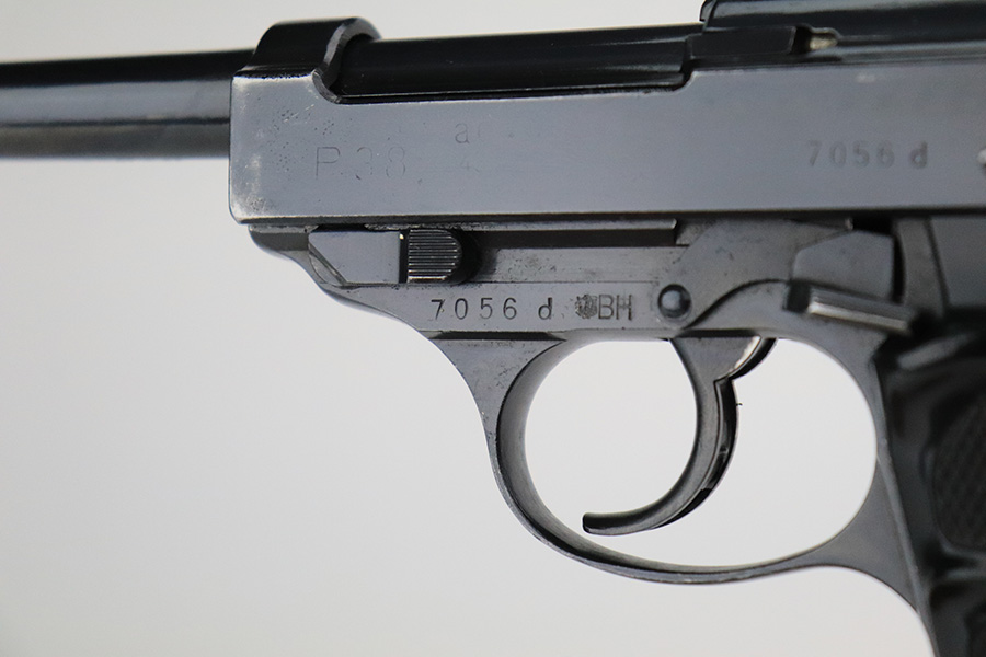 6/15/22 – This is a nice example of a Walther P.38 issued to the Nazi military in 1943. It is all matching and has the proper “Eagle 359” Nazi military acceptance proofs throughout. There is also an “Eagle BH” marking on the left side of the frame, indicating that this gun ended up with Austrian military after WW2. Import mark on the underside of the barrel. “Germany” export marking on the right side of the frame. The gun has been refinished and has retained about 96% of its bluing. There is minor wear at the front edges of the slide and around the muzzle. Very minor thinning on the front strap. Light scratchy wear along the right side of the slide. The bore has good rifling with minor pin-pricking throughout. Comes with post-war black plastic grips and two post-war magazines. De-cocker is functional.