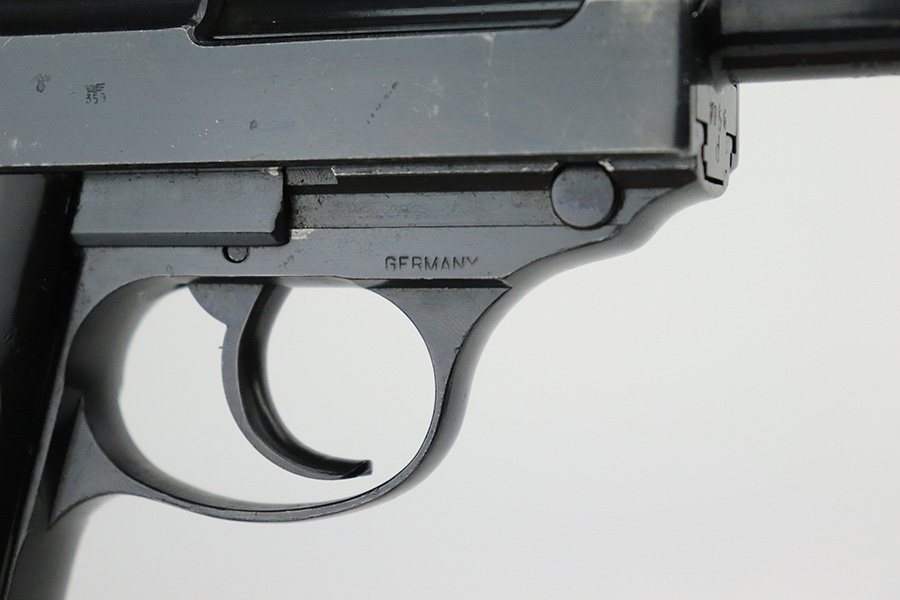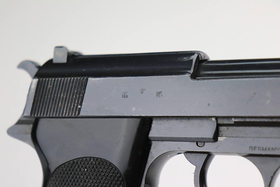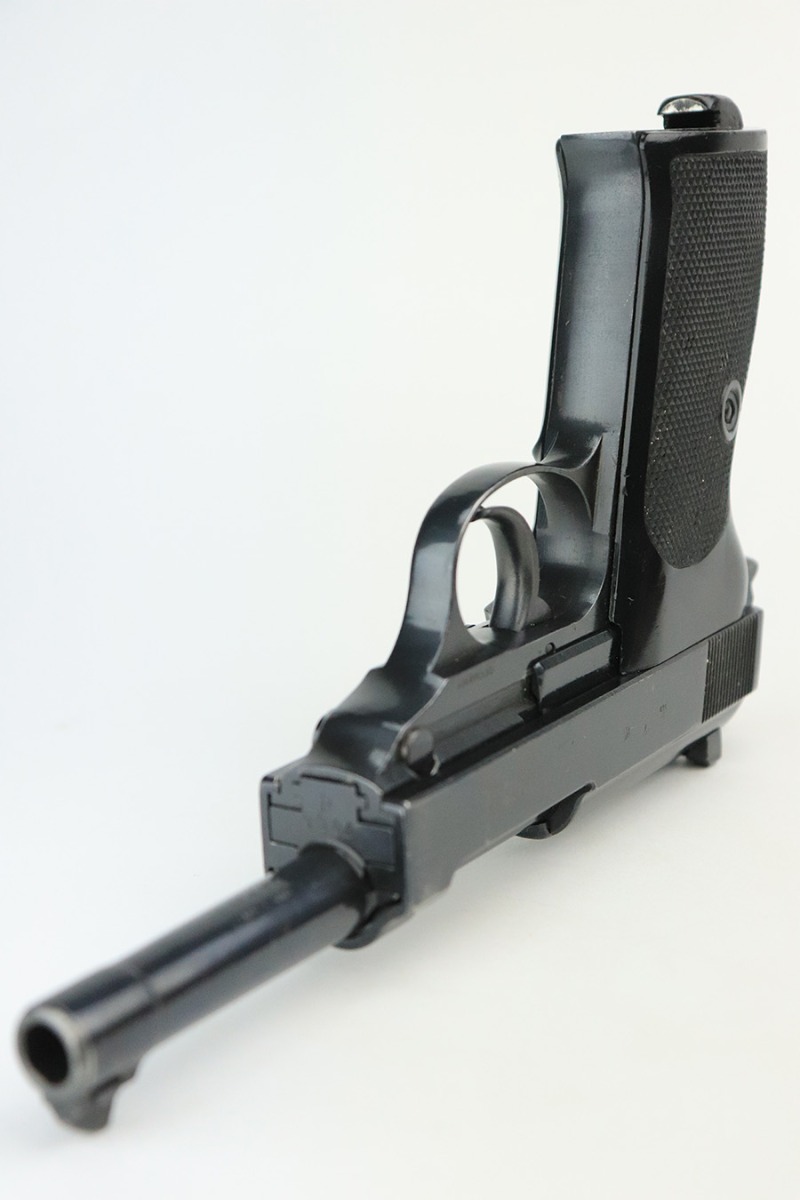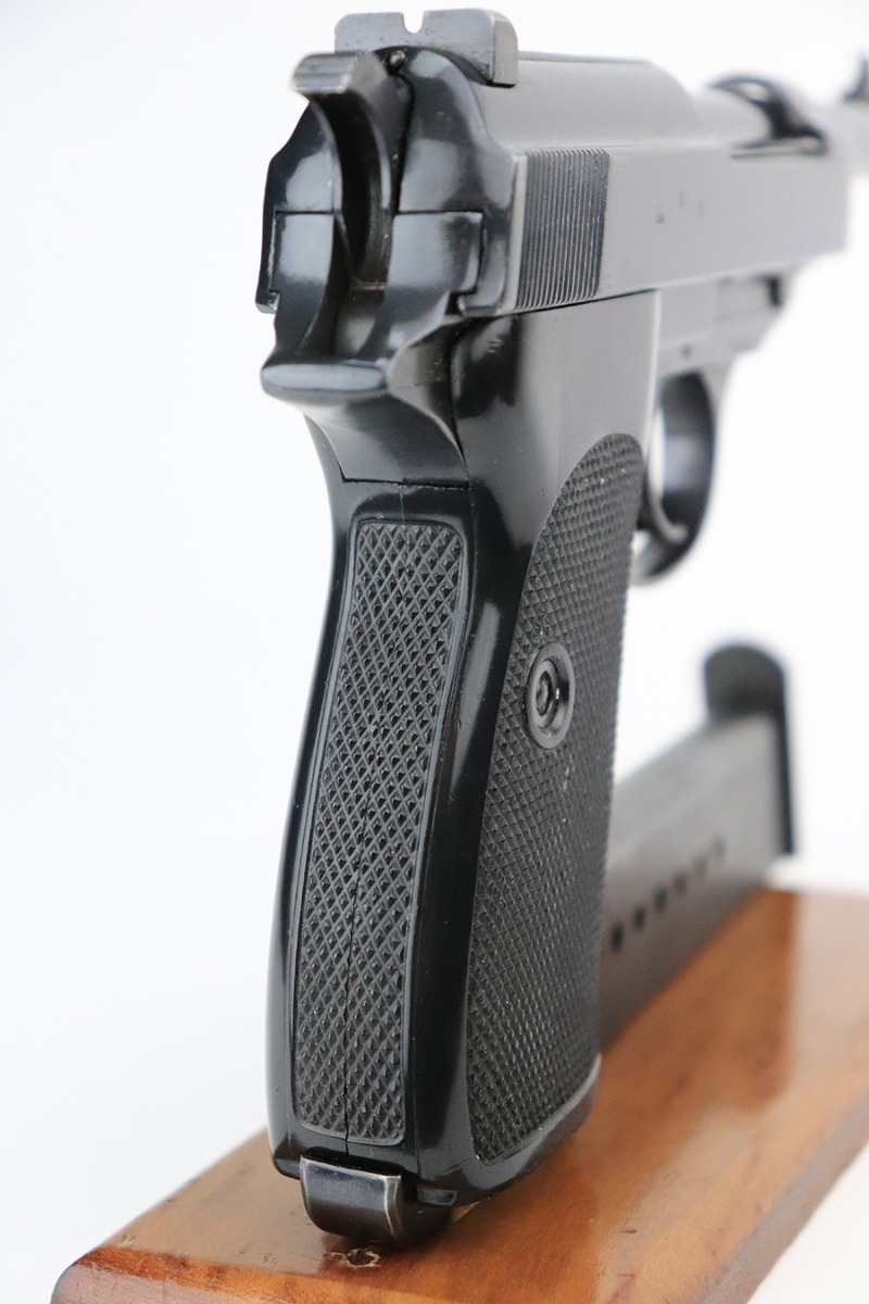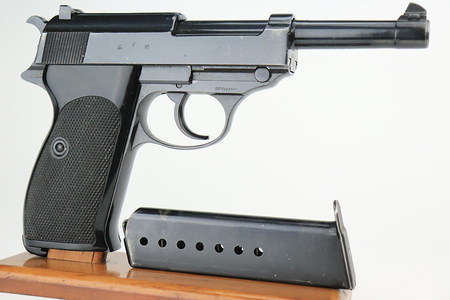 6/15/22 – This is a nice example of a Walther P.38 issued to the Nazi military in 1943. It is all matching and has the proper “Eagle 359” Nazi military acceptance proofs throughout. There is also an “Eagle BH” marking on the left side of the frame, indicating that this gun ended up with Austrian military after WW2. Import mark on the underside of the barrel. “Germany” export marking on the right side of the frame. The gun has been refinished and has retained about 96% of its bluing. There is minor wear at the front edges of the slide and around the muzzle. Very minor thinning on the front strap. Light scratchy wear along the right side of the slide. The bore has good rifling with minor pin-pricking throughout. Comes with post-war black plastic grips and two post-war magazines. De-cocker is functional.
