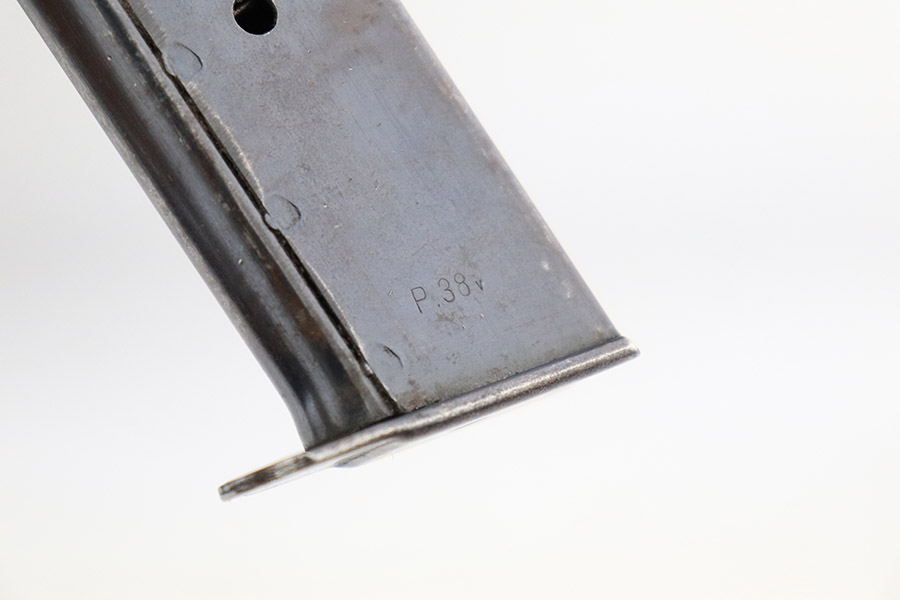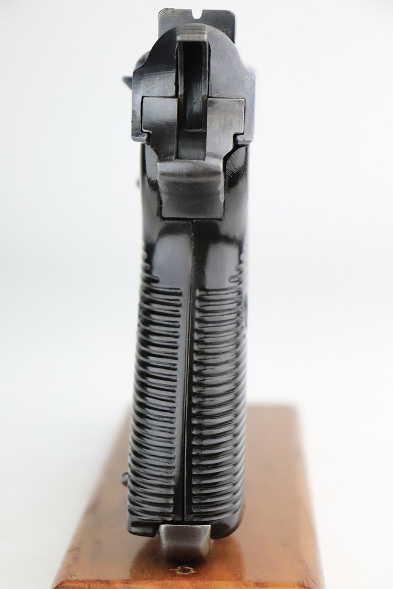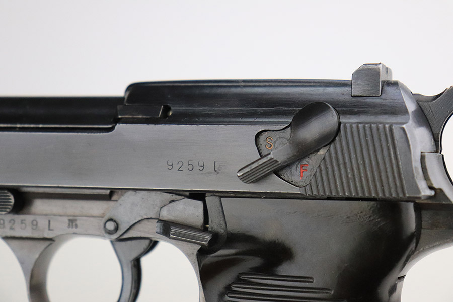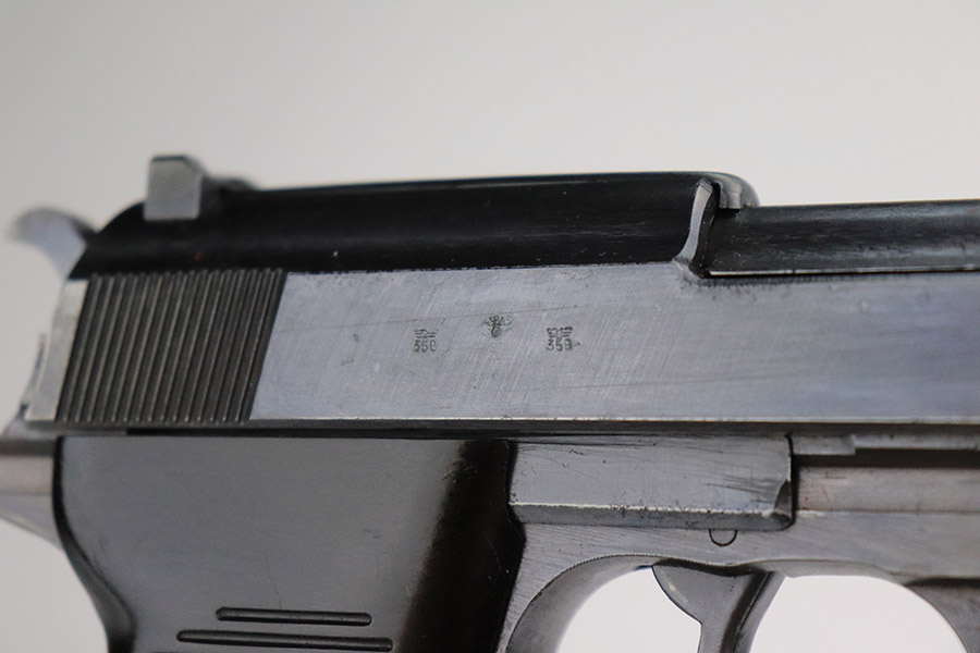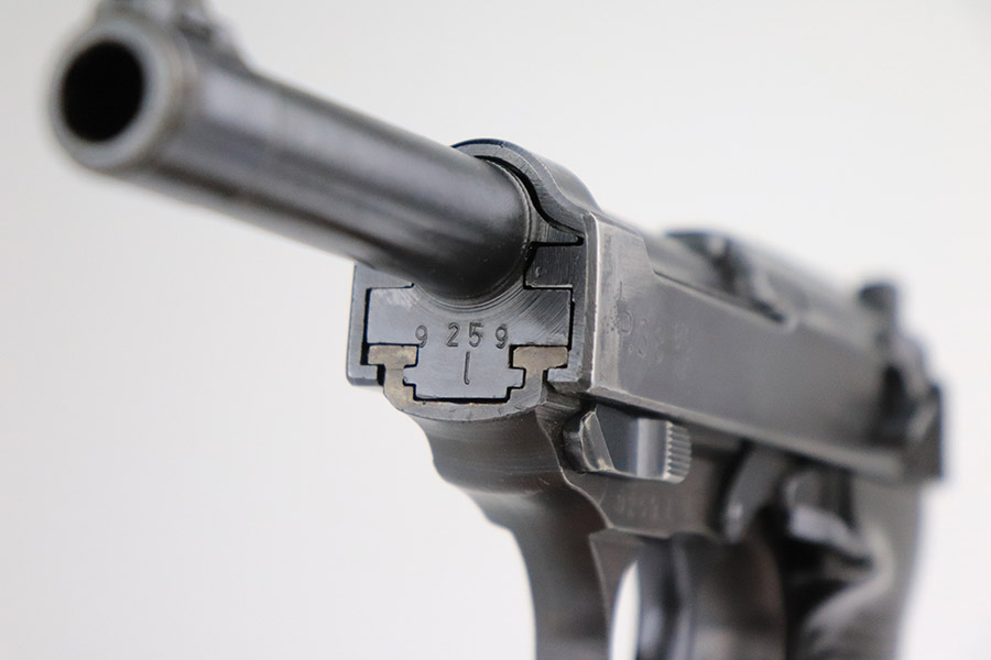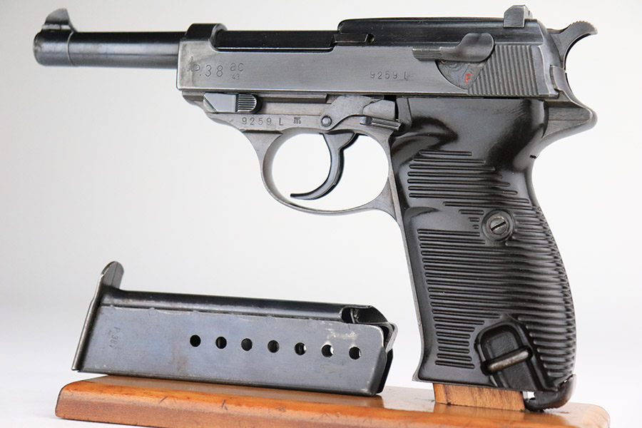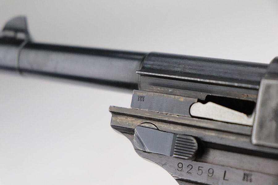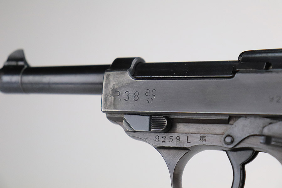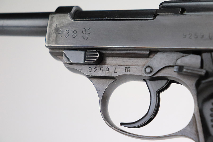 11/7/22 – This is an excellent example of an AC 43 Walther P.38 issued to the Nazi military in 1943. This one is a scarce “small date” variant in the proper “L” serial block. In this block, they used a different die for the “43” in the slide legend, and it is slightly smaller than the standard variant. It is all matching and has the proper “Eagle 359” Nazi military acceptance proofs throughout. The gun is in excellent condition and has retained most of its finish except for an obvious spot of wear at the front left of the slide. Comes with excellent black bakelite grips and a period-correct “Eagle 359” marked Walther magazine. Excellent bore with strong rifling. De-cocker is functional.
