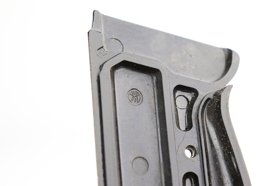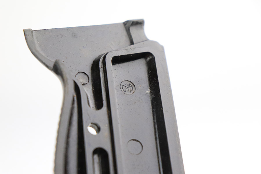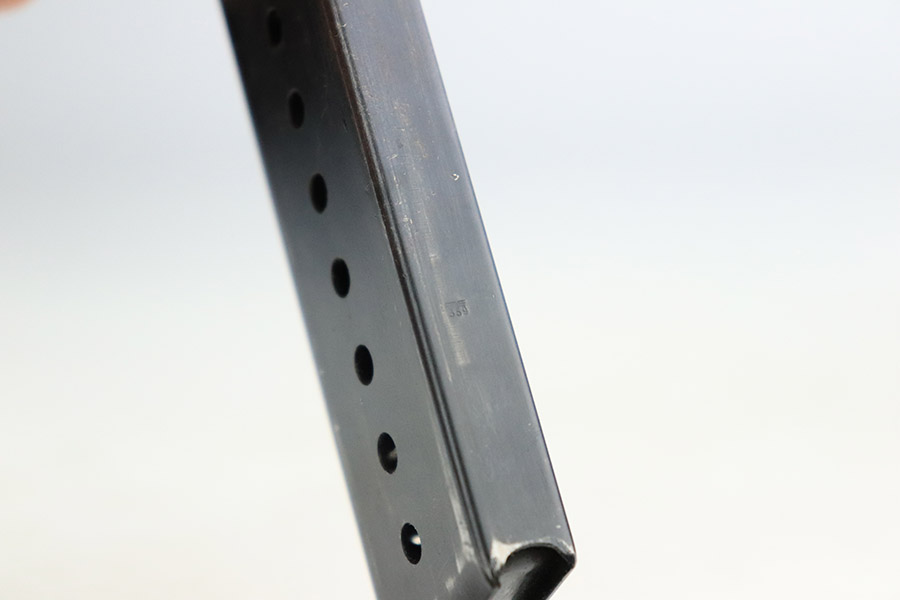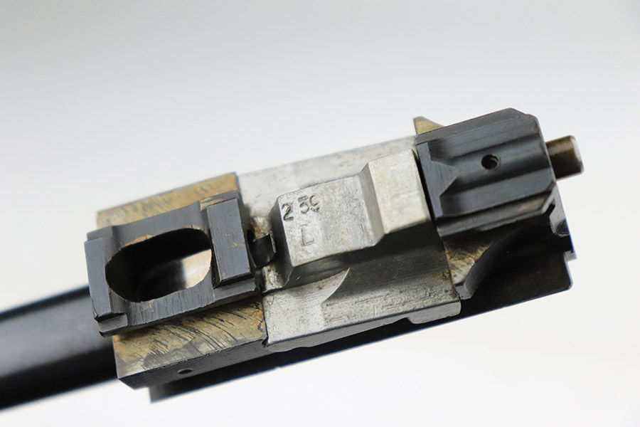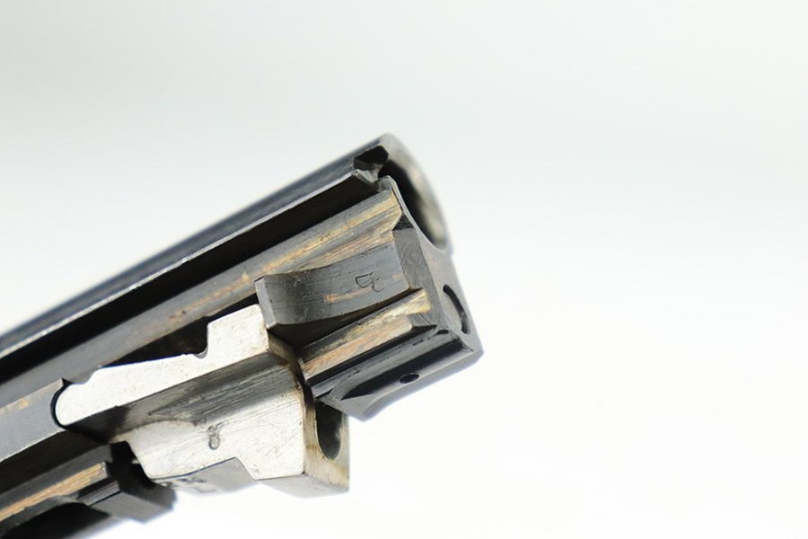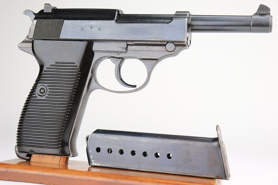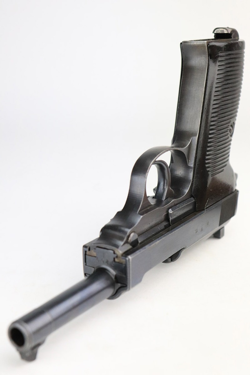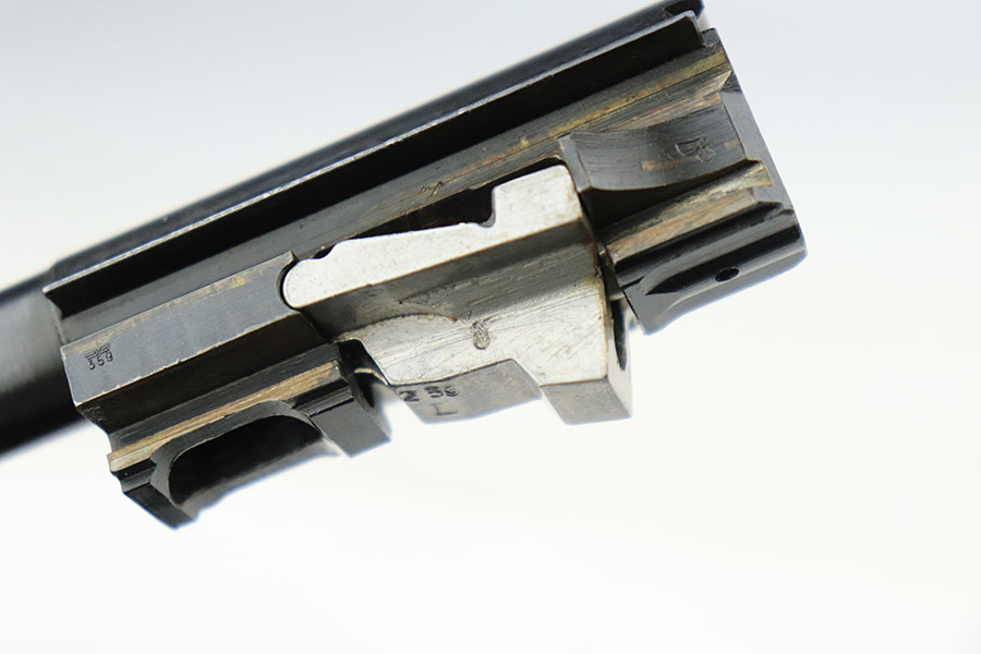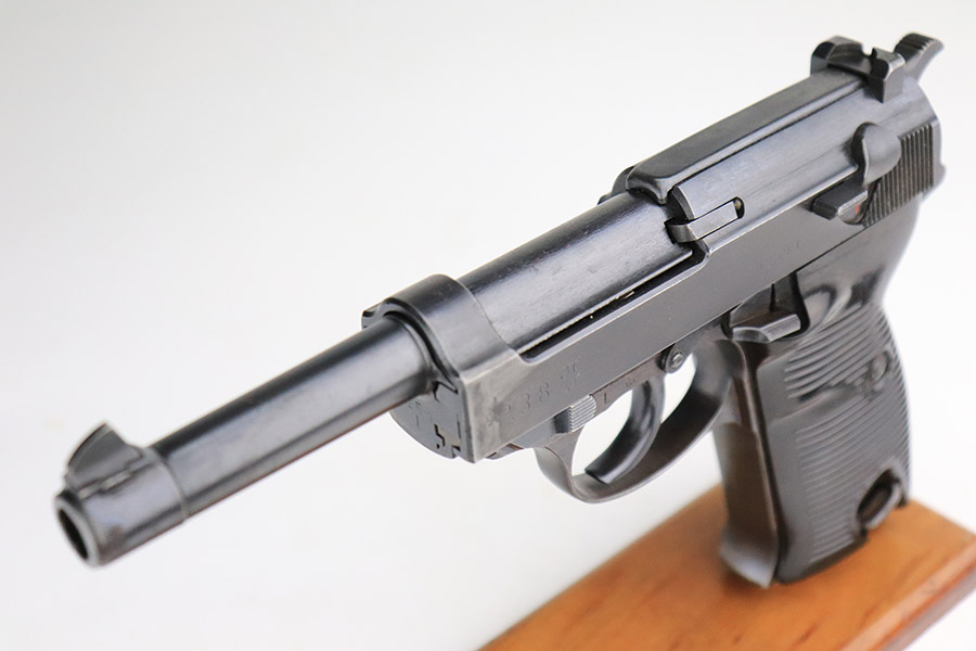 11/7/22 – This is an excellent example of an AC 43 Walther P.38 issued to the Nazi military in 1943. This one is a scarce “small date” variant in the proper “L” serial block. In this block, they used a different die for the “43” in the slide legend, and it is slightly smaller than the standard variant. It is all matching and has the proper “Eagle 359” Nazi military acceptance proofs throughout. The gun is in excellent condition and has retained most of its finish except for an obvious spot of wear at the front left of the slide. Comes with excellent black bakelite grips and a period-correct “Eagle 359” marked Walther magazine. Excellent bore with strong rifling. De-cocker is functional.