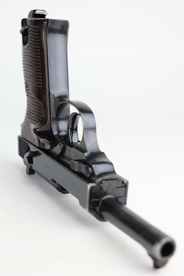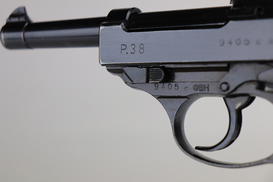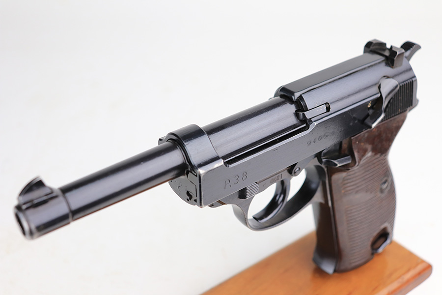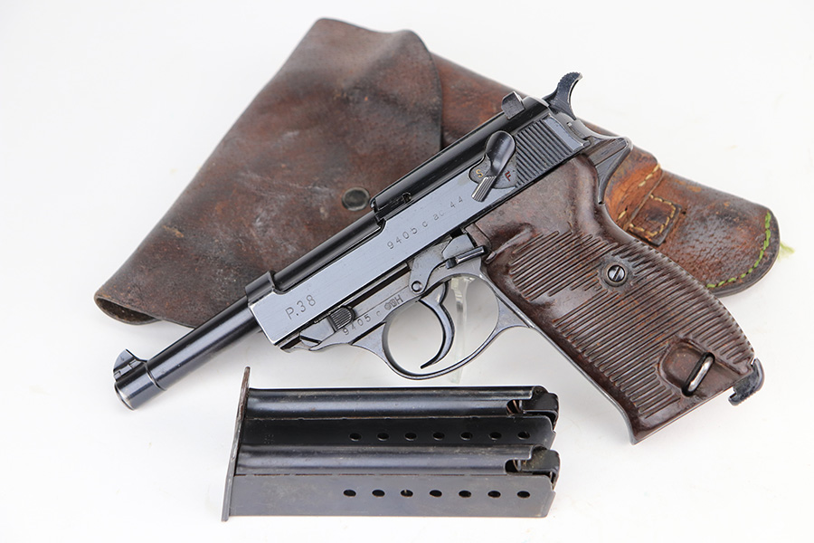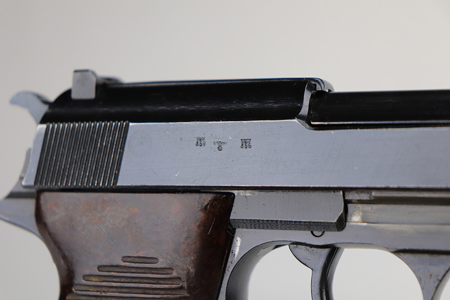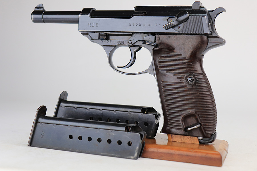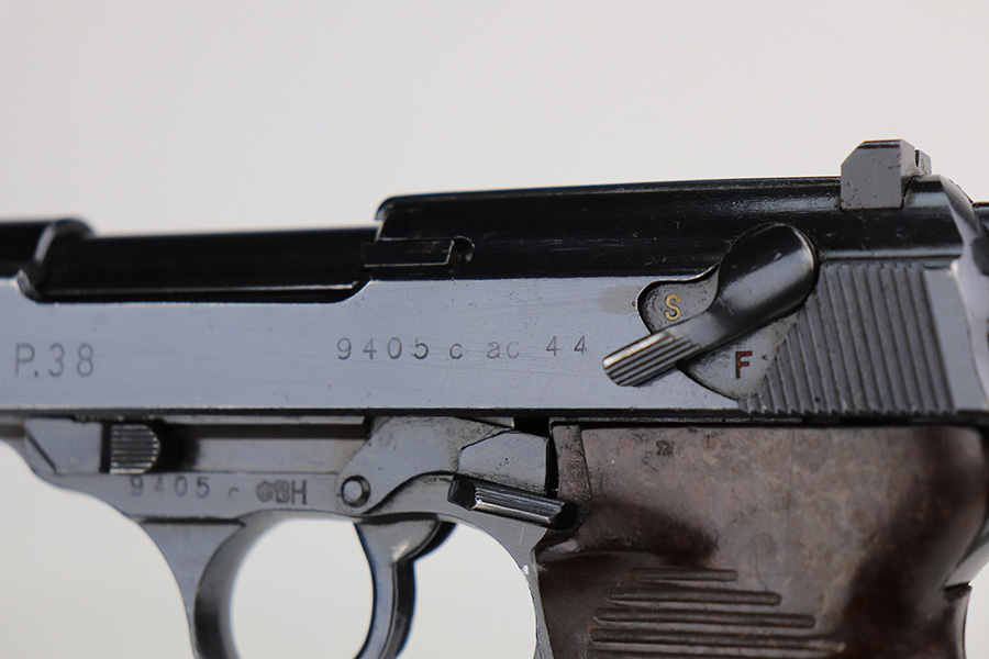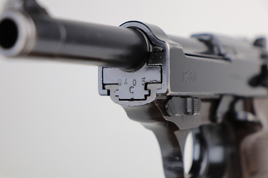 1/11/22 – This is an excellent example of a Walther P.38 issued to the Nazi military in 1944. The gun is all matching (except for the locking block, which is un-numbered) and has the proper “Eagle 359” Nazi military acceptance proofs throughout. There is an “Eagle BH” proof on the left side of the frame, indicating this gun ended up at an arsenal and eventually issued to the Austrian military. It comes as a rig with a generic pigskin holster, one period-correct Walther magazine, and one scarce “U” marked Walther magazine. The gun has retained about 97-98% of its finish. There is very minor wear at the front edges of the slide and around the muzzle. A few very light scratches and handling marks on the right side of the slide. Comes with excellent period-correct reddish bakelite grips. The rifling in the bore is a bit worn with tiny pits throughout. De-cocker is functional.