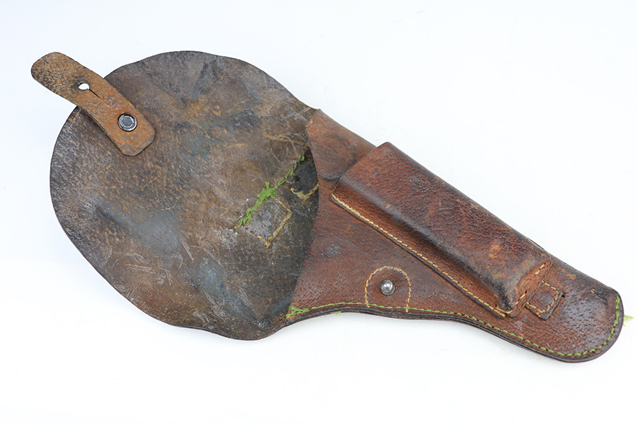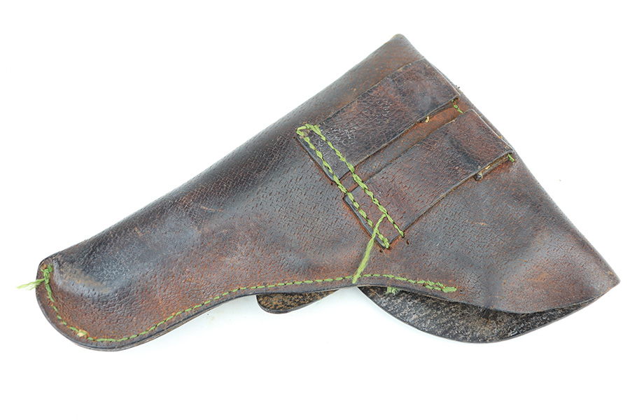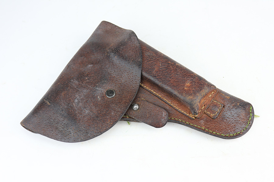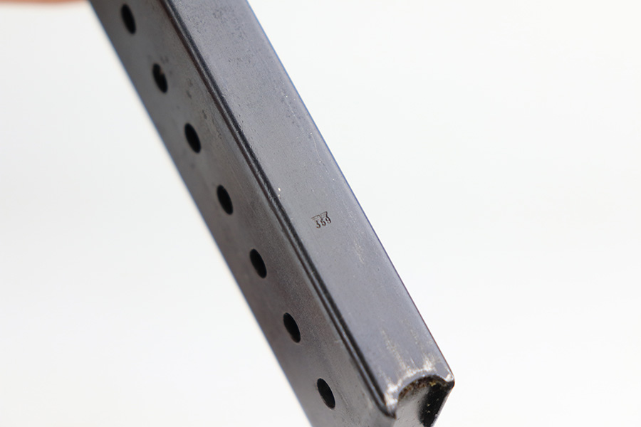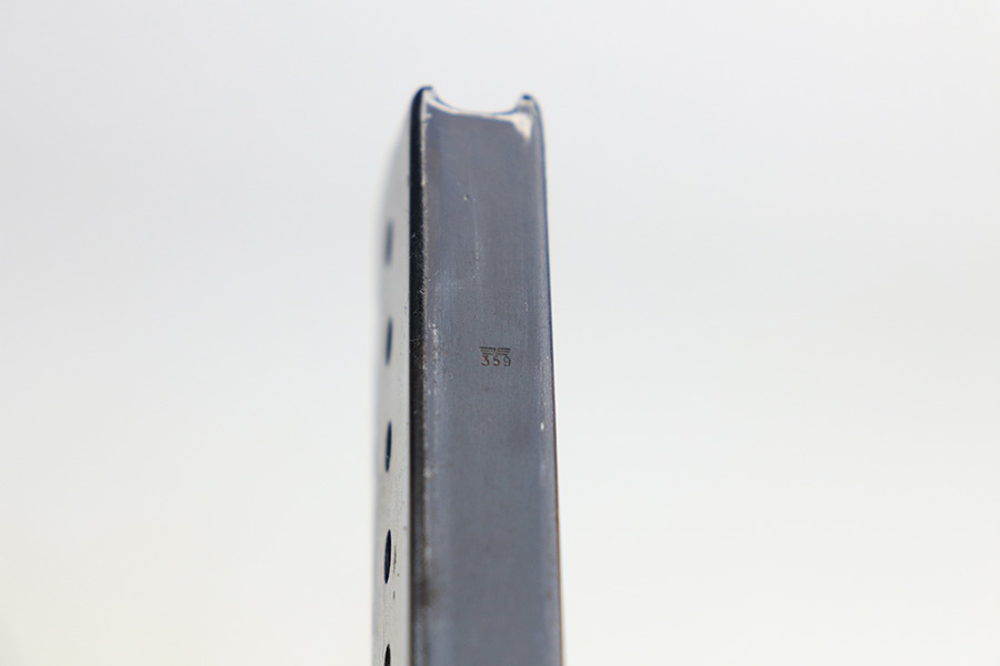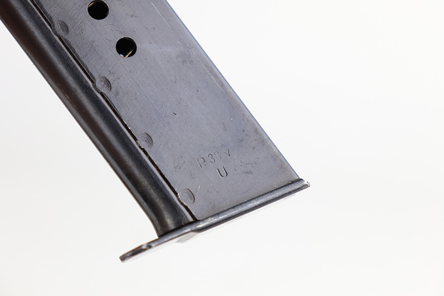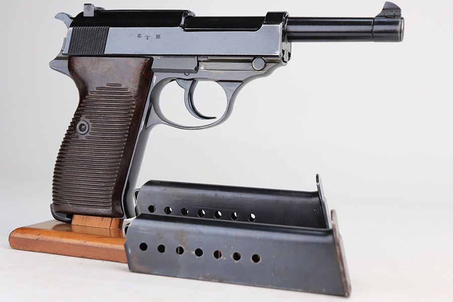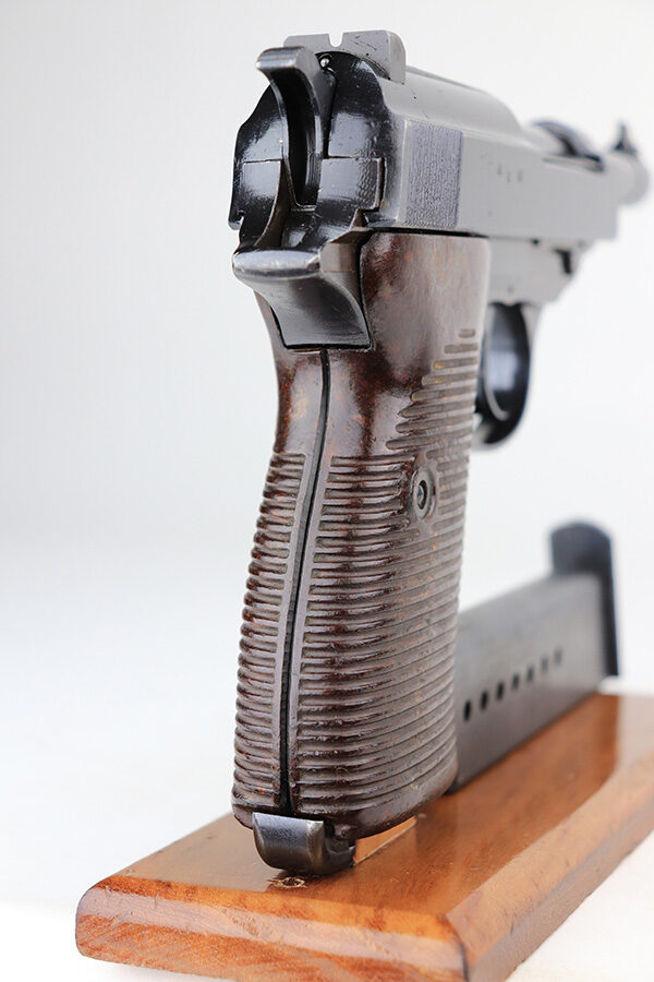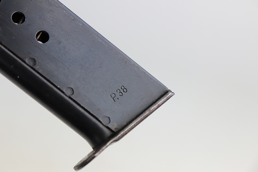 1/11/22 – This is an excellent example of a Walther P.38 issued to the Nazi military in 1944. The gun is all matching (except for the locking block, which is un-numbered) and has the proper “Eagle 359” Nazi military acceptance proofs throughout. There is an “Eagle BH” proof on the left side of the frame, indicating this gun ended up at an arsenal and eventually issued to the Austrian military. It comes as a rig with a generic pigskin holster, one period-correct Walther magazine, and one scarce “U” marked Walther magazine. The gun has retained about 97-98% of its finish. There is very minor wear at the front edges of the slide and around the muzzle. A few very light scratches and handling marks on the right side of the slide. Comes with excellent period-correct reddish bakelite grips. The rifling in the bore is a bit worn with tiny pits throughout. De-cocker is functional.