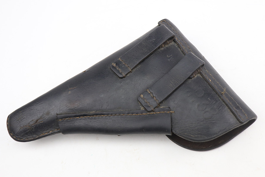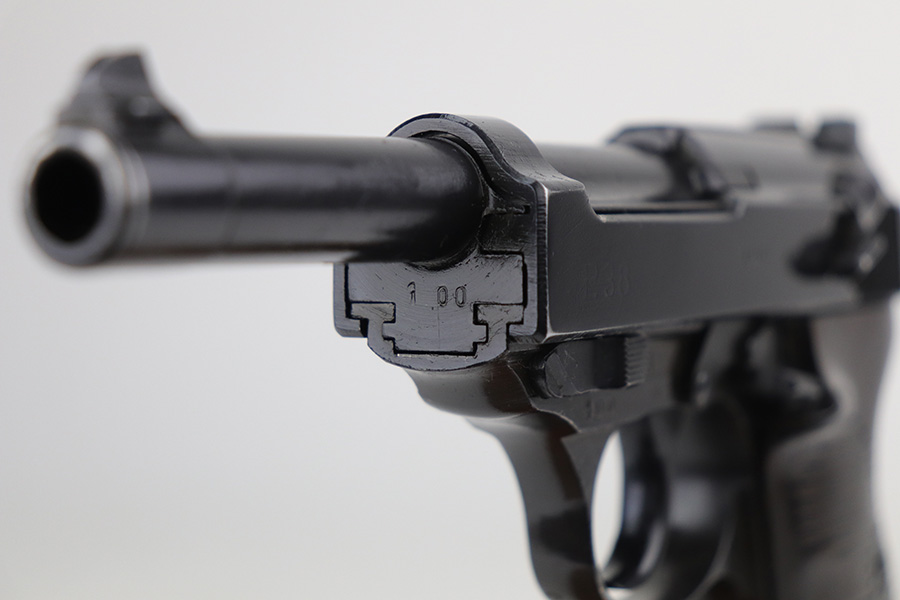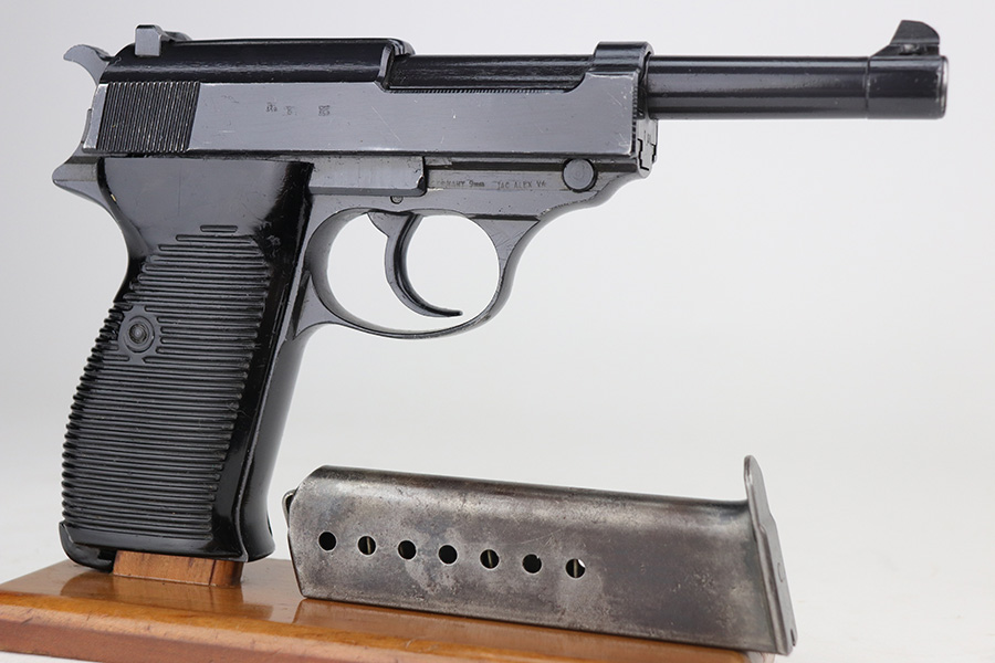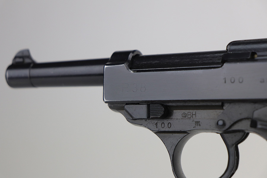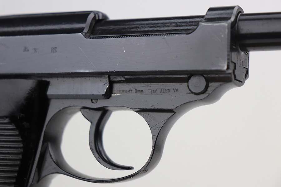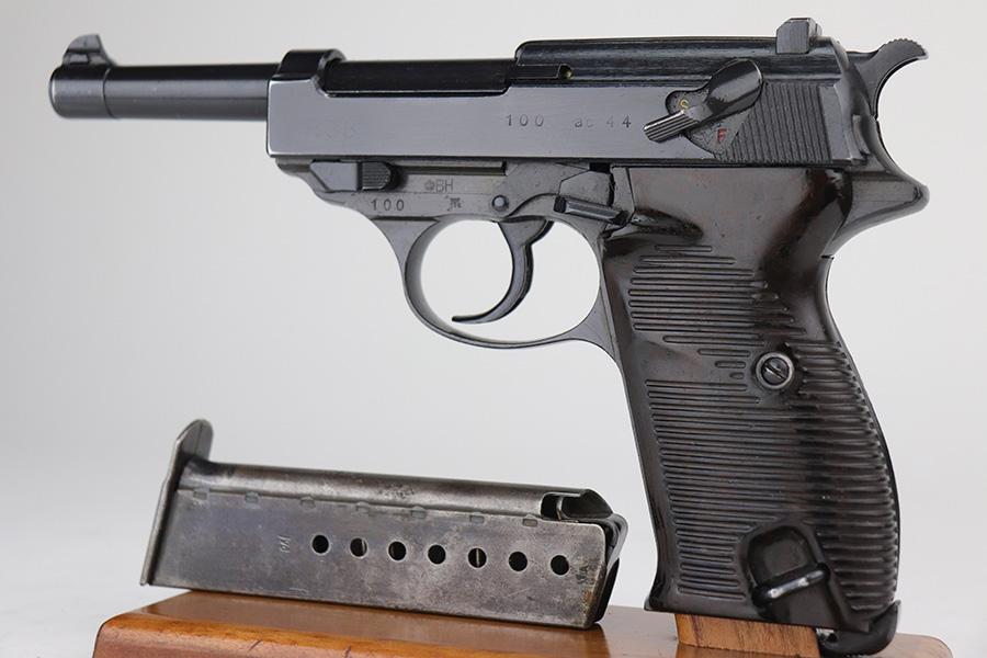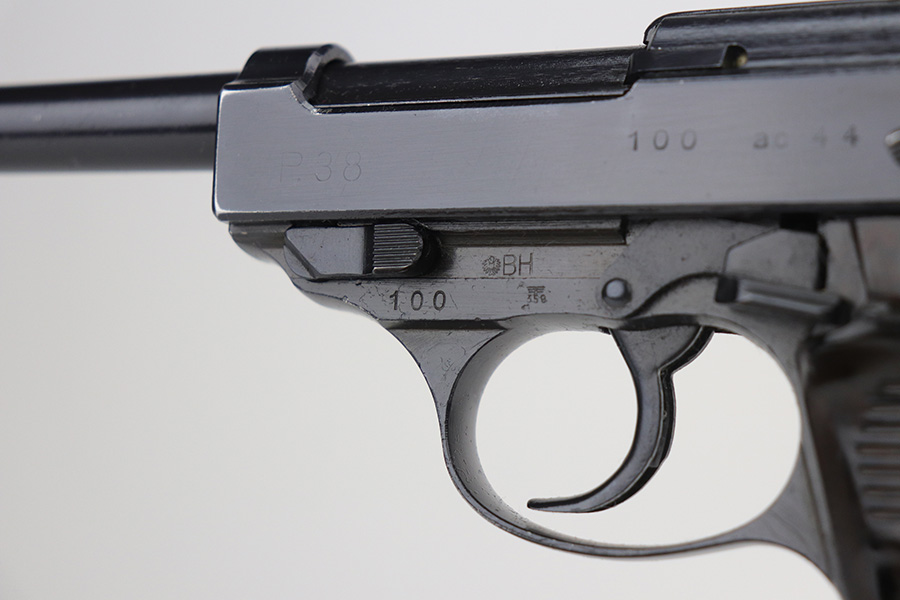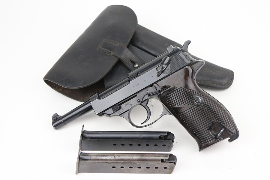 11/4/21 – This is a very nice example of a Walther P.38 that was issued to the Nazi military in 1944. It is all matching, has the proper “Eagle 359” Nazi military acceptance proofs, and has a very nice “100” serial number. There is an import mark on the right side of the frame and an “Eagle BH” marking on the left side of the frame, indicating this gun was diverted to the Austrian military after WW2. It comes as a rig with a nice 1944-dated holster, a Walther magazine with post-war numbering (non-matching), and a period-correct jvd magazine. The gun has been completely refinished and has retained about 98% of its new bluing. There are just hints of wear at the very front edges of the slide and around the muzzle. Some very light scratches on the right side of the slide. Comes with very nice bakelite grips – the left one is brown, the right one is black and likely cut down. The bore has good rifling with light freckling here and there. The de-cocker is functional.