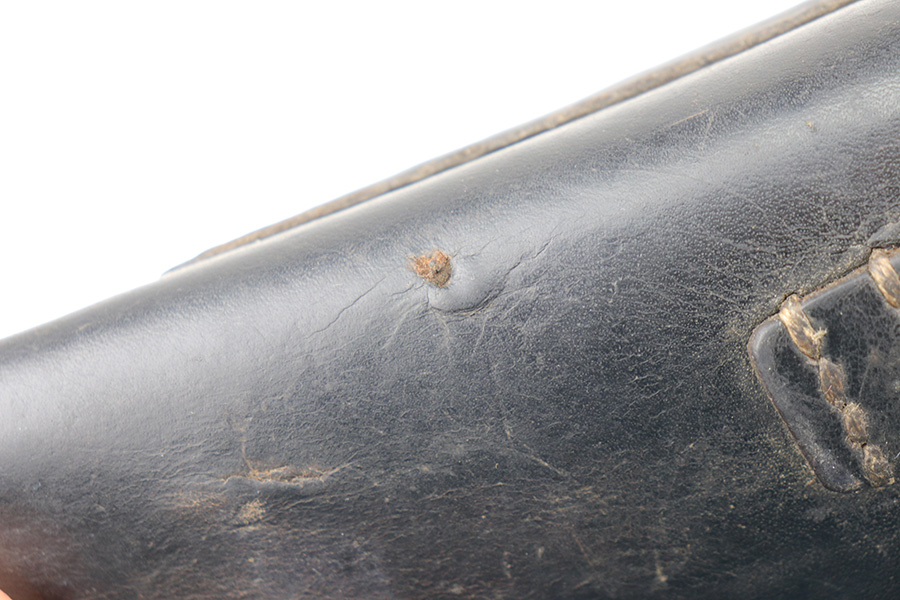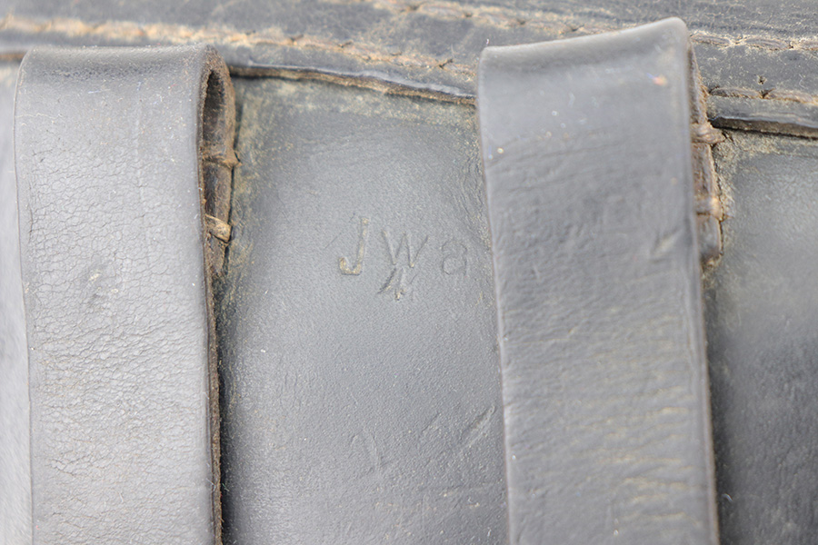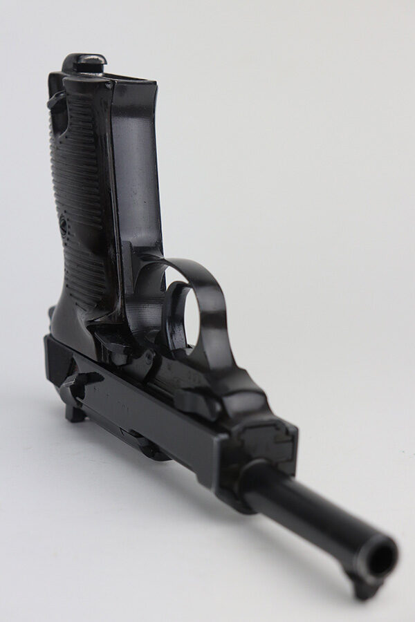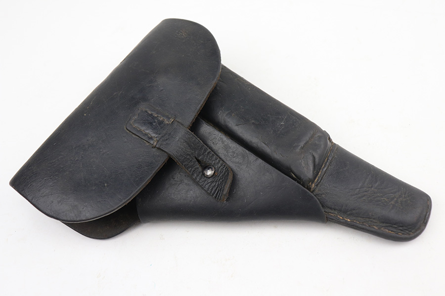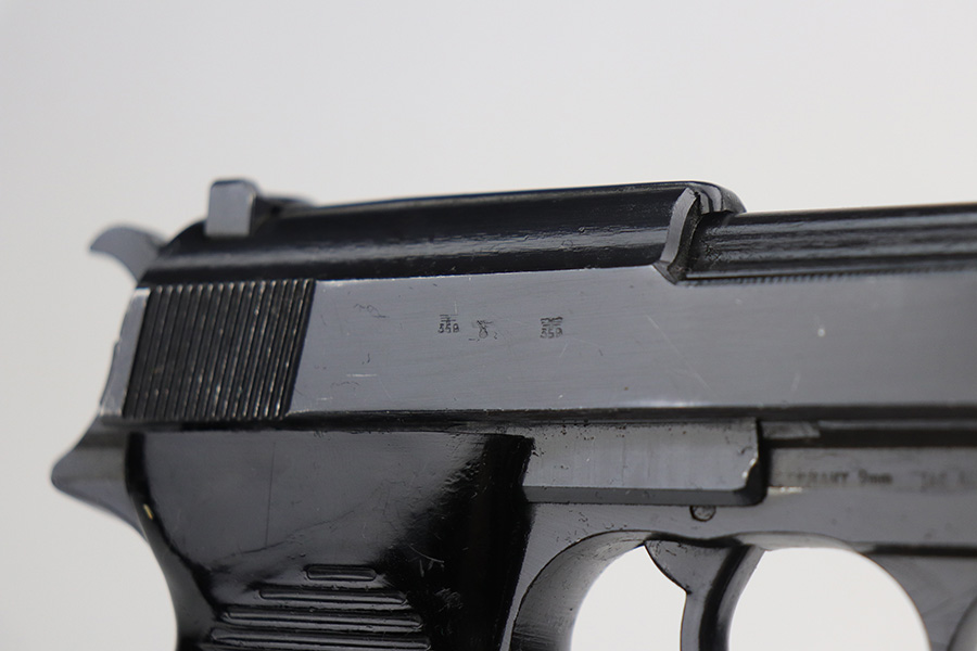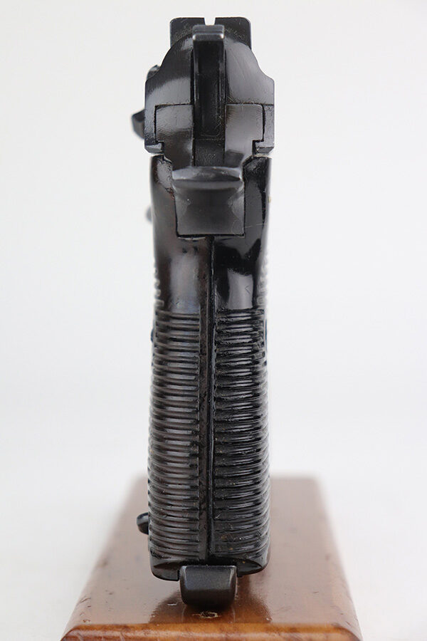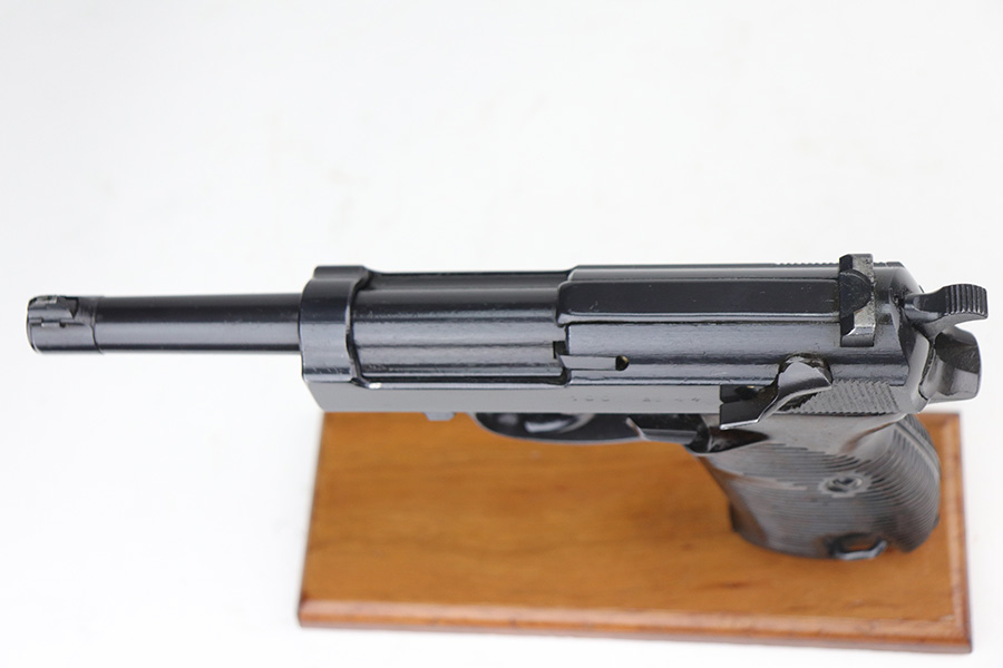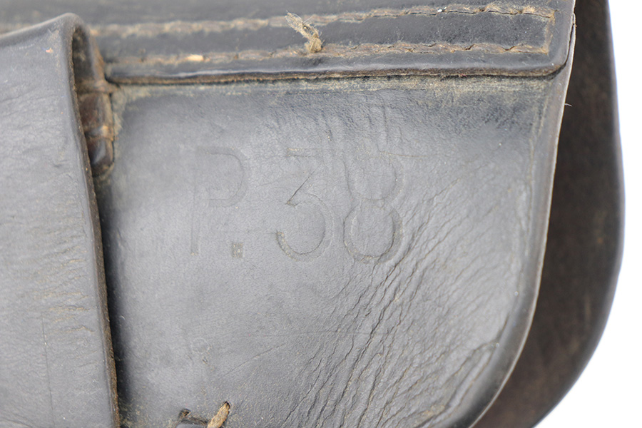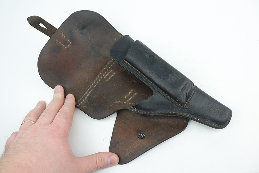 11/4/21 – This is a very nice example of a Walther P.38 that was issued to the Nazi military in 1944. It is all matching, has the proper “Eagle 359” Nazi military acceptance proofs, and has a very nice “100” serial number. There is an import mark on the right side of the frame and an “Eagle BH” marking on the left side of the frame, indicating this gun was diverted to the Austrian military after WW2. It comes as a rig with a nice 1944-dated holster, a Walther magazine with post-war numbering (non-matching), and a period-correct jvd magazine. The gun has been completely refinished and has retained about 98% of its new bluing. There are just hints of wear at the very front edges of the slide and around the muzzle. Some very light scratches on the right side of the slide. Comes with very nice bakelite grips – the left one is brown, the right one is black and likely cut down. The bore has good rifling with light freckling here and there. The de-cocker is functional.
