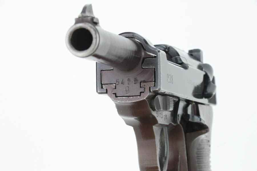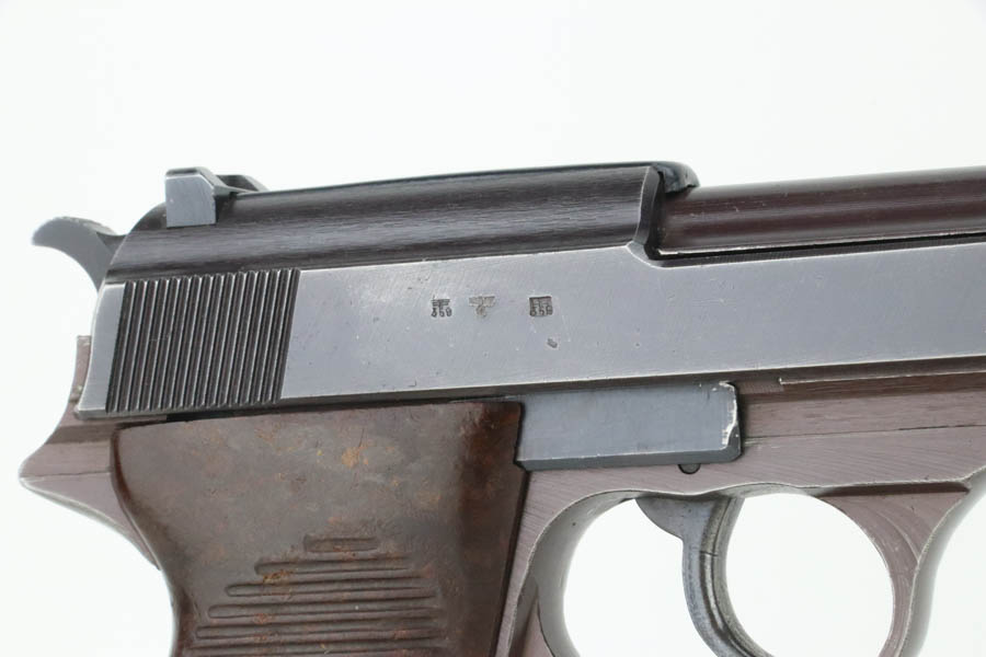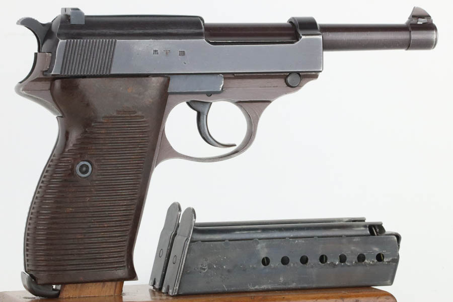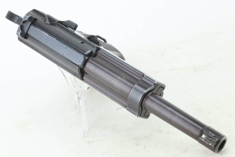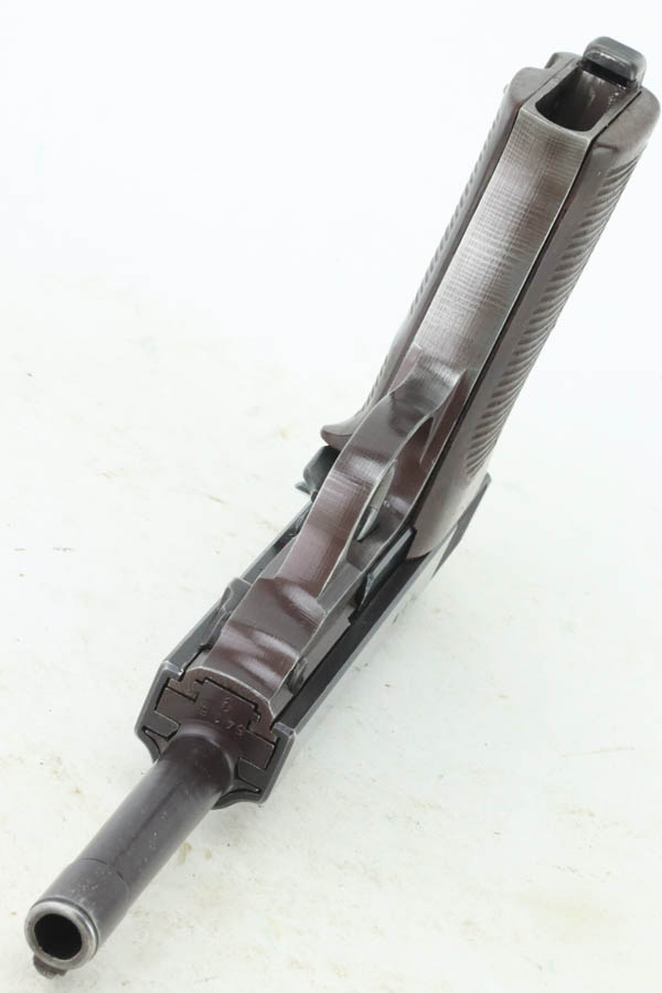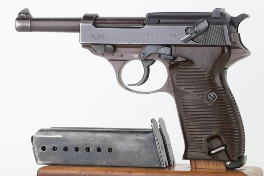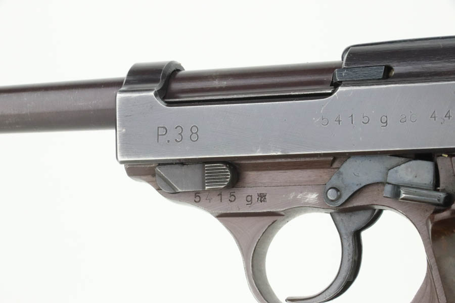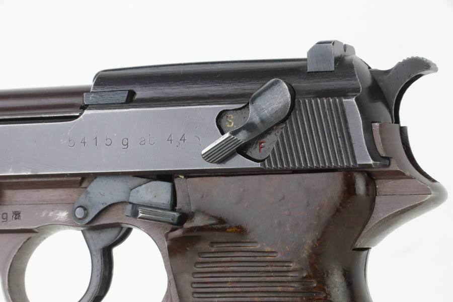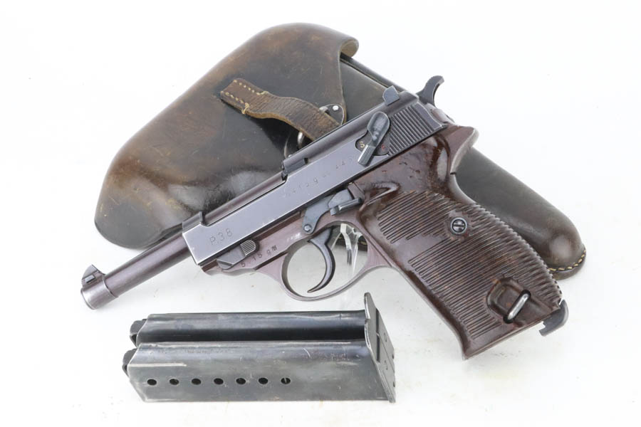 7/23/24 – This is a very nice example of an AC 44 Walther P.38 issued to the Nazi military in 1944. All matching with the proper “Eagle 359” military acceptance proofs. It comes as a rig with a very nice 1942-dated hard shell holster, one un-proofed jvd magazine, and one un-proofed P.38v magazine. The finish on the entire gun has a really nice plum-colored tint to it. The bluing rates about 93-94%. The majority of the wear is on the front strap, but there is also general high edge wear. Fitted with excellent period-correct reddish bakelite grips. Near-mint bore. De-cocker is functional.
