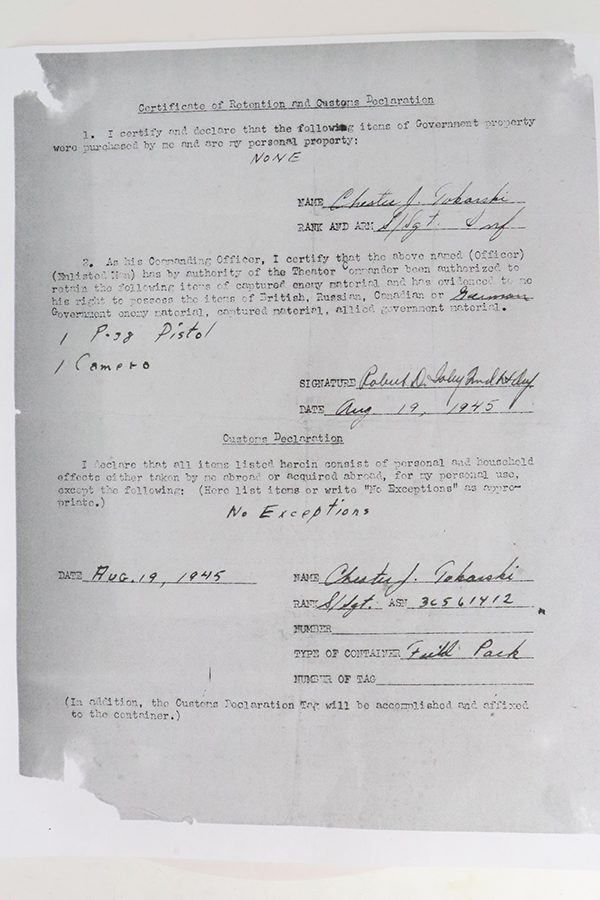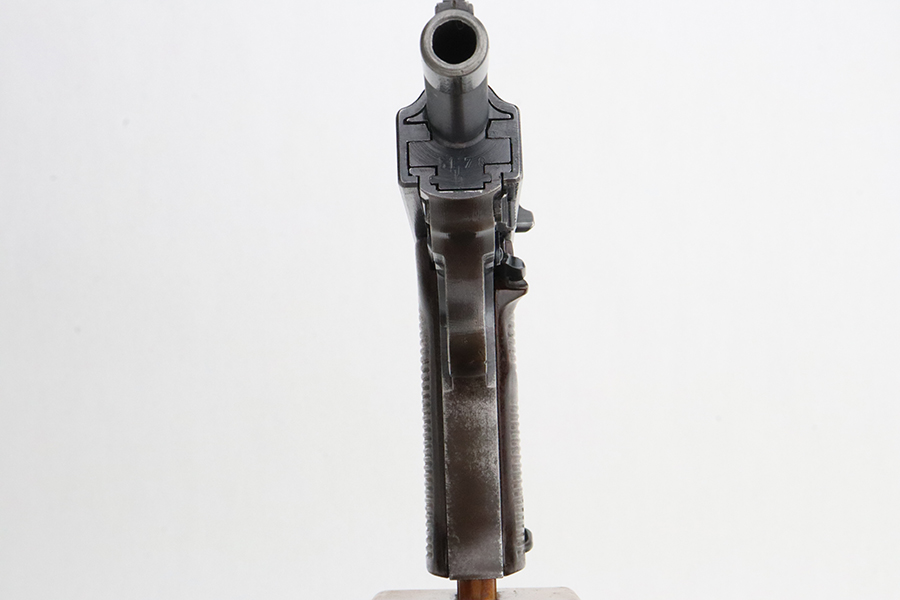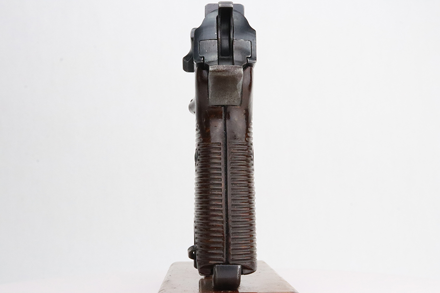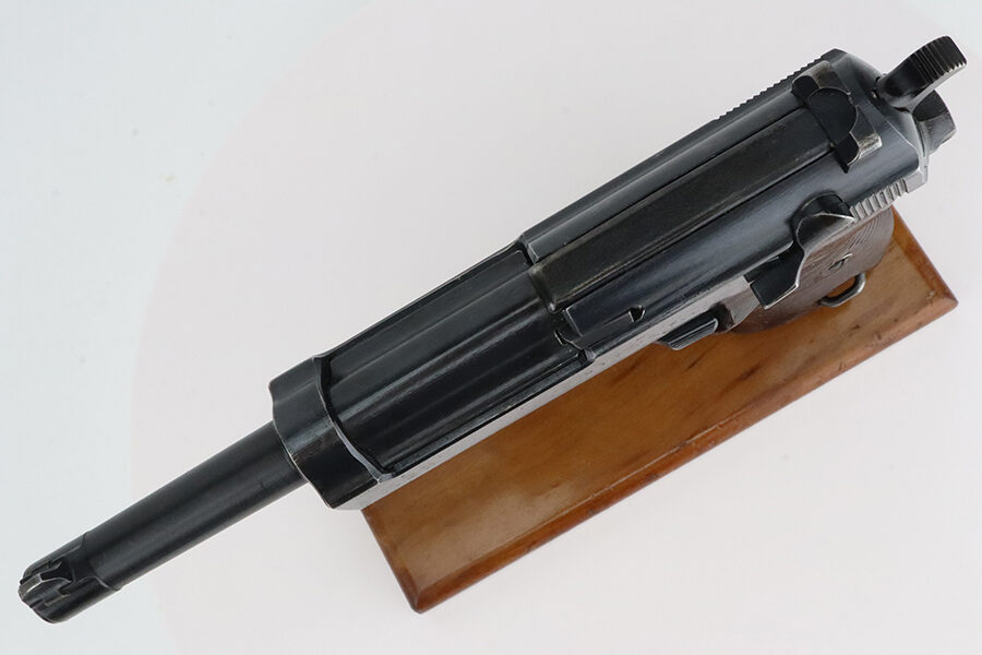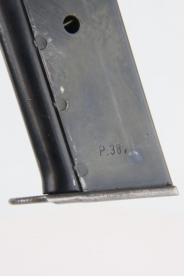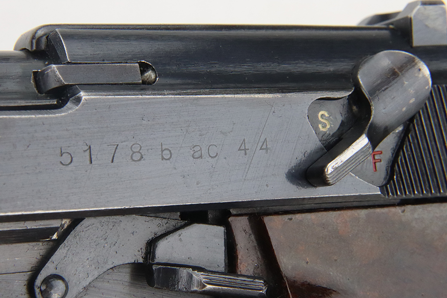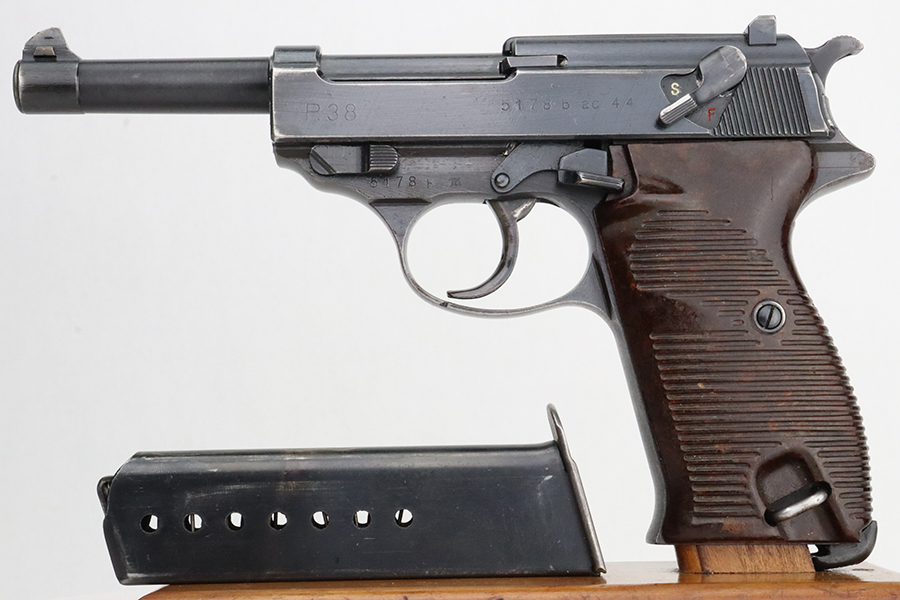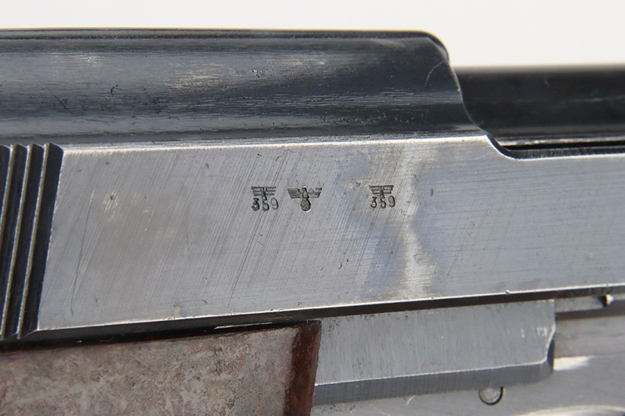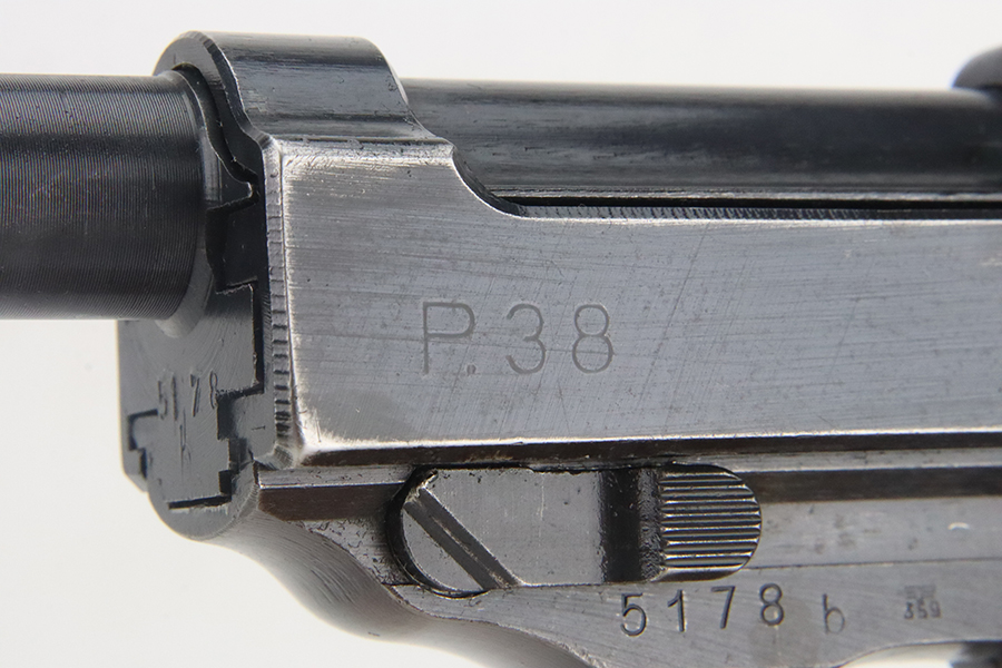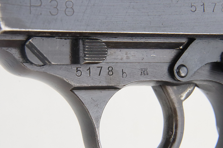 2/27/24 – This is a very nice example of an AC 44 Walther P.38 issued to the Nazi military in 1944. All matching with the proper “Eagle 359” military acceptance proofs. Its original finish rates about 90%. Virtually all of the wear is on the front strap, where there is also some oxidation. Fitted with period-correct reddish grips and comes with a P.38v magazine with no proofs. The bore is mostly shiny with strong rifling, but there are some areas of light freckling. De-cocker is functional. The gun comes with a photocopy of an original Customs Declaration form that lists a P.38 and a camera. However, there is no serial number listed, so we cannot connect this document to this particular pistol. They came together from the previous owner.