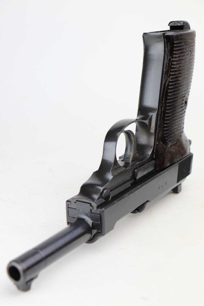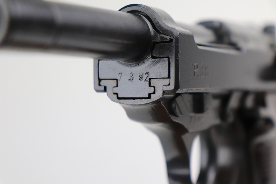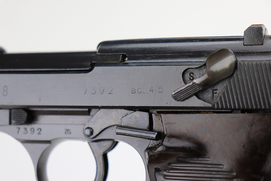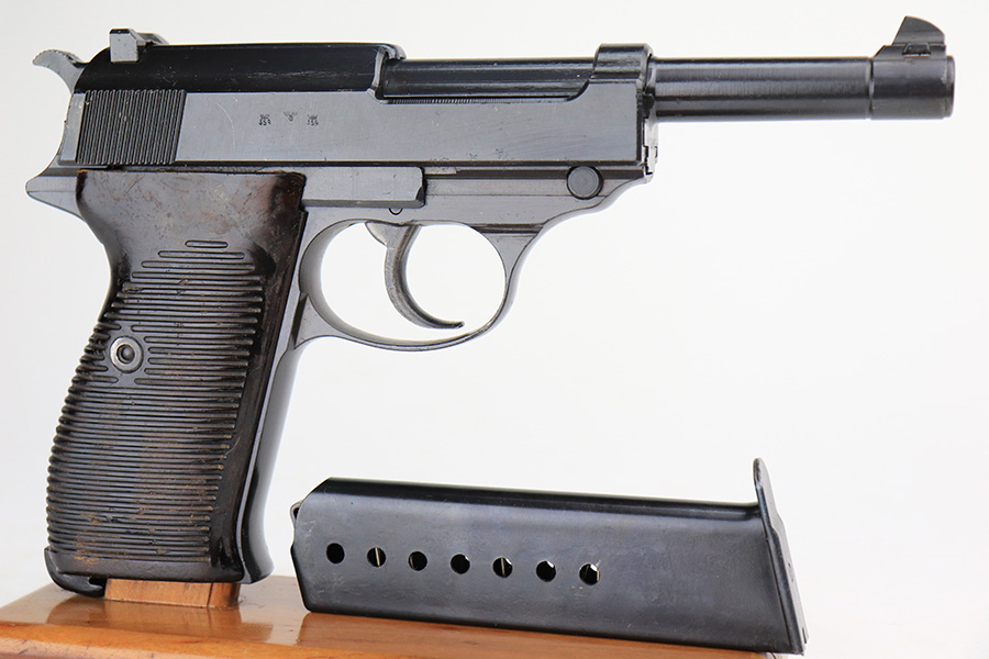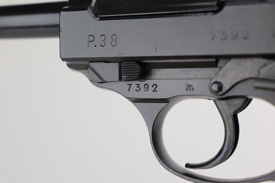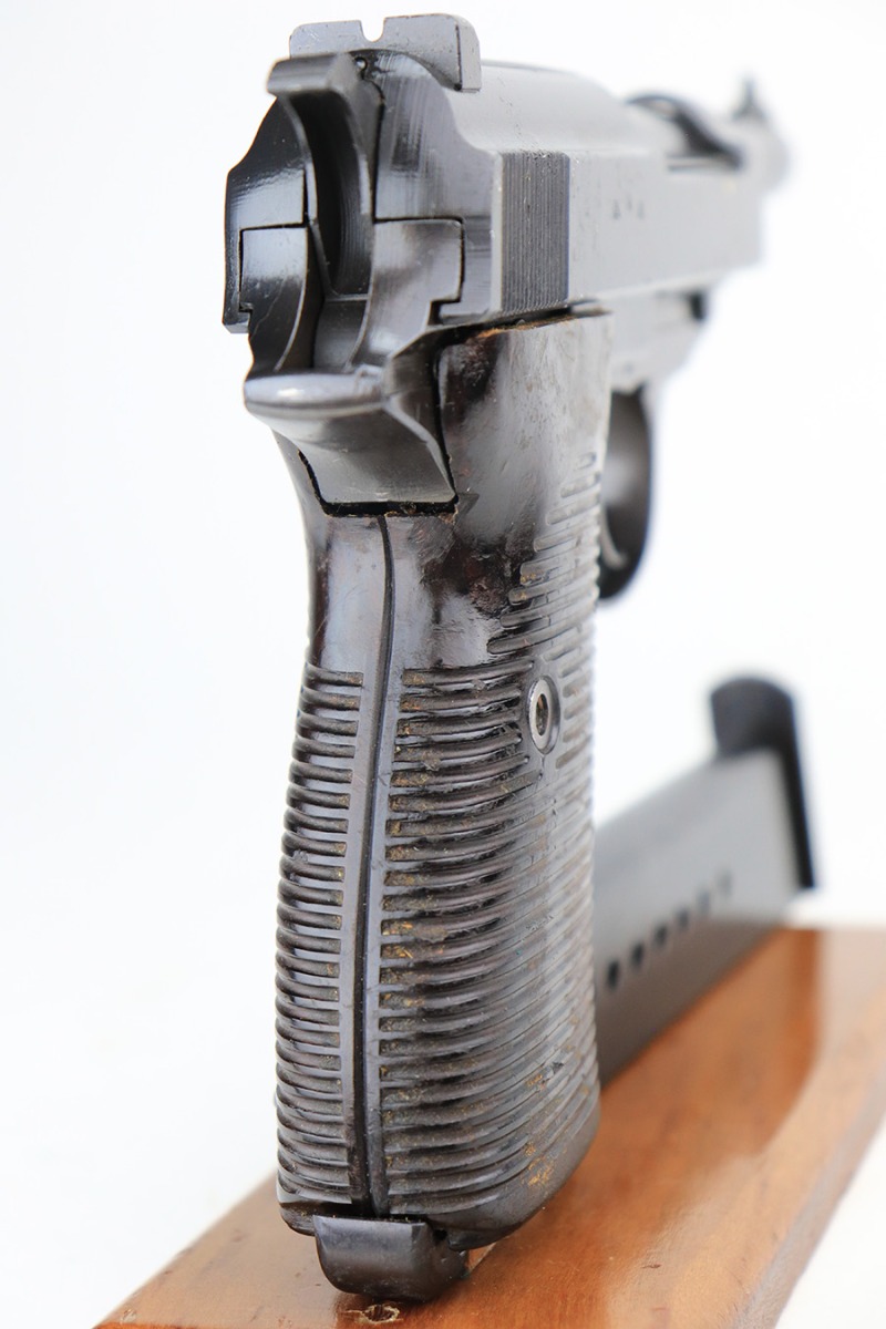 5/20/22 – This is an excellent example of an AC 45 Walther P.38 issued to the Nazi military in 1945. The gun is all matching and has the proper “Eagle 359” military acceptance proofs throughout. The gun has a dark finish, so we believe it has been “dipped”. In any case, it has retained virtually all of this finish with some very light scratches here and there on the slide and a few tiny pits under the bluing on the right side. Comes with nice bakelite grips that have been cut down and an “Eagle 359” proofed magazine. Minty bore. De-cocker is functional.