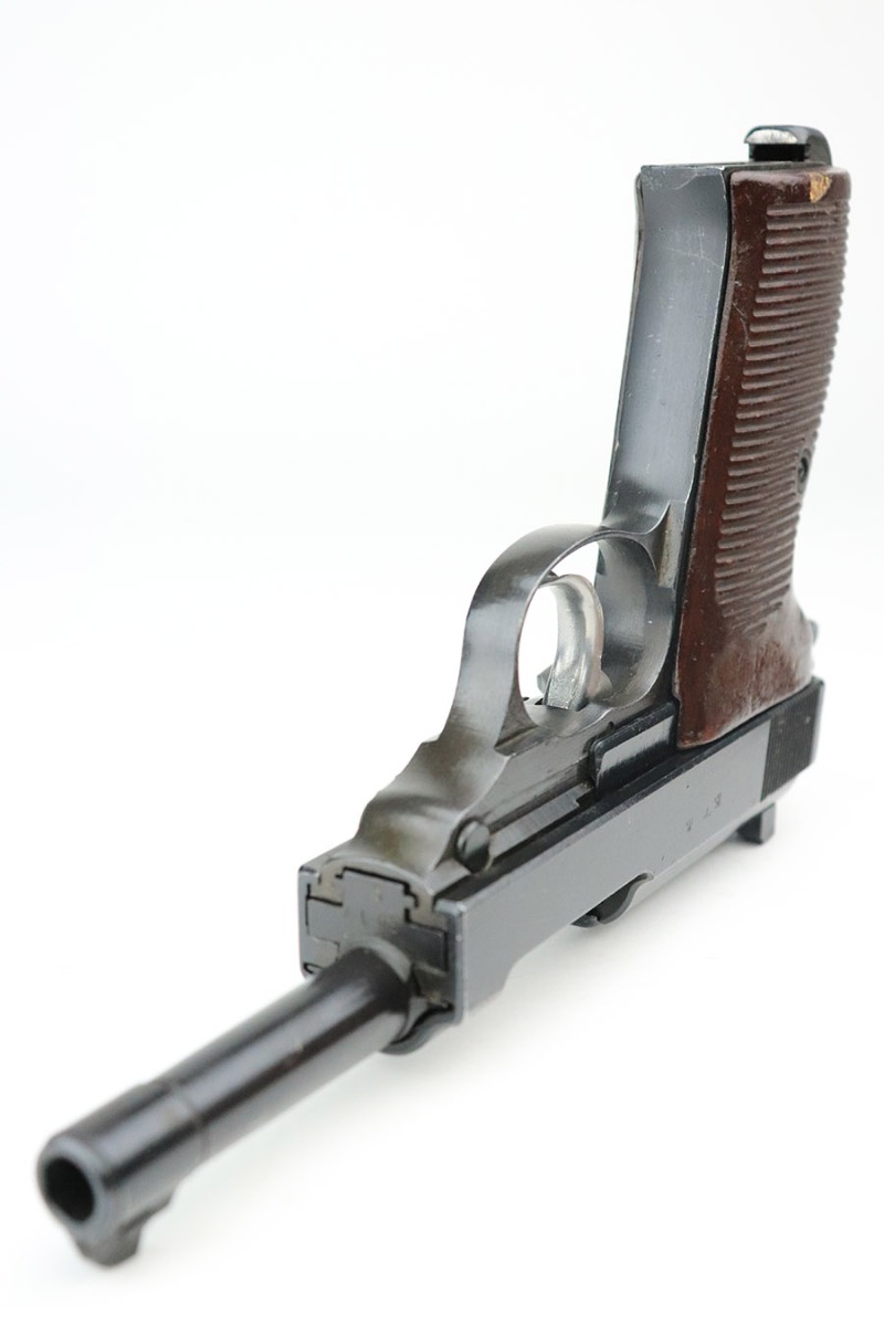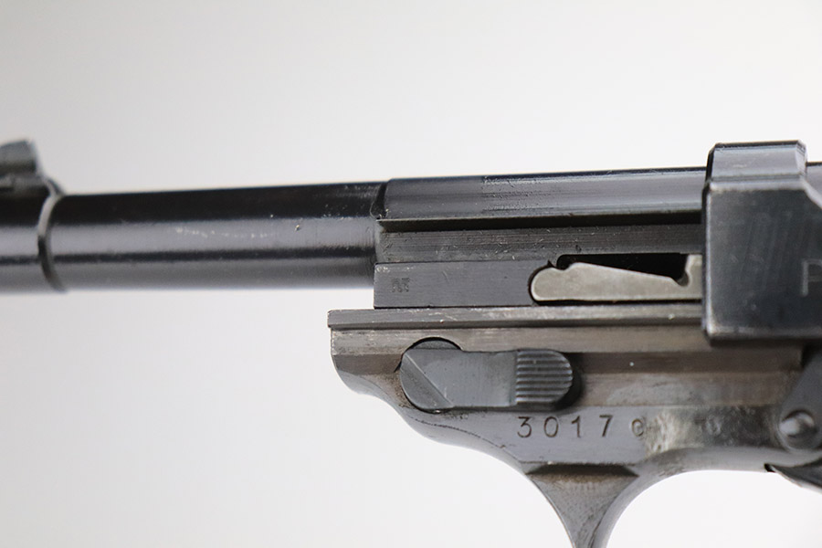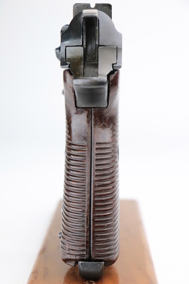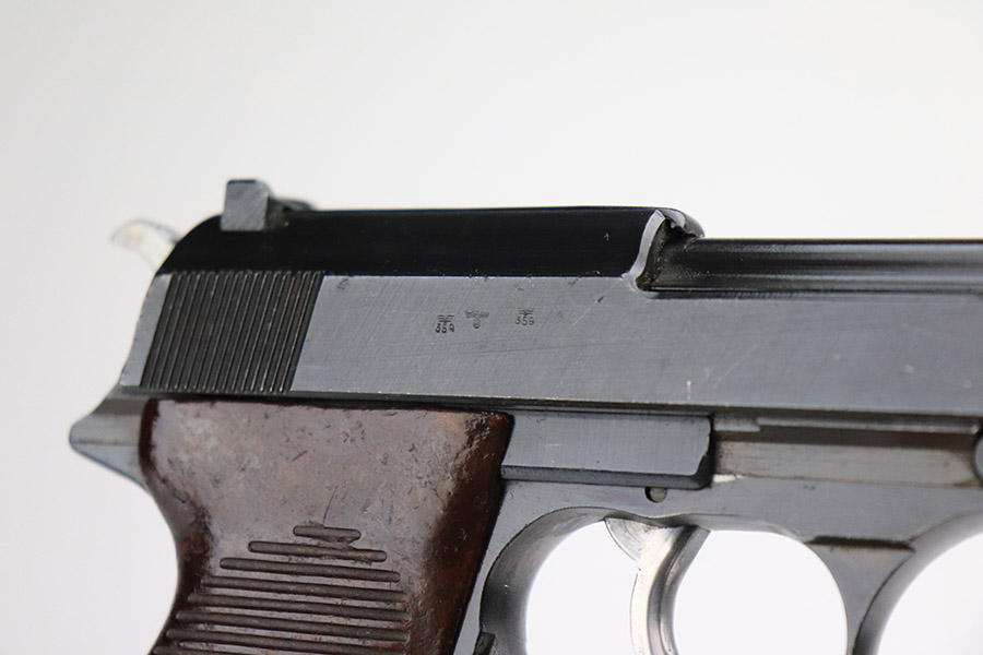 11/7/22 – This is a very nice example of a late-war AC 45 issued to the Nazi military in 1945. It is all matching and has the proper “Eagle 359” military acceptance proofs throughout. It looks like there may have been a marking on the left side of the frame that was peened. The hammer and trigger have been polished and have no finish. Given the gun’s dark finish, we believe it has been “Russian dipped”. Very little finish loss – just that tiny spot of wear on the left side of the frame, a few tiny handling marks on the right side of the barrel, and a few very light scratches on the right side of the slide. Comes with excellent reddish-brown bakelite grips and an “Eagle 135” Mauser magazine. Minty bore. De-cocker is functional.