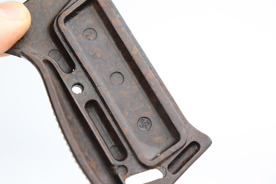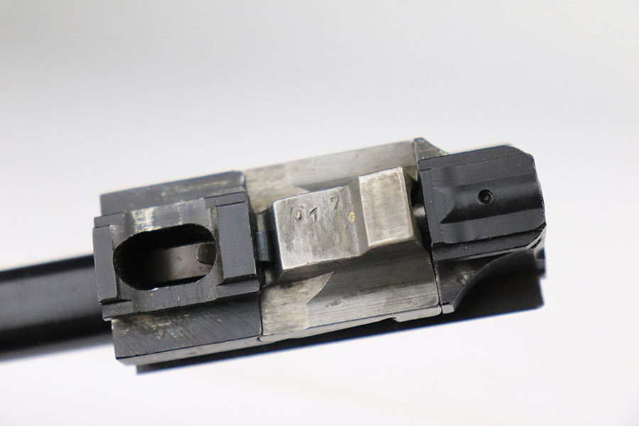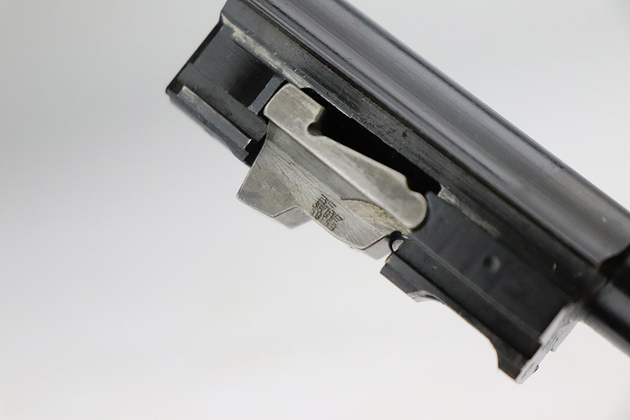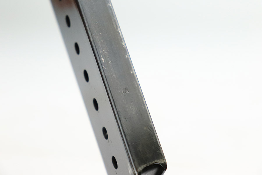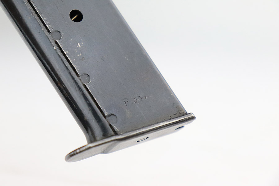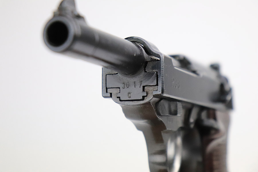 11/7/22 – This is a very nice example of a late-war AC 45 issued to the Nazi military in 1945. It is all matching and has the proper “Eagle 359” military acceptance proofs throughout. It looks like there may have been a marking on the left side of the frame that was peened. The hammer and trigger have been polished and have no finish. Given the gun’s dark finish, we believe it has been “Russian dipped”. Very little finish loss – just that tiny spot of wear on the left side of the frame, a few tiny handling marks on the right side of the barrel, and a few very light scratches on the right side of the slide. Comes with excellent reddish-brown bakelite grips and an “Eagle 135” Mauser magazine. Minty bore. De-cocker is functional.