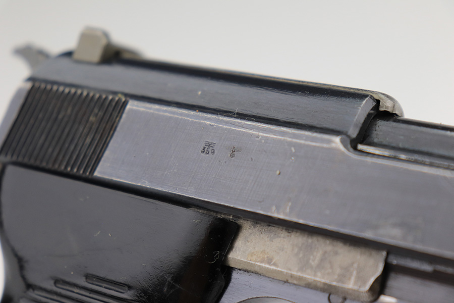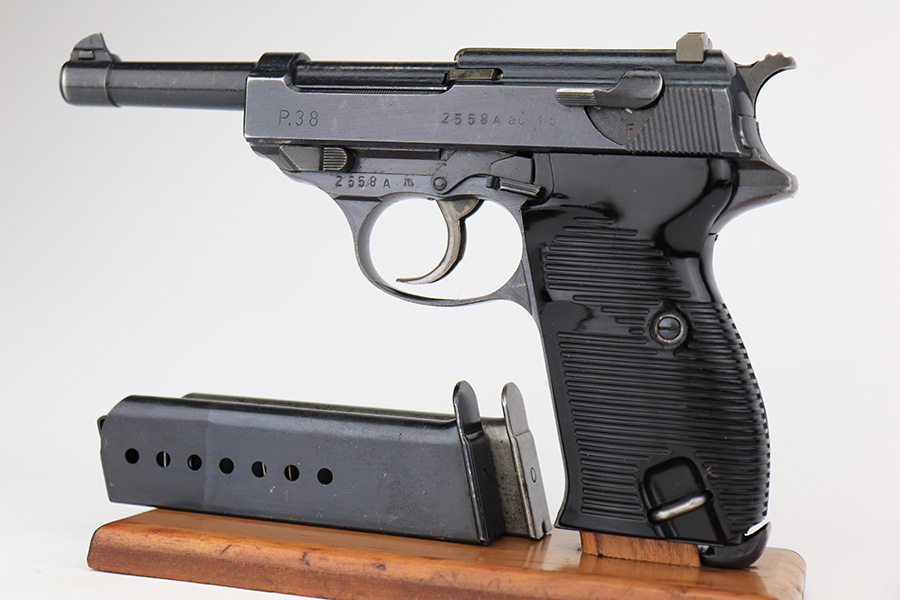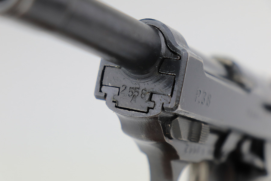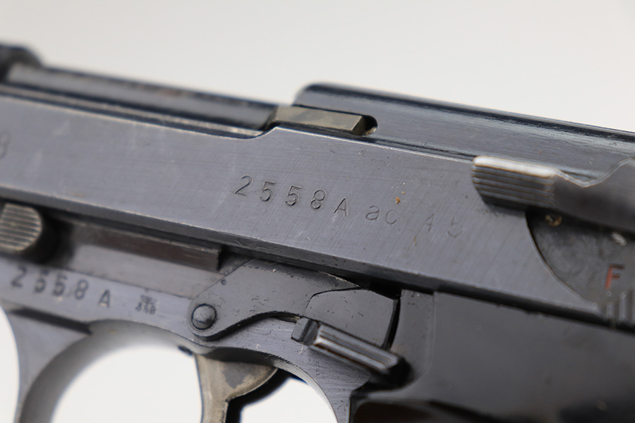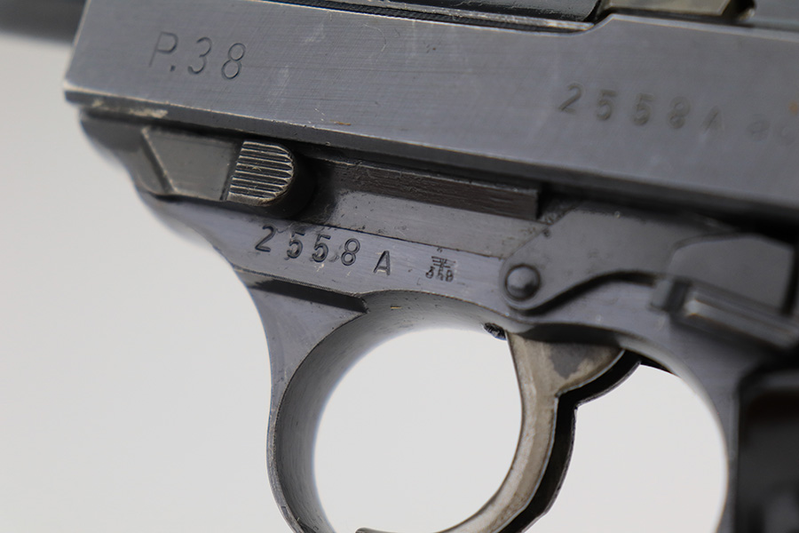 1/23/23 – This is a very nice example of a scarce AC 45 Walther P.38 issued to the Nazi military in 1945. What makes this one scarce is the capital “A” suffix in the serial numbers throughout. Only about 5,000 guns feature this oddity. It is believed that, for a short period of time in 1945, the lower case “a” die was broken or unavailable, so the Walther factory was forced to use the capital “A”. This one is all matching and has the proper “Eagle 359” military acceptance proofs throughout. It comes as a rig with a mint 1944-dated pebble grain holster, a scarce end-of-war “U” marked magazine, and an un-marked spare magazine. The gun itself has a mixture of phosphate and blued parts and a cog-style hammer (all correct for these end-of-war guns). It has retained about 90% of its original finish. The majority of the wear is on the front strap with some light wear on the top of the barrel through the ejection port. Fitted with nice black plastic grips. Mint bore. De-cocker is functional.