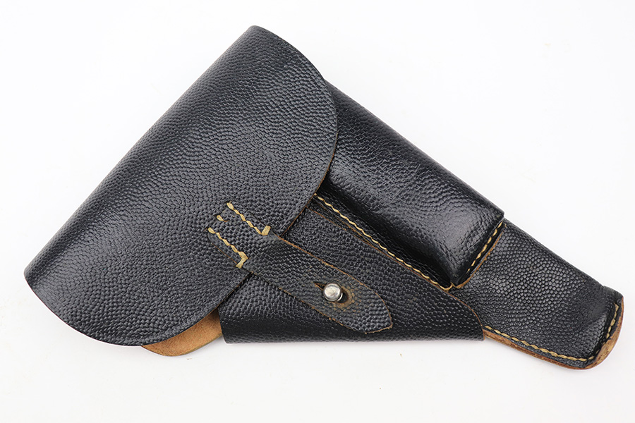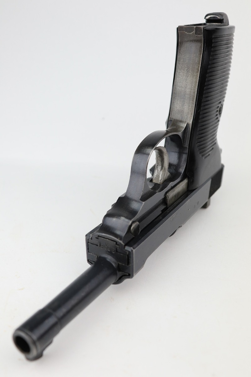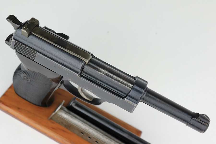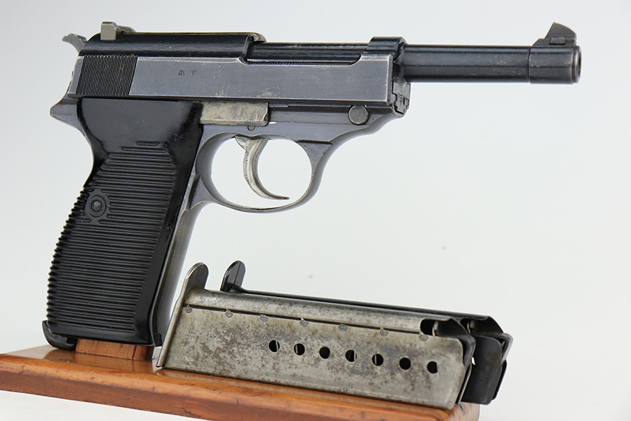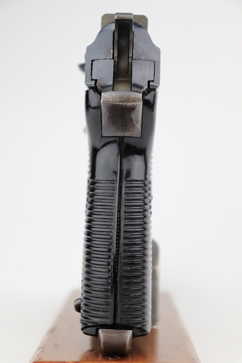 1/23/23 – This is a very nice example of a scarce AC 45 Walther P.38 issued to the Nazi military in 1945. What makes this one scarce is the capital “A” suffix in the serial numbers throughout. Only about 5,000 guns feature this oddity. It is believed that, for a short period of time in 1945, the lower case “a” die was broken or unavailable, so the Walther factory was forced to use the capital “A”. This one is all matching and has the proper “Eagle 359” military acceptance proofs throughout. It comes as a rig with a mint 1944-dated pebble grain holster, a scarce end-of-war “U” marked magazine, and an un-marked spare magazine. The gun itself has a mixture of phosphate and blued parts and a cog-style hammer (all correct for these end-of-war guns). It has retained about 90% of its original finish. The majority of the wear is on the front strap with some light wear on the top of the barrel through the ejection port. Fitted with nice black plastic grips. Mint bore. De-cocker is functional.