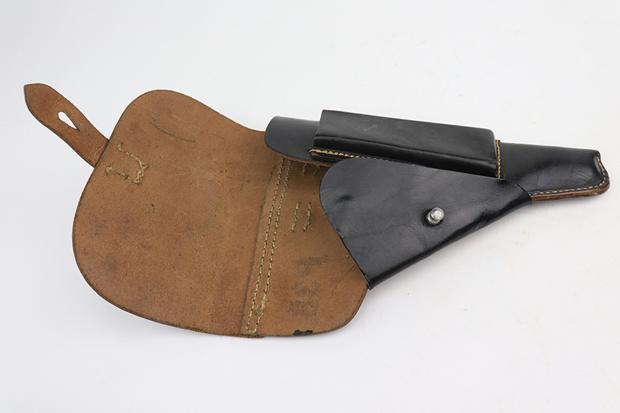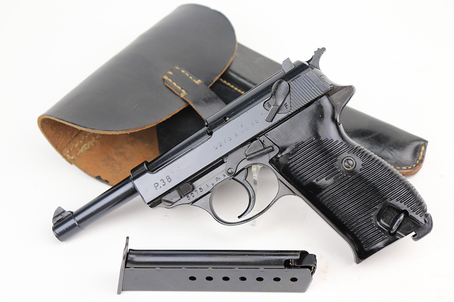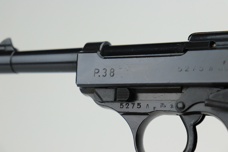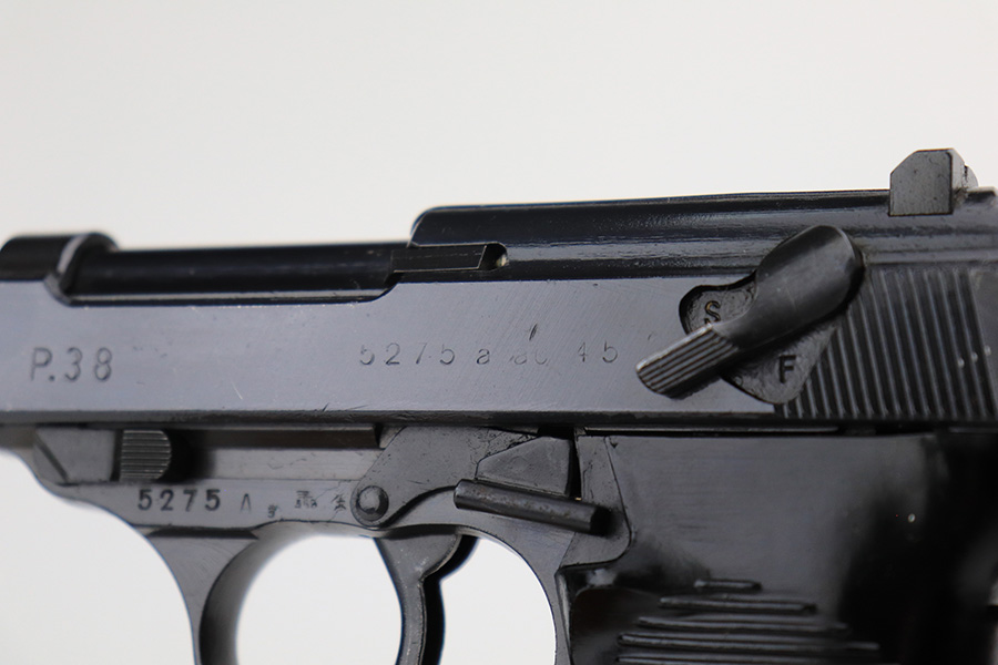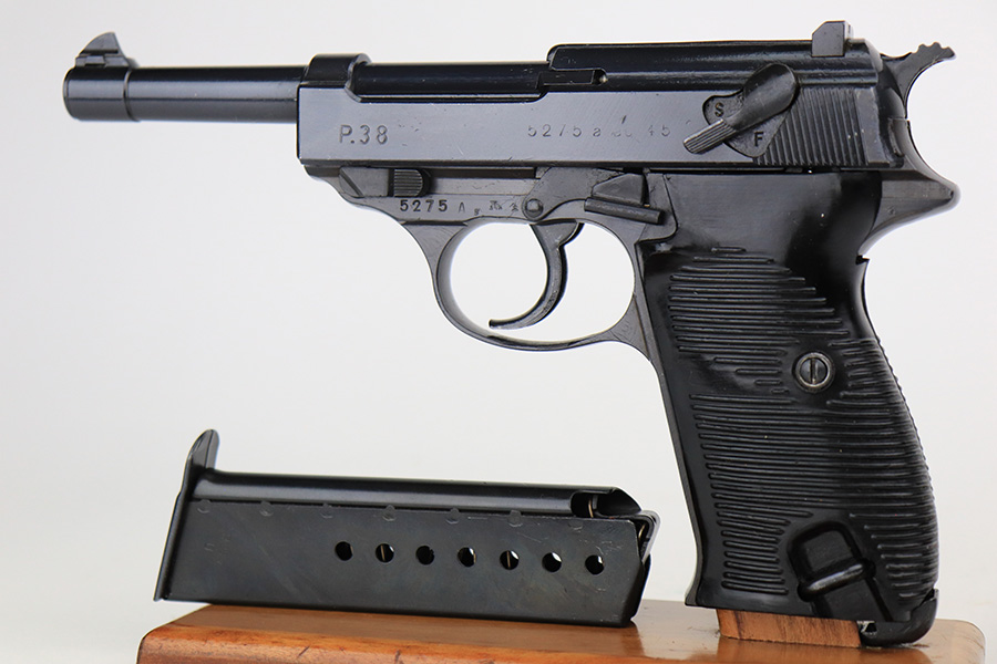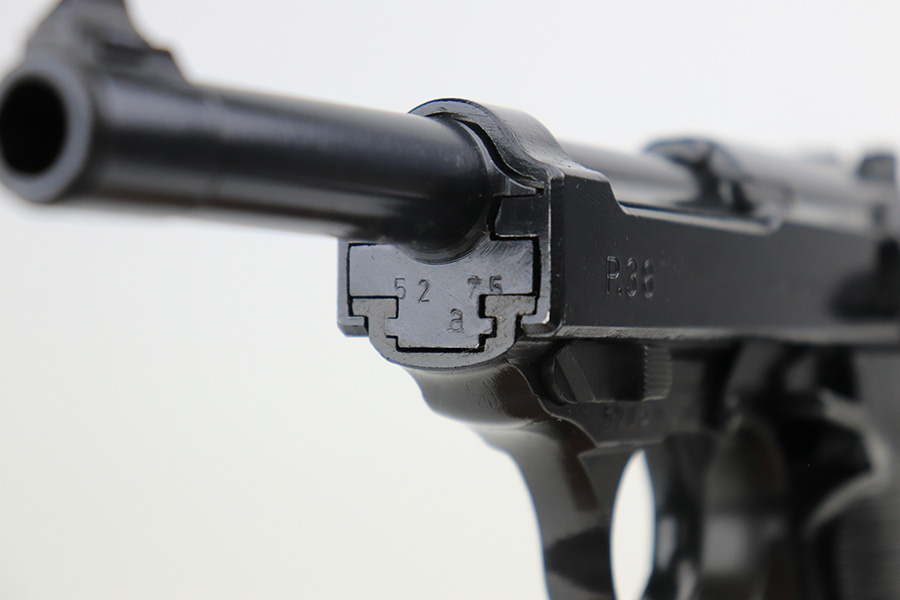 5/20/22 – This is an excellent example of an AC 45 Walther P.38 issued to the Nazi military in February of 1945. It’s a rare sub-variation with capital ‘A’ suffix in the serial on the frame. Only ~5,500 P.38s feature this odd design change. This one is all matching and has the proper “Eagle 359” military acceptance proofs throughout. It comes as a rig with a softshell police holster (un-issued condition) and a rare late-war “U” marked magazine. The entire gun has a dark, almost black finish, so we believe it has been “dipped”. It has retained virtually all of this finish with tiny handling marks under the finish on both sides of the slide. Comes with nice black bakelite grips that appear to have been cut down. Very nice bore with strong rifling. De-cocker is functional.