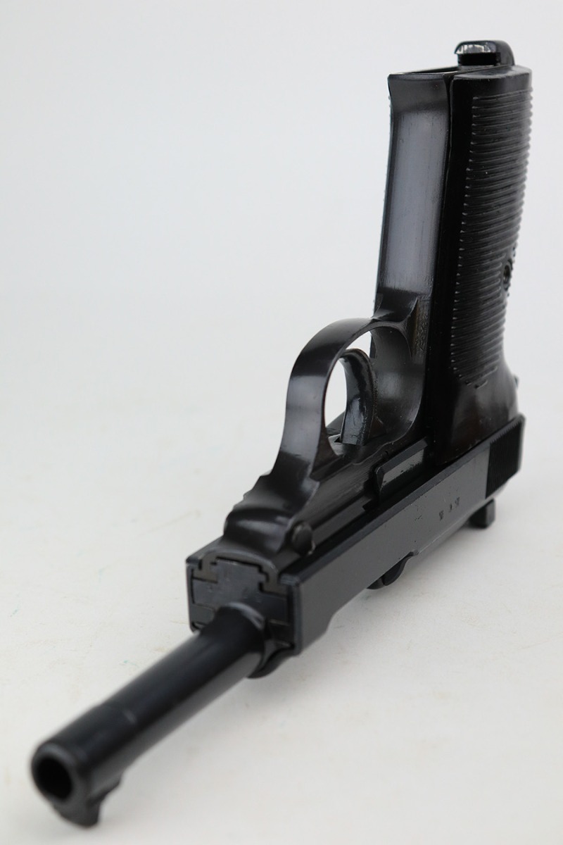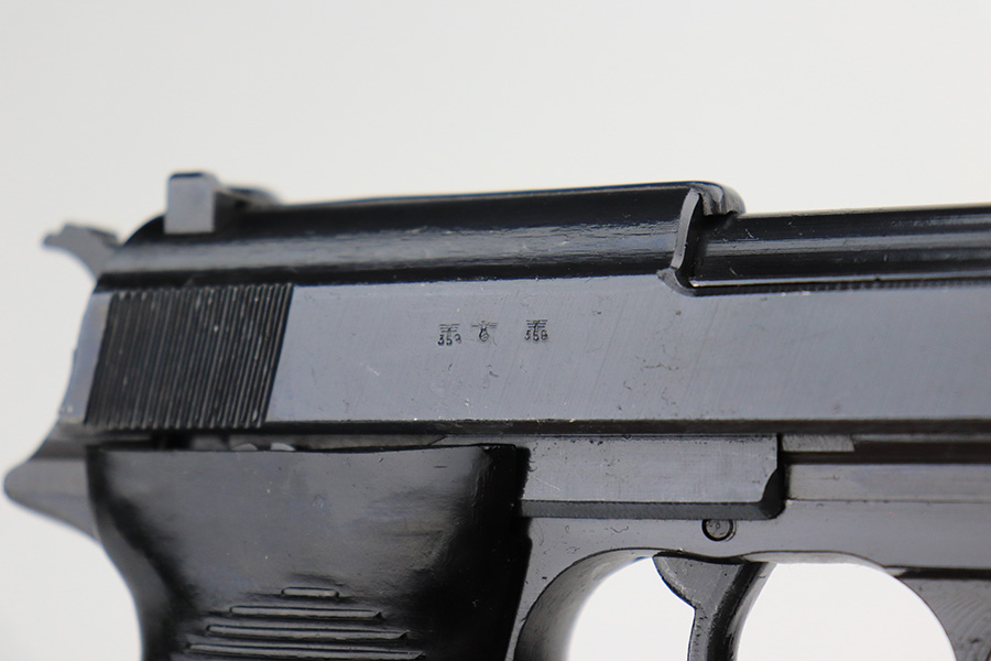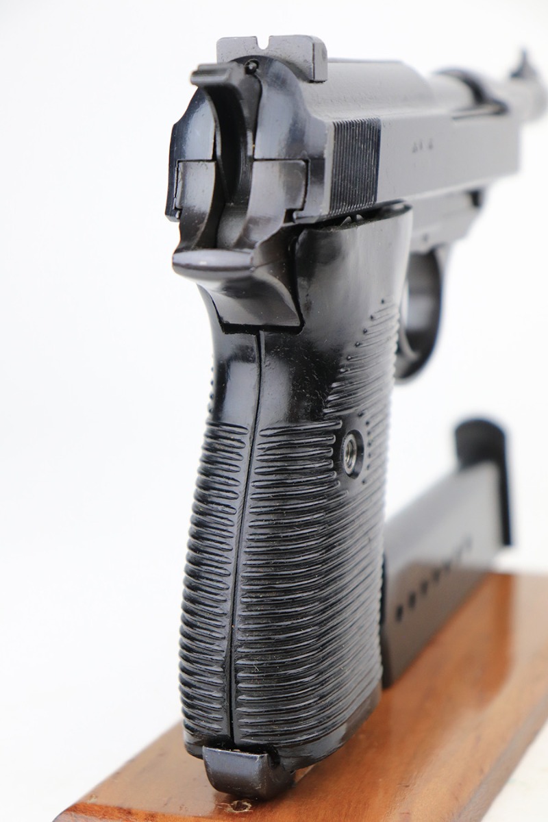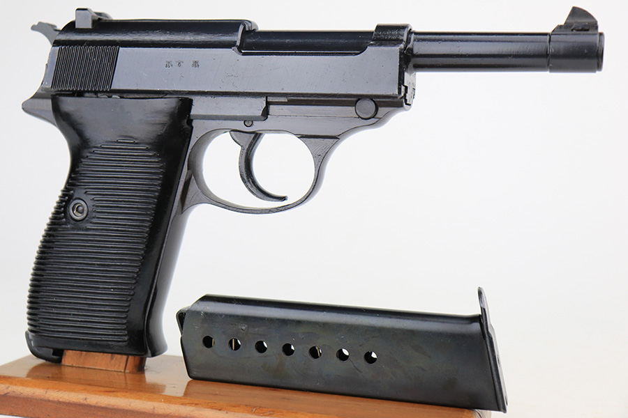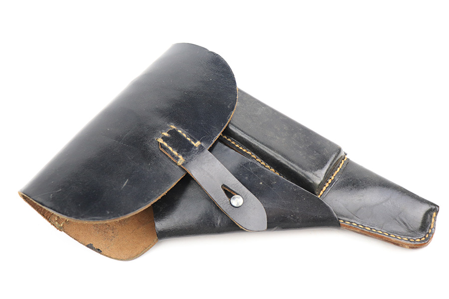 5/20/22 – This is an excellent example of an AC 45 Walther P.38 issued to the Nazi military in February of 1945. It’s a rare sub-variation with capital ‘A’ suffix in the serial on the frame. Only ~5,500 P.38s feature this odd design change. This one is all matching and has the proper “Eagle 359” military acceptance proofs throughout. It comes as a rig with a softshell police holster (un-issued condition) and a rare late-war “U” marked magazine. The entire gun has a dark, almost black finish, so we believe it has been “dipped”. It has retained virtually all of this finish with tiny handling marks under the finish on both sides of the slide. Comes with nice black bakelite grips that appear to have been cut down. Very nice bore with strong rifling. De-cocker is functional.