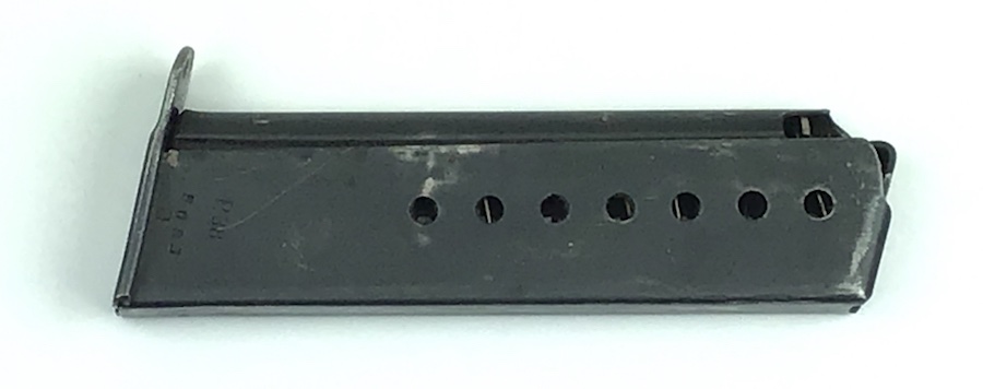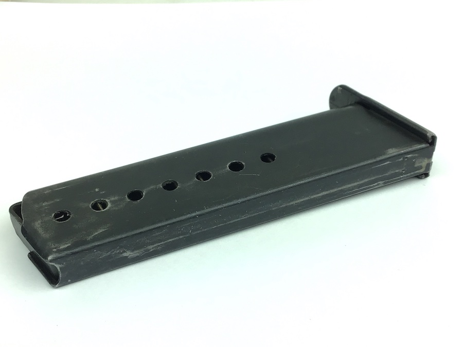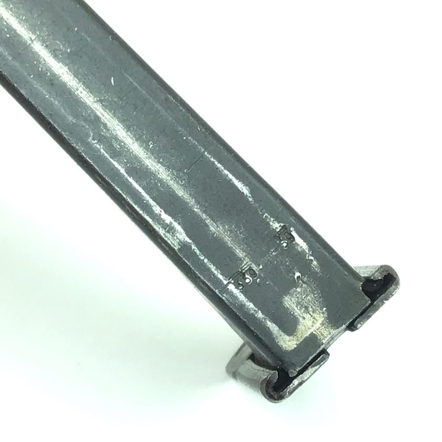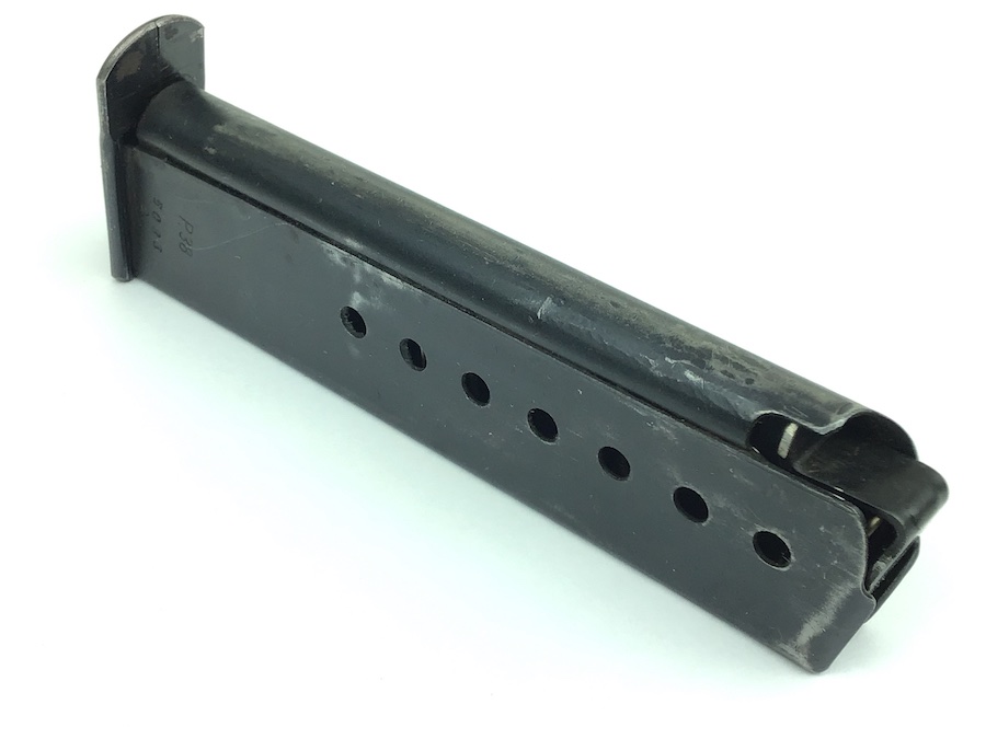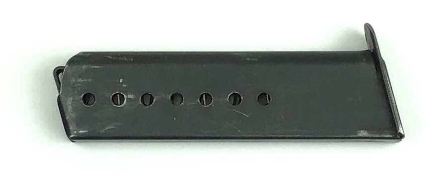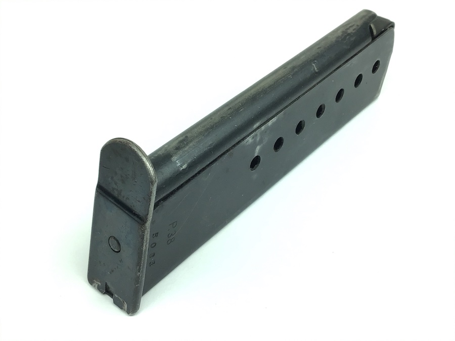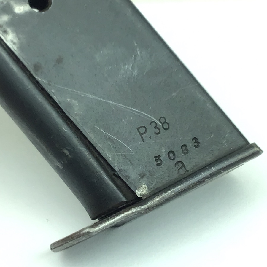 4/14/20 – Original, and excellent condition Walther P.38, early magazine for an ac 40 added pistol. Stamped on the left side with “P.38” and Serial # “5083 a”. Stamped on the lower spine with double “Eagle 359” All internal parts also stamped “Eagle 359”. This is correct for an AC 40 serial numbered 4400a-5400a. Nice, strong spring. Minimal surface wear.