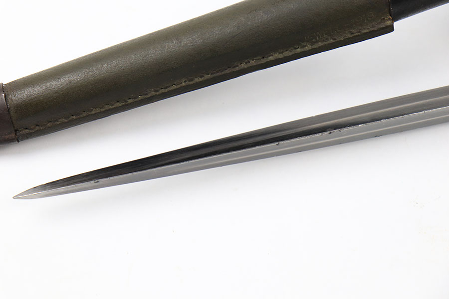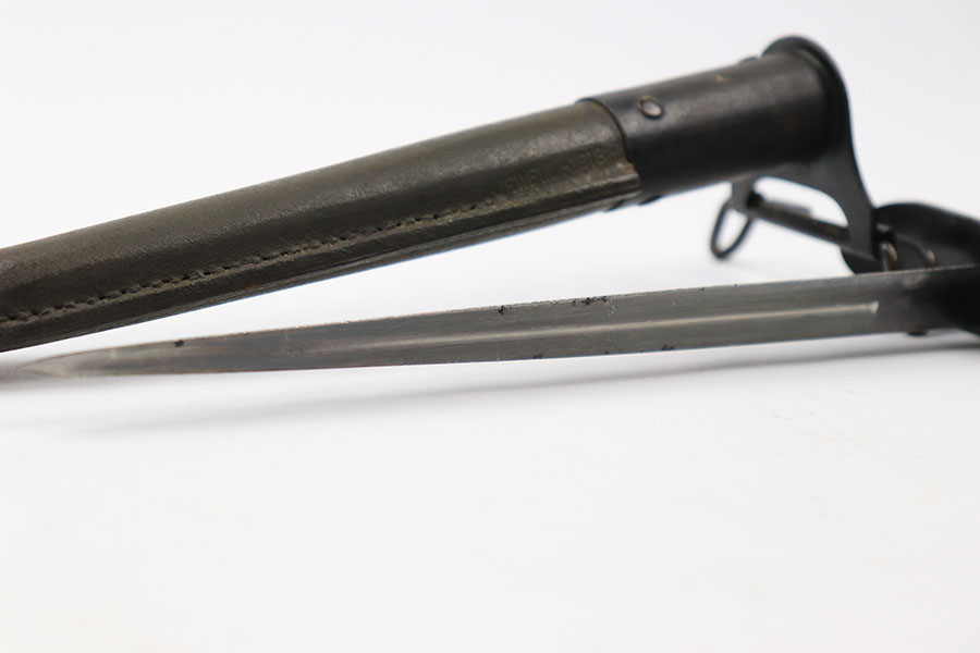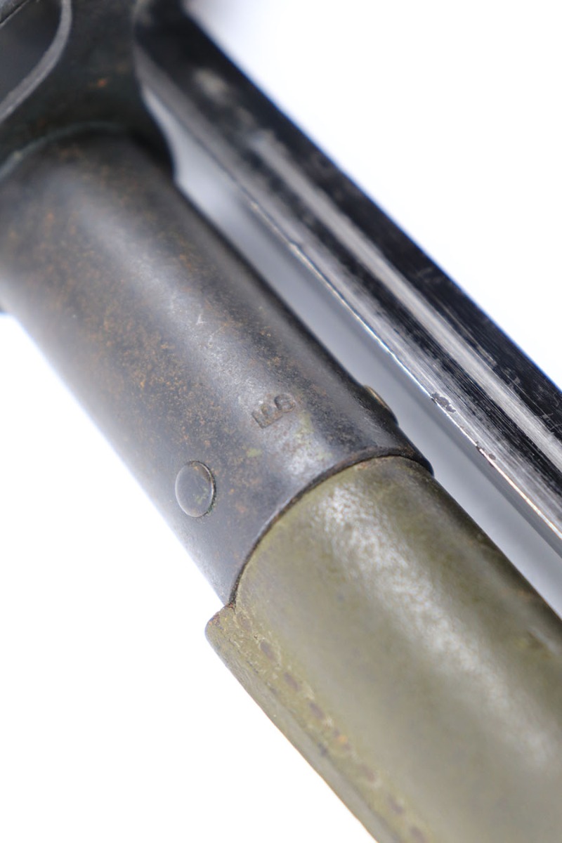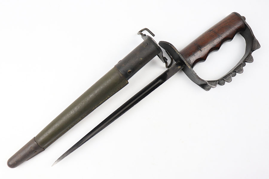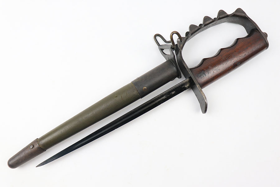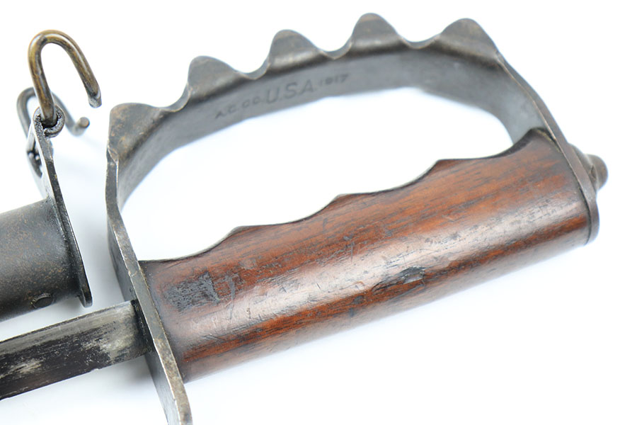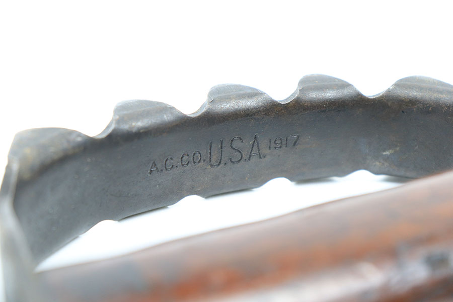 8/16/21 – This is an original WW1 US Trench Fighting Knife. The knife is the more scarce variation by AC Co and raised outer edges of the hand guard. The wood handle is in great condition, as is the blade which still has some of the original finish in tact. The scabbard is original as well with a crisp maker stamp and date. The toe or tip of the scabbard is missing one of the pins, but this is a minor flaw on an otherwise great piece from WW1.