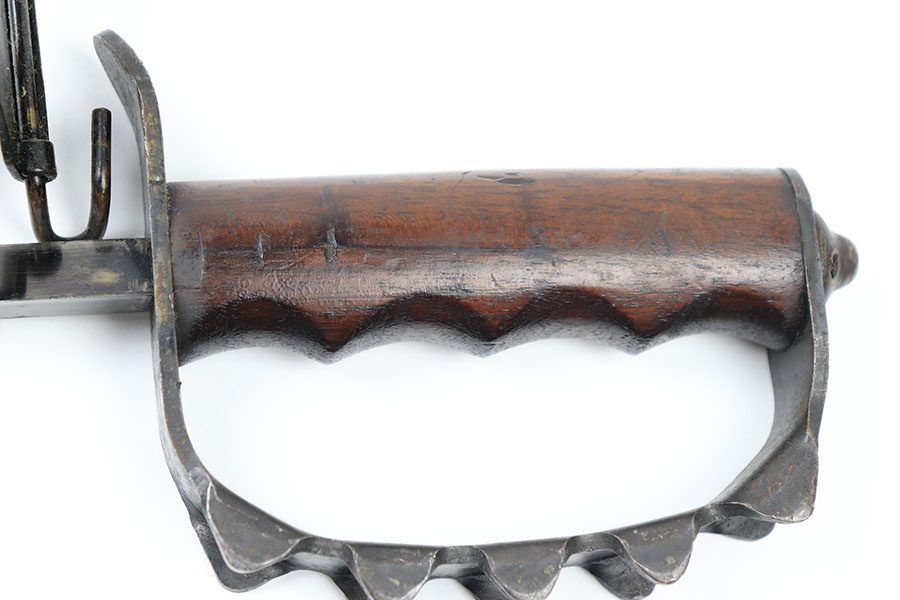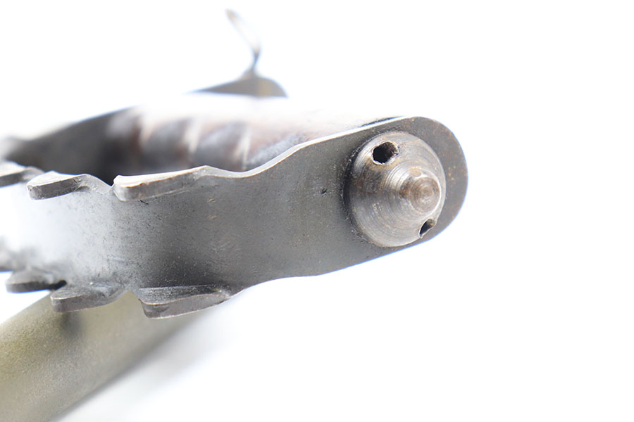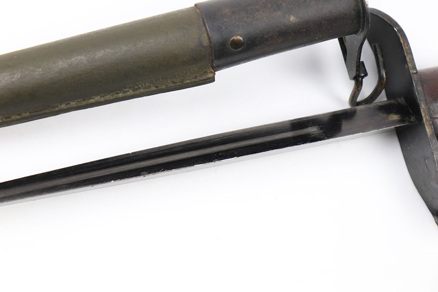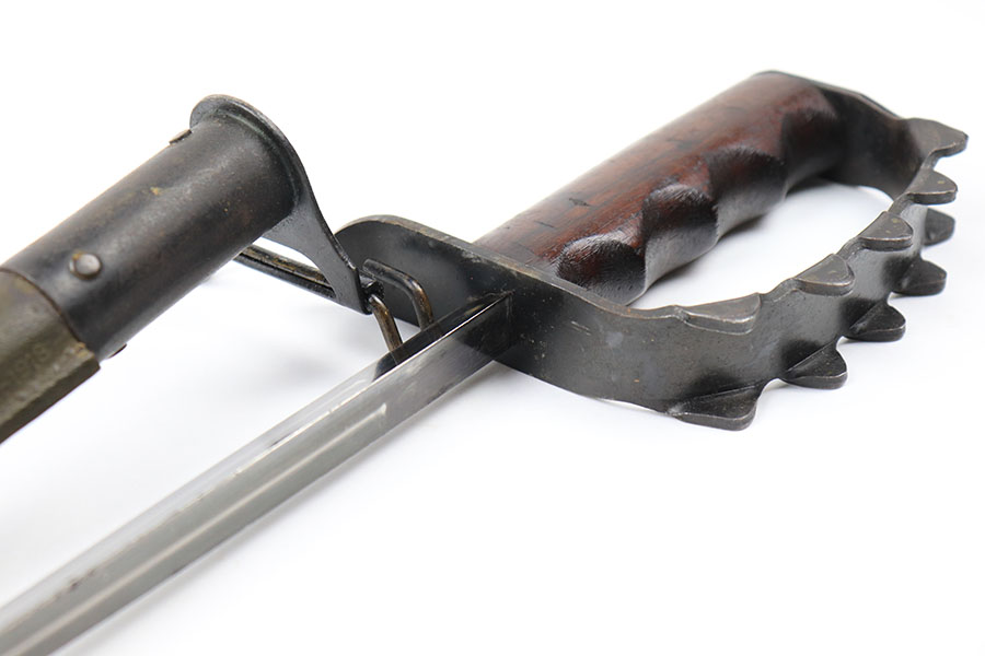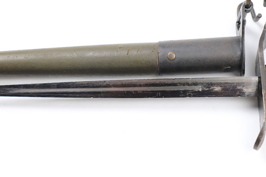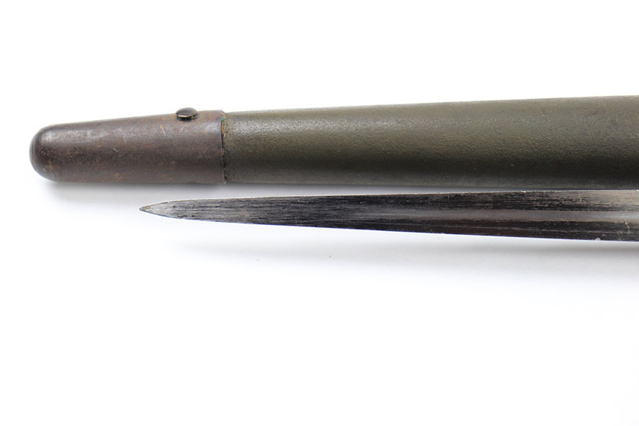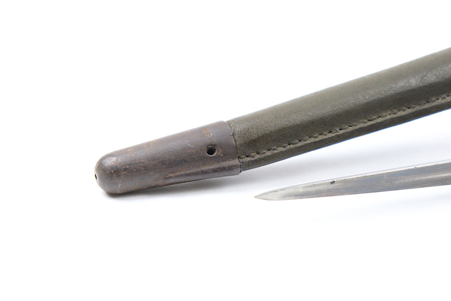8/16/21 – This is an original WW1 US Trench Fighting Knife. The knife is the more scarce variation by AC Co and raised outer edges of the hand guard. The wood handle is in great condition, as is the blade which still has some of the original finish in tact. The scabbard is original as well with a crisp maker stamp and date. The toe or tip of the scabbard is missing one of the pins, but this is a minor flaw on an otherwise great piece from WW1.