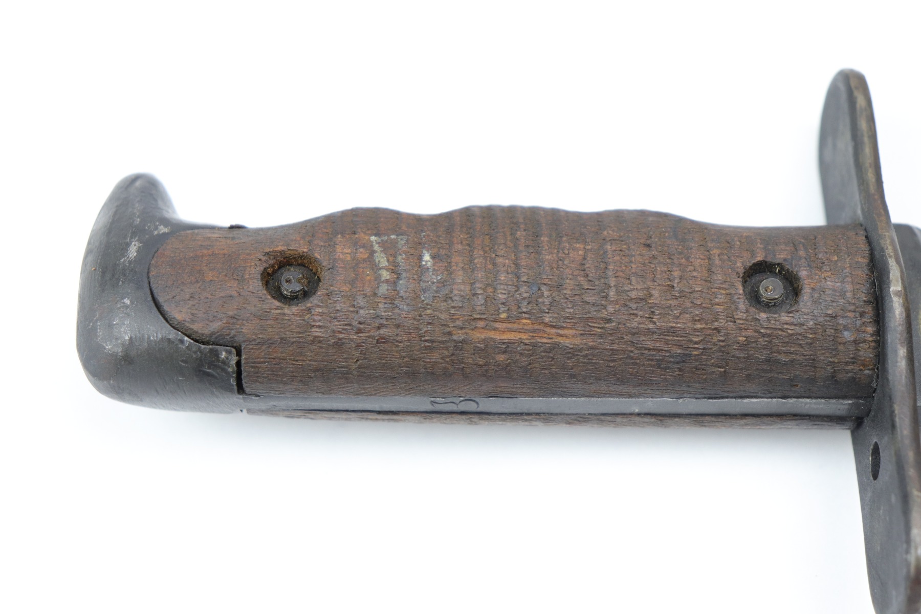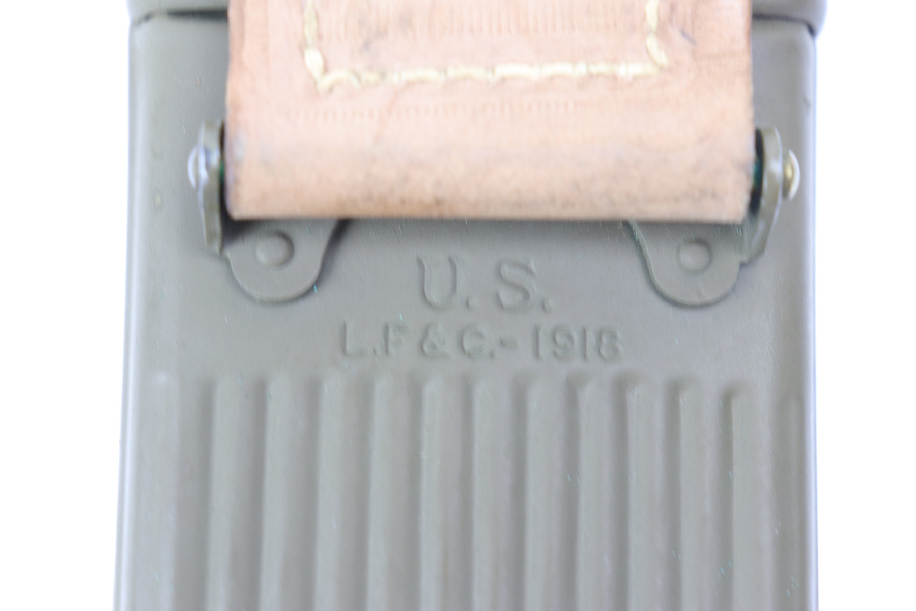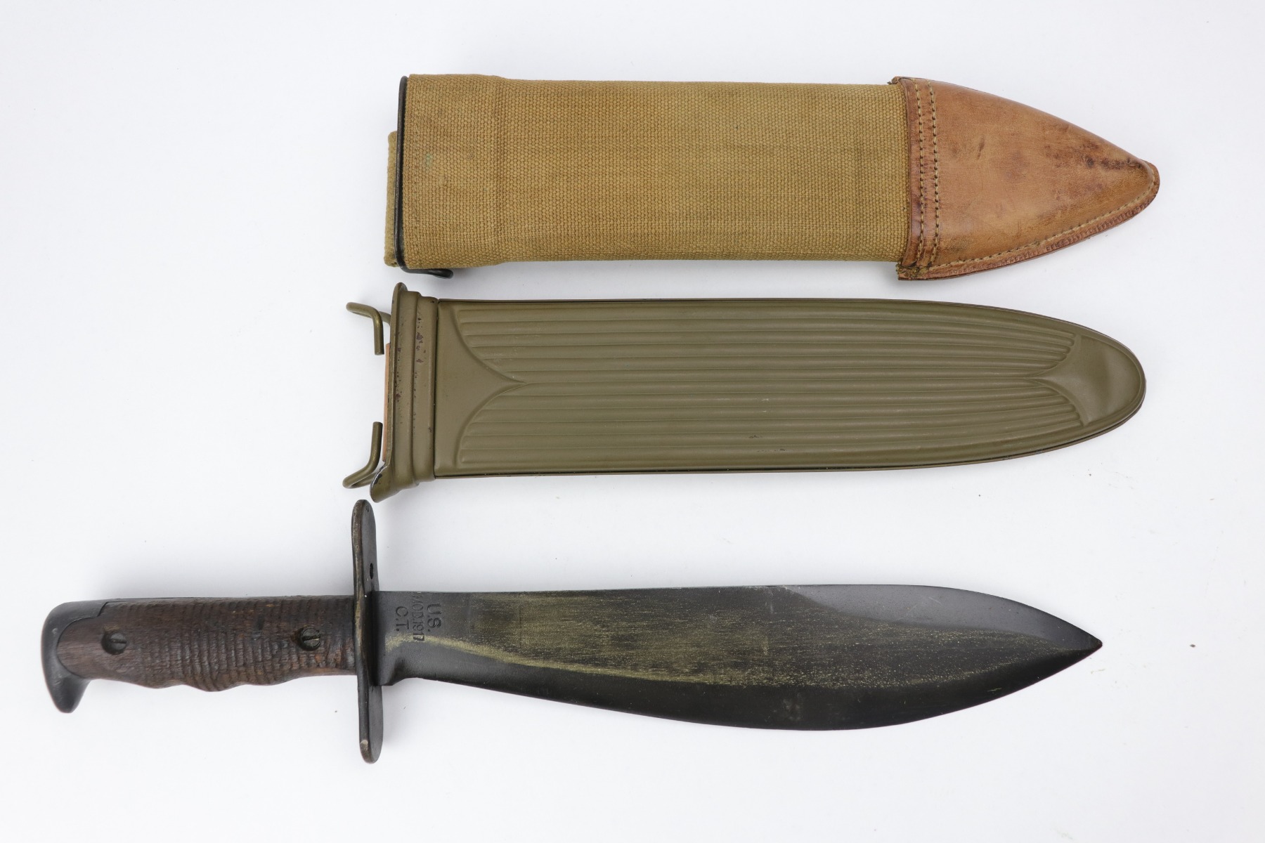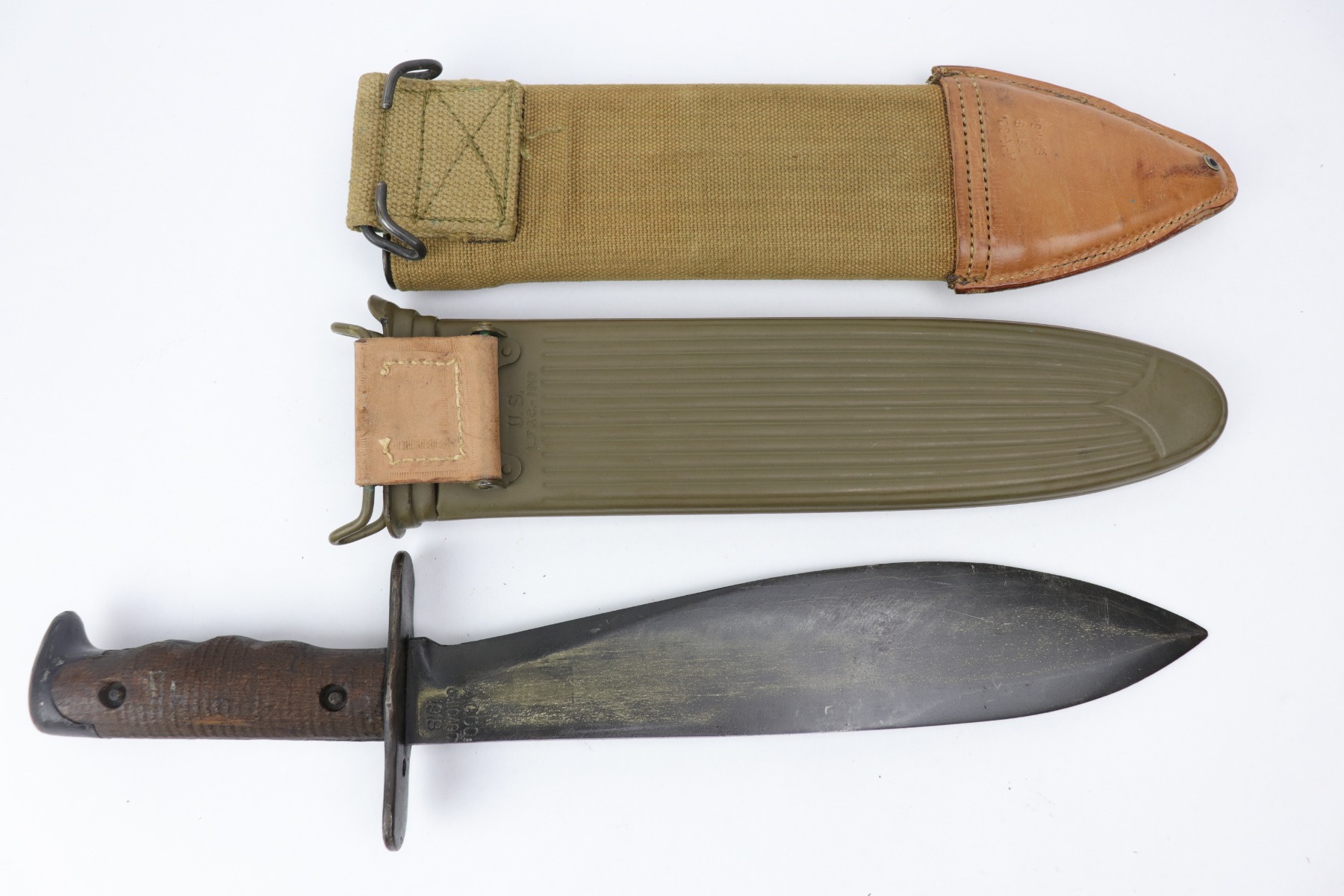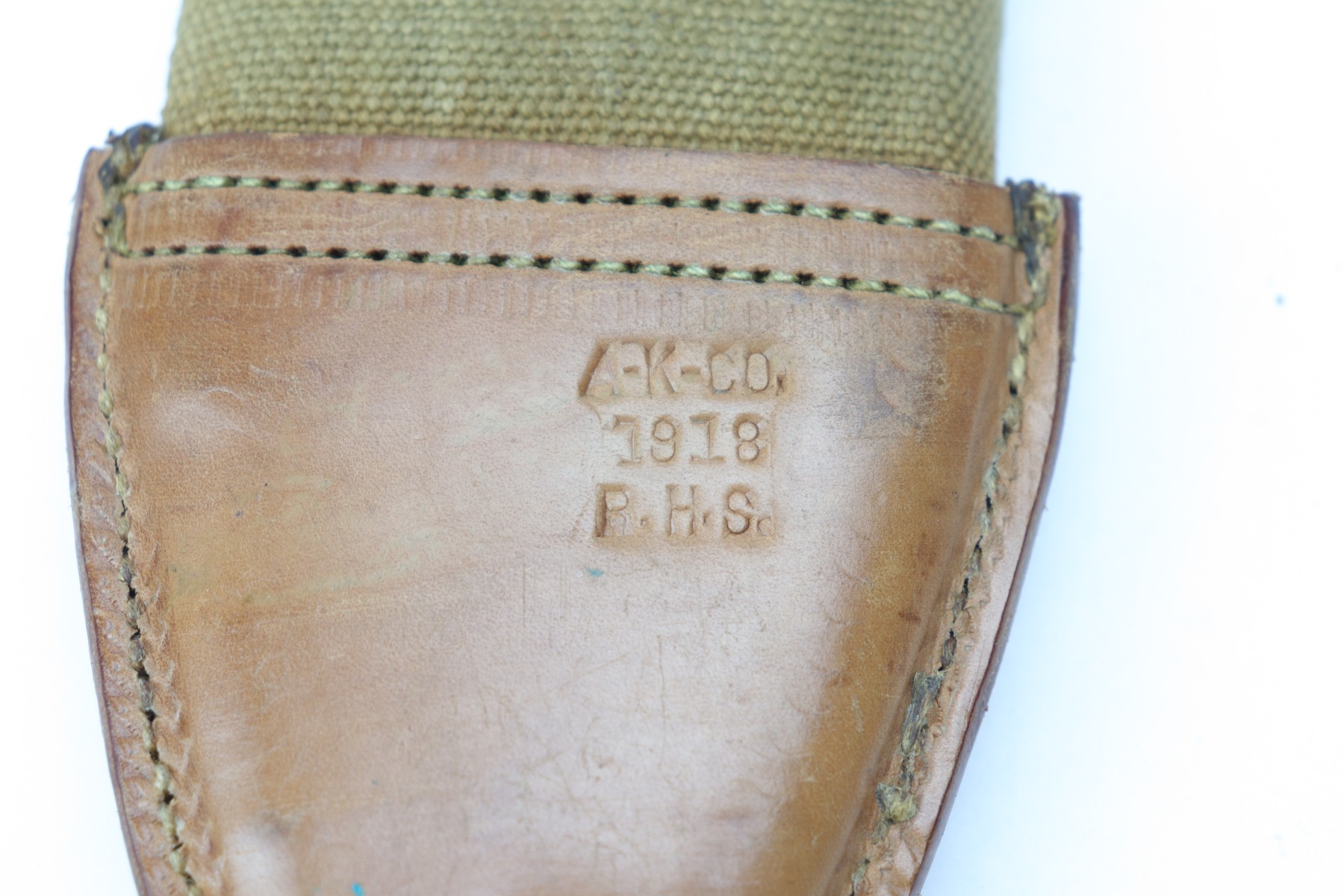 9/15/20 – This is a Model 1917 C.T. Bolo knife manufactured by American Cutlery Company of Chicago, Illinois. This model was a moderate simplification of the earlier 1910 Bolo made by Springfield Armory. The main difference is the lack of the catch mechanism on the scabbard and grip. The blade is marked AC.CO 1918 CHICAGO / U.S. MODEL 1917. This unique piece comes with a mint canvas sheath and a scarce metal scabbard. The canvas sheath is reinforced with leather and stamped A-K-CO. 1918 R.H.S. ( who was the inspector). The metal scabbard is stamped U.S. L.F. & C. – 1918. The blade shows some sign of sheath/scabbard wear but is in overall excellent condition- a very fine addition to any military knife collection.