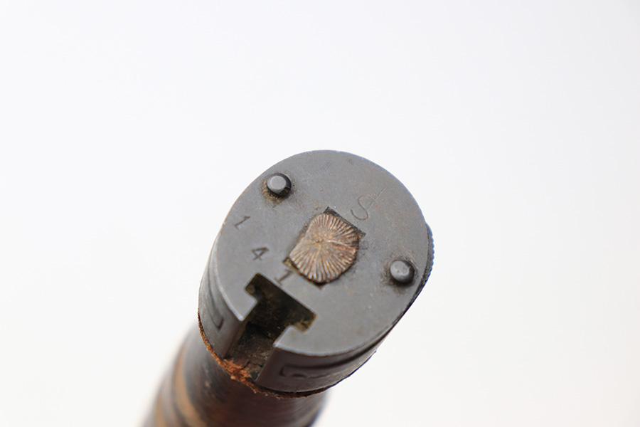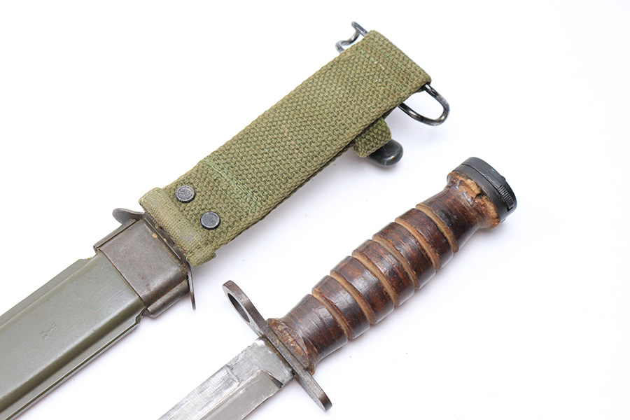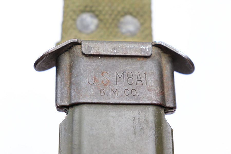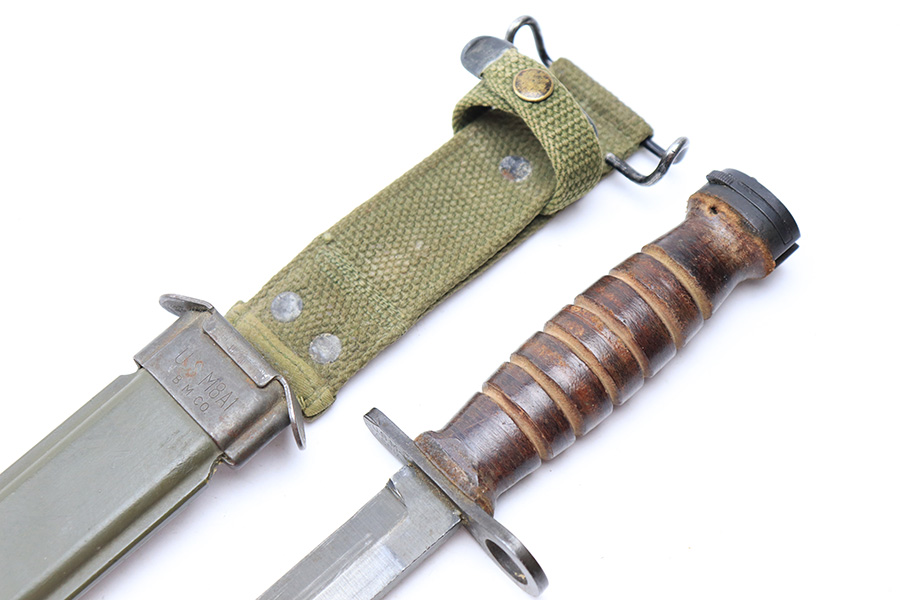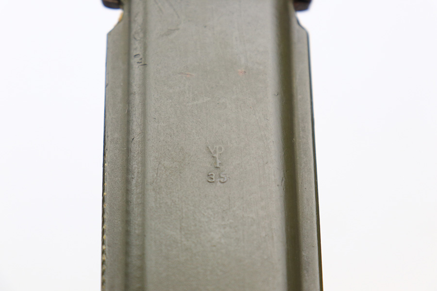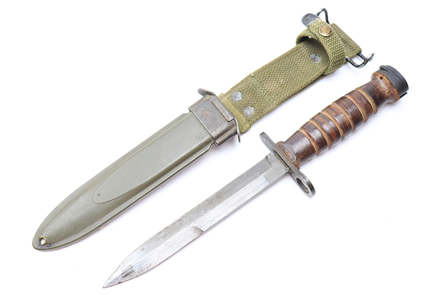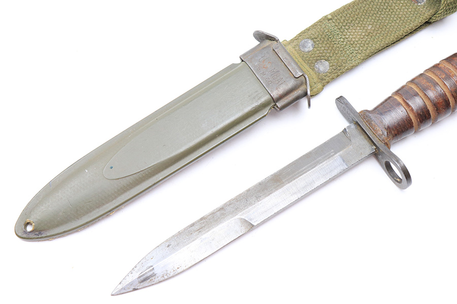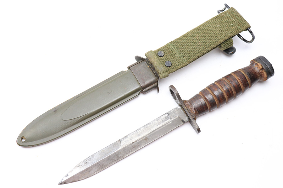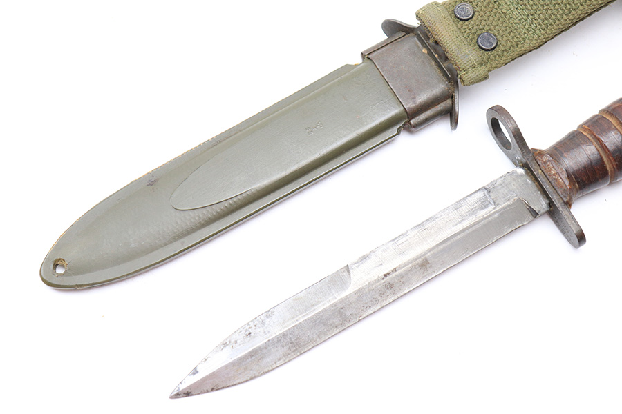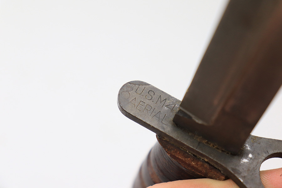 4/29/22 – This is an original US M4 bayonet made by Aerial. Aerial is a fairly scarce and desirable maker. These bayonets were used during the end of WW2. The blade on this example shows signs of previous use and aging. Most of this is surface discoloration and patina / surface scratches throughout. The hand guard is maker stamped and ordnance stamped. The leather handle is in great condition. Comes with a US M8A1 scabbard.