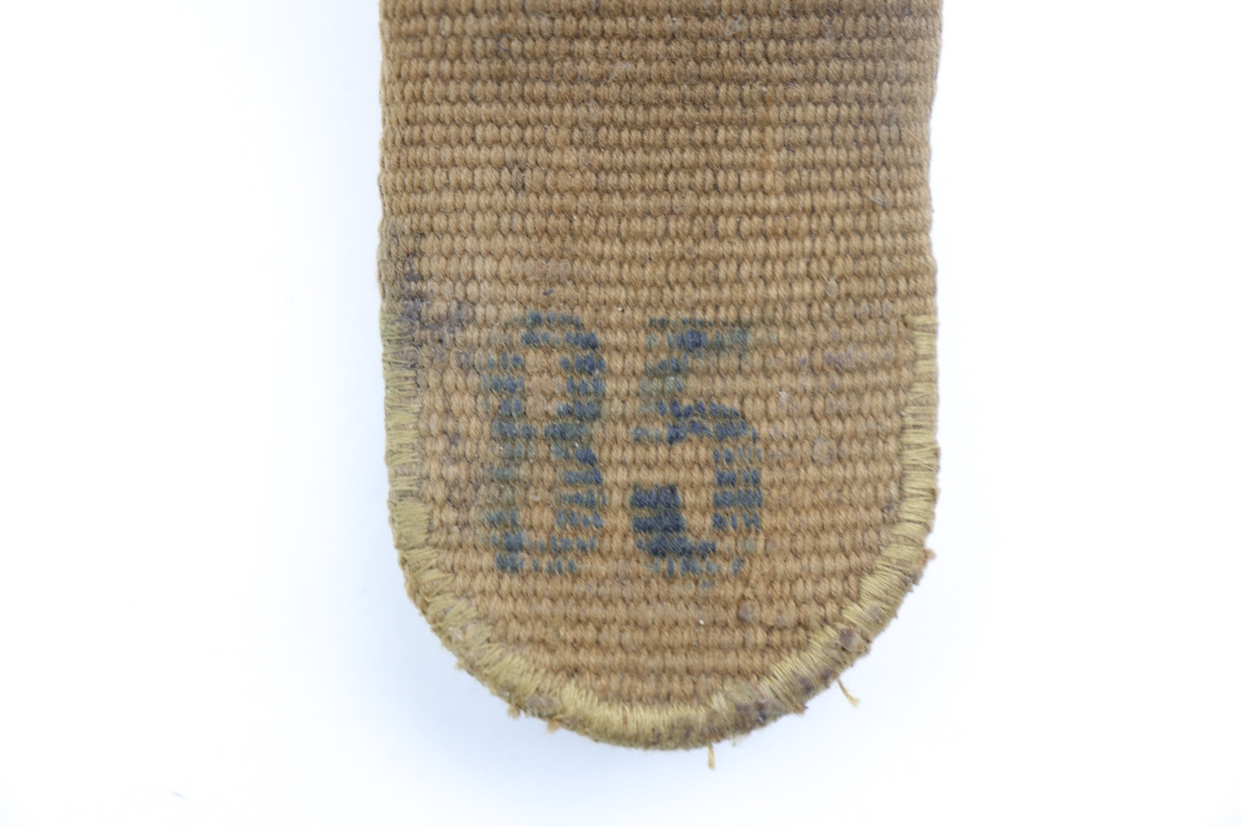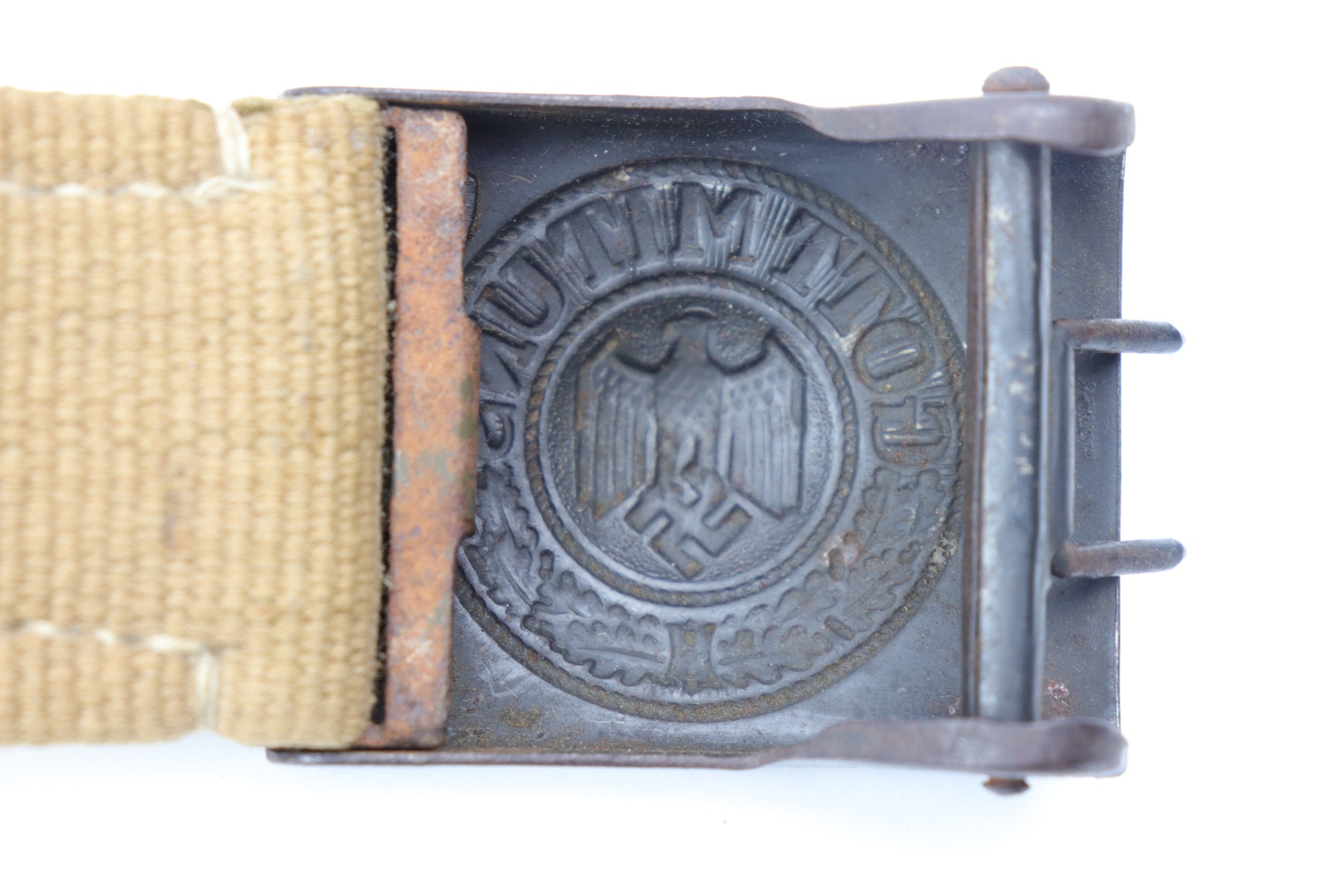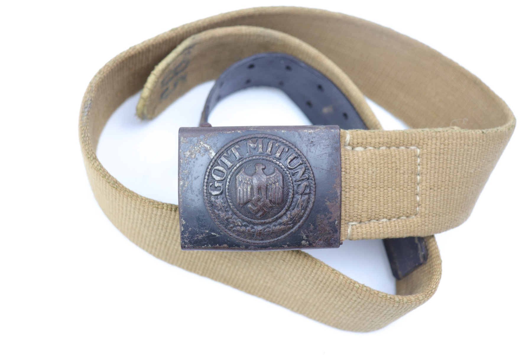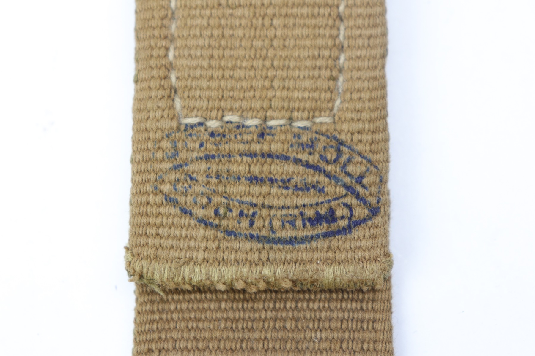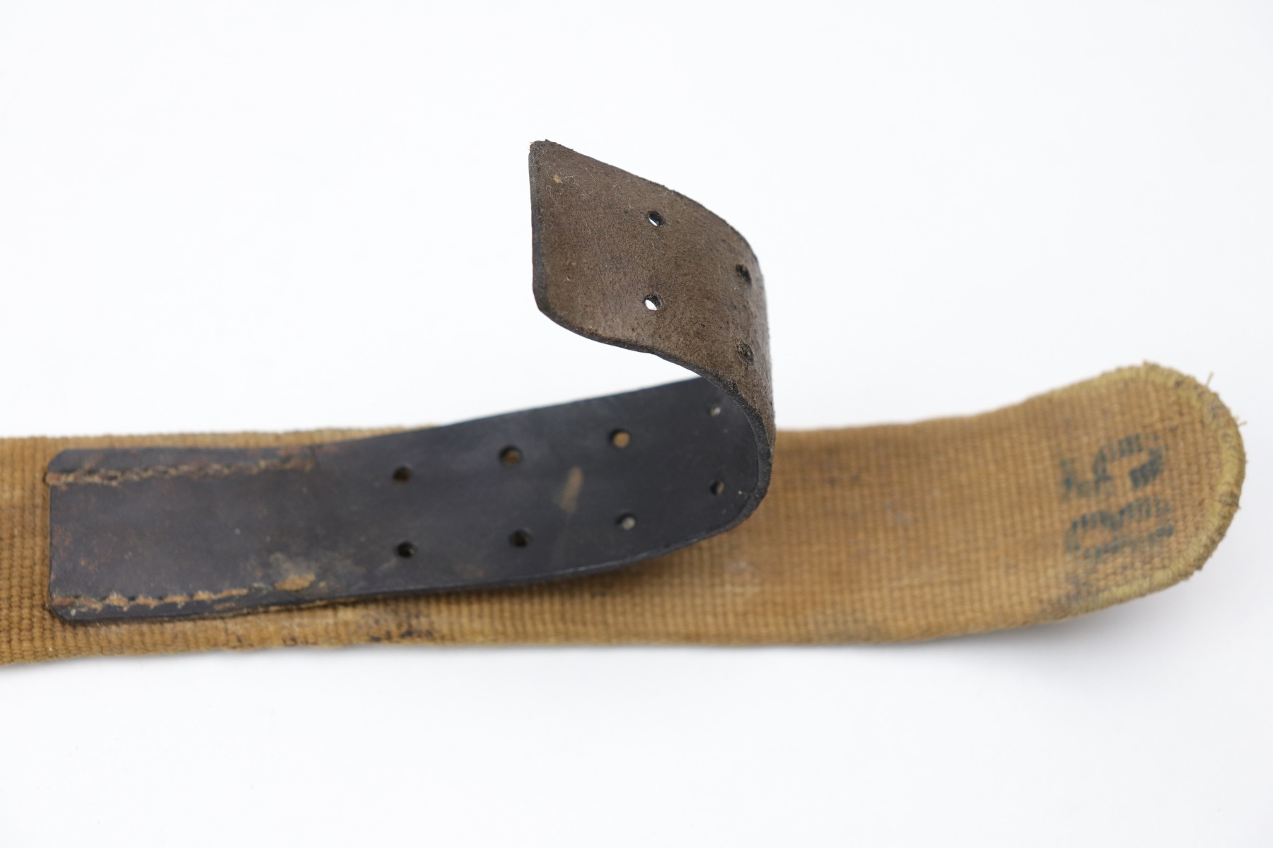 8/26/20 – This is a Nazi Germany Afrika Korps NCO’s canvas belt with metal buckle. The maker mark is stamped on the stitching inside of the belt. The size- 85- is also stamped at the ‘end’ of the belt. The buckle has “Gott mit uns (God with us)” stamped across the top with the Nazi eagle and swastika beneath it. The leather support piece with belt holes has started to fray a bit. Overall very good condition.
