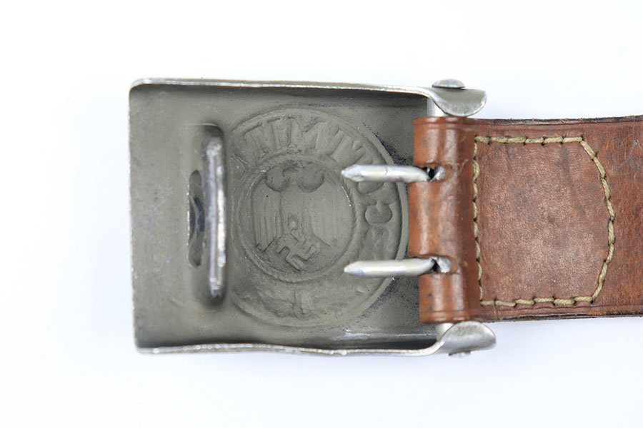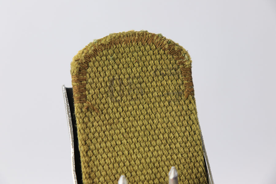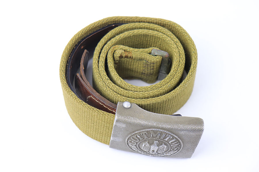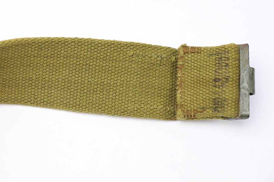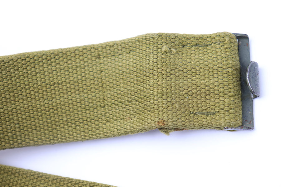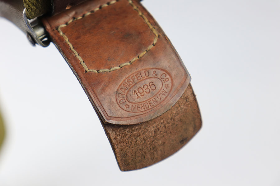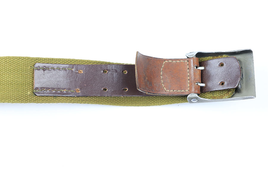 7/6/21 – This is an excellent condition German Afrika Korps belt and buckle. The buckle is a military olive green colored, and the canvas is minty condition. The end of the canvas appears to be altered and re-stitched. Price reduced accordingly. There are some ink stamps on the canvas that are too hard to decipher. The buckle is unmarked but definitely original. Crisp maker stamp and date stamp on the leather tab.
