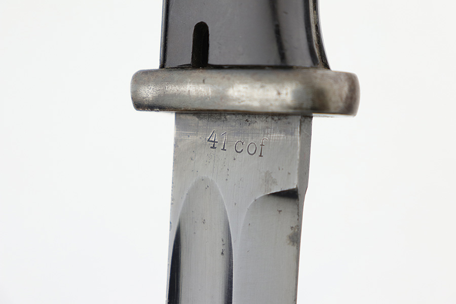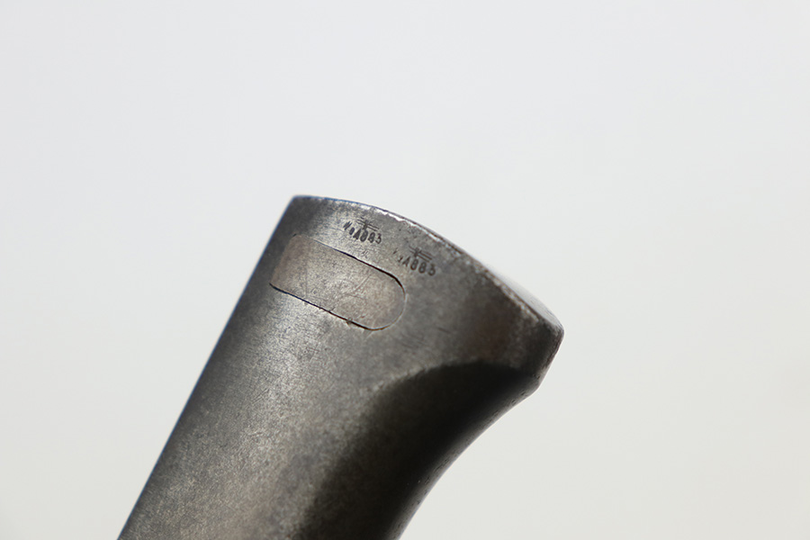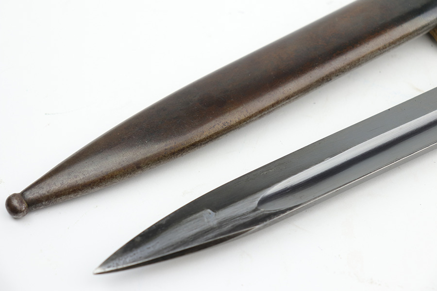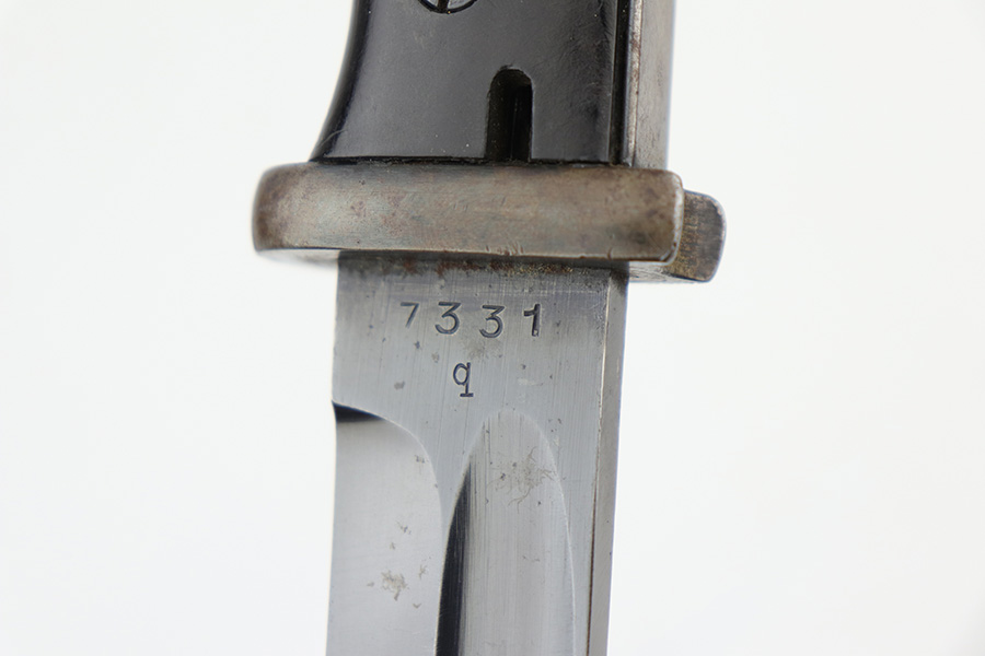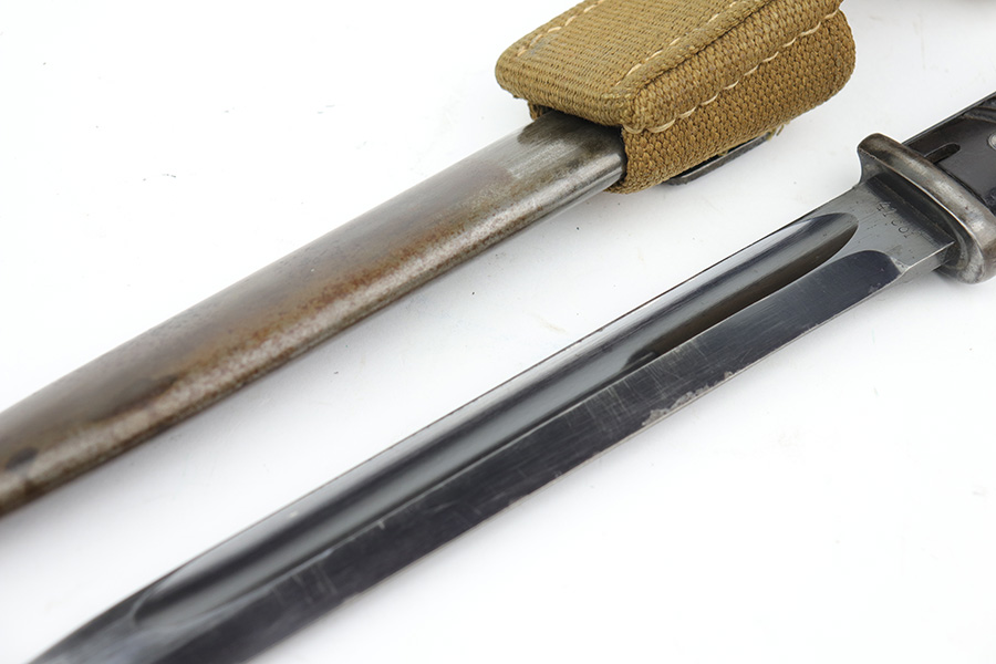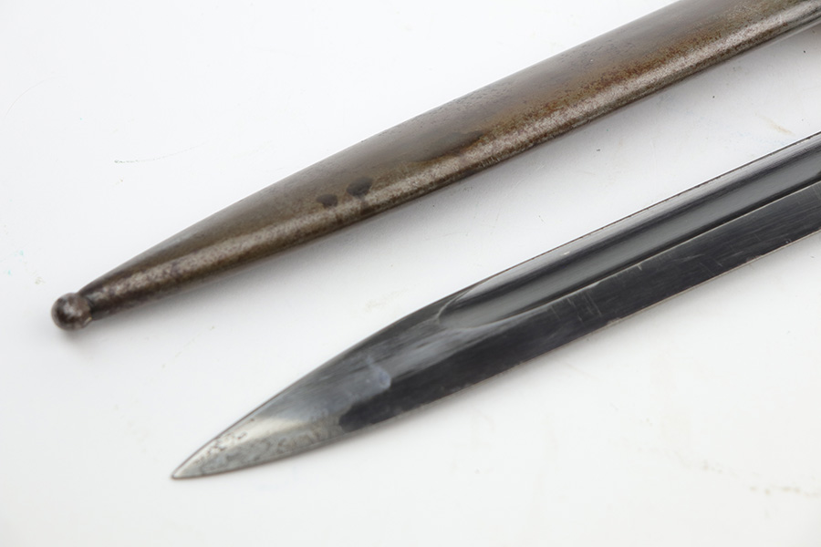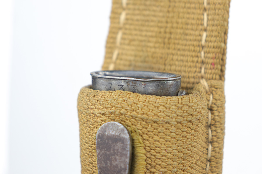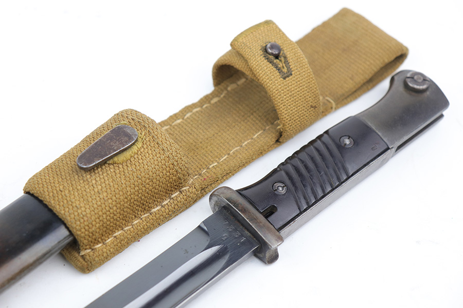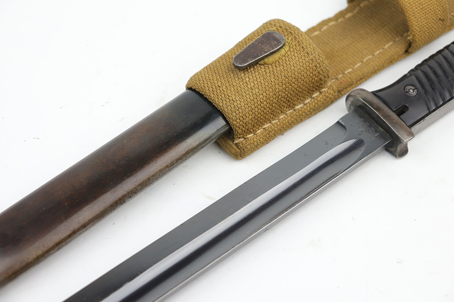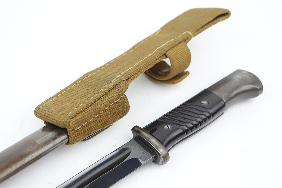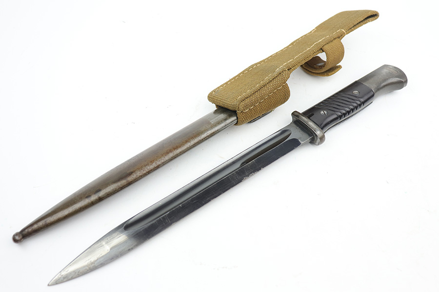 10/21/21 – This is a high-end example of a matching K98 bayonet and scabbard, with a canvas DAK frog. The frog is in excellent condition with no markings or stamps. The bayonet blade has some dark discoloration in spots but overall is in great condition. Mild finish loss throughout as well. There’s patina throughout the metal handle. The scabbard has no dents but most of the finish is gone and there is discoloration throughout.