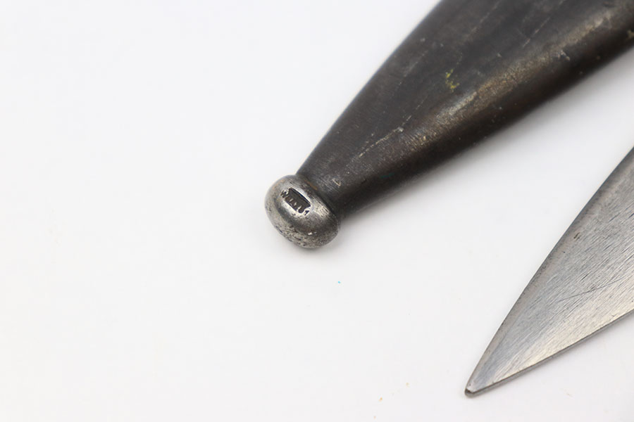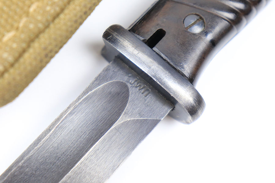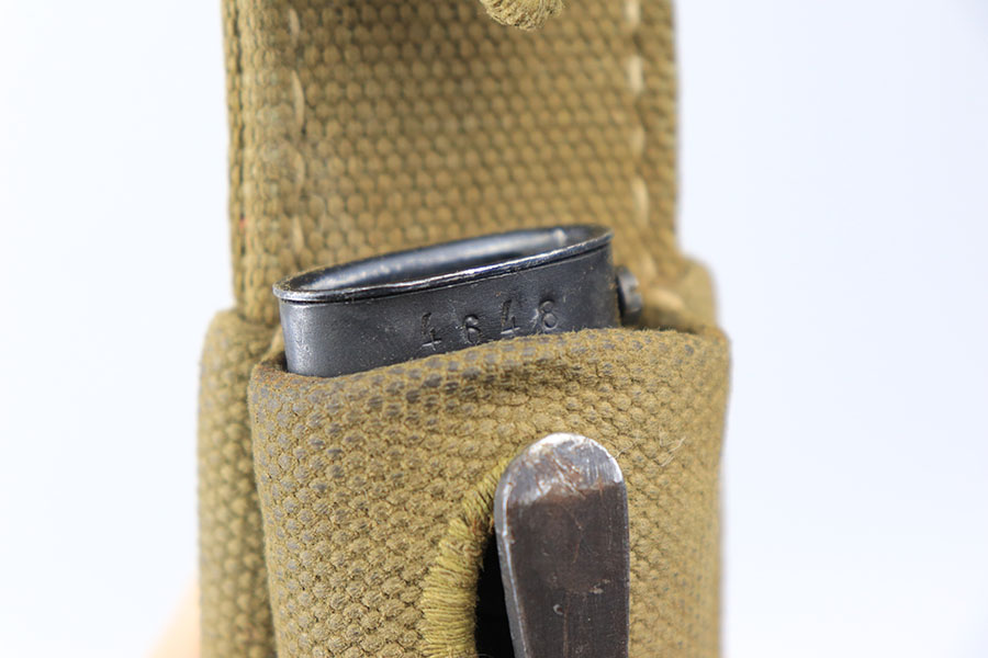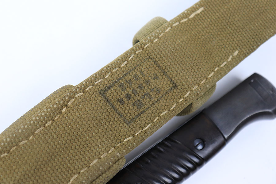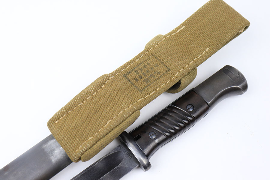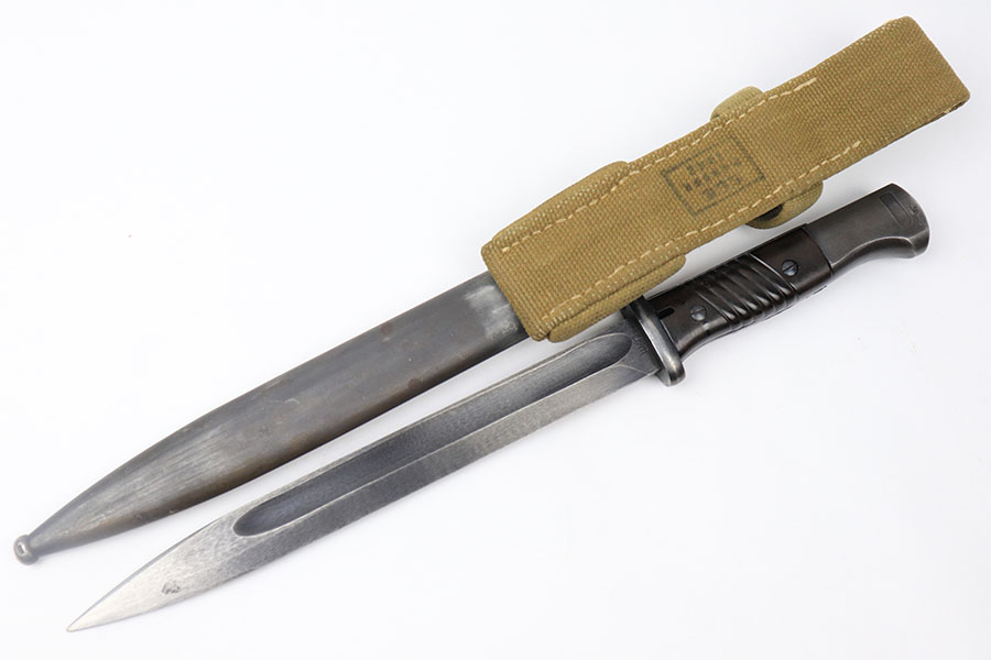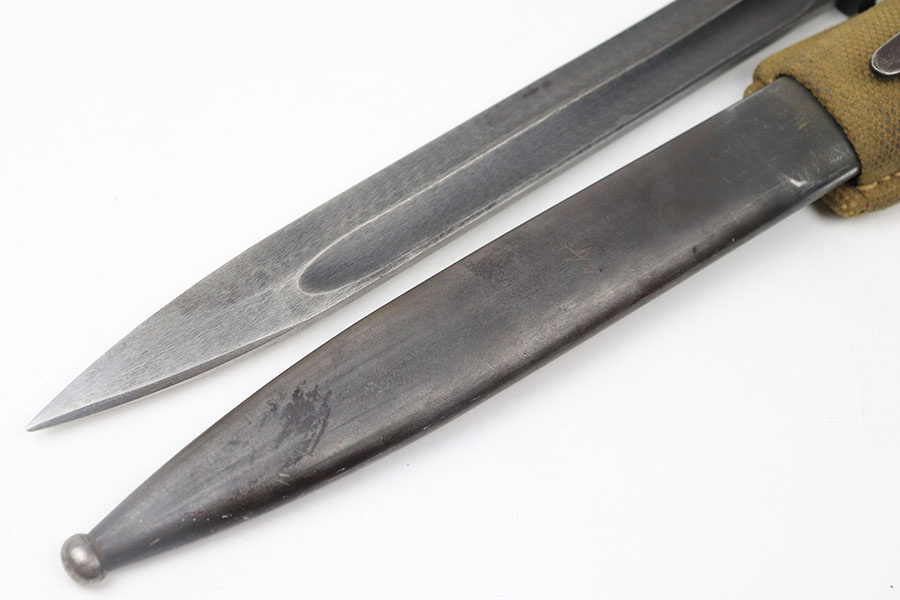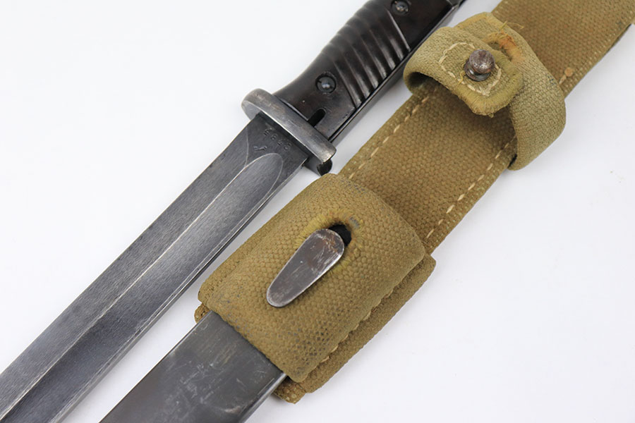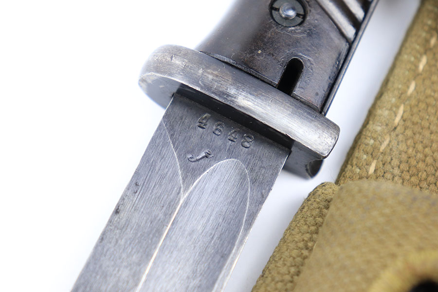 6/23/21 – This is an original, rare variation D.A.K. K98 bayonet. The bayonet comes with a matching scabbard, both numbered “4648j”. The blade is also maker stamped “jwn” on one side. The spine is numbered “42” for the date of manufacture. The blade is not sharpened and in great condition with some finish thinning throughout but no rust or pitting. The scabbard shows similar finish thinning and mild patina throughout. The green canvas frog is ink stamped on the back, but the ink is faded and illegible.