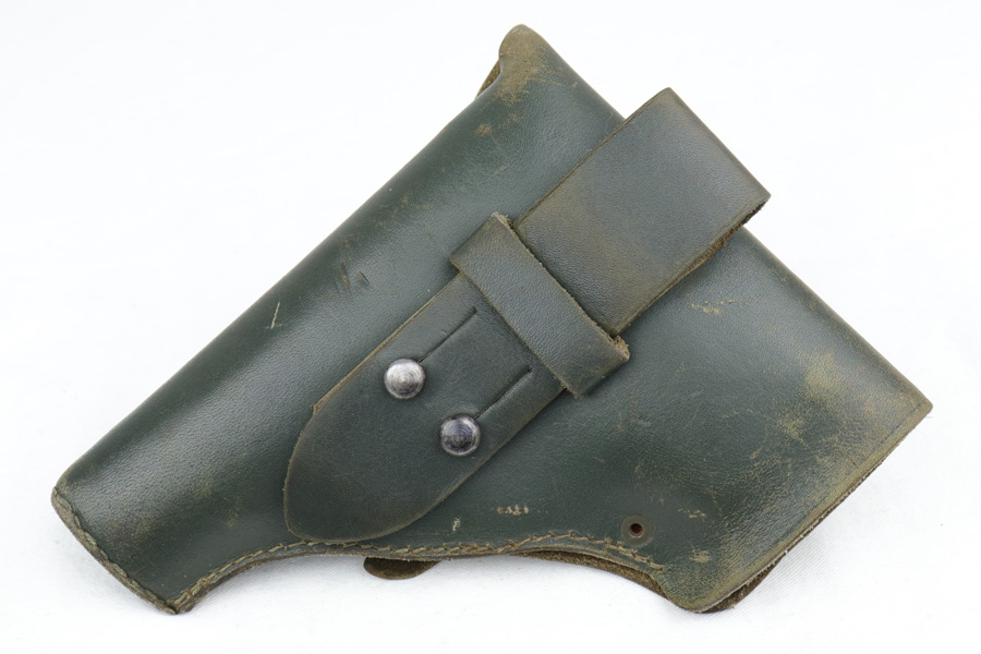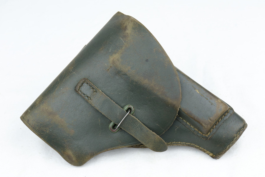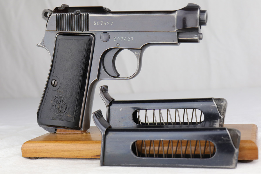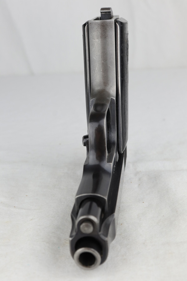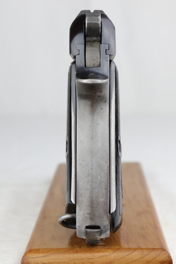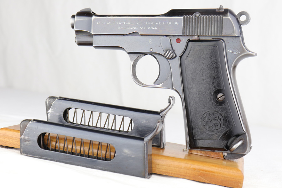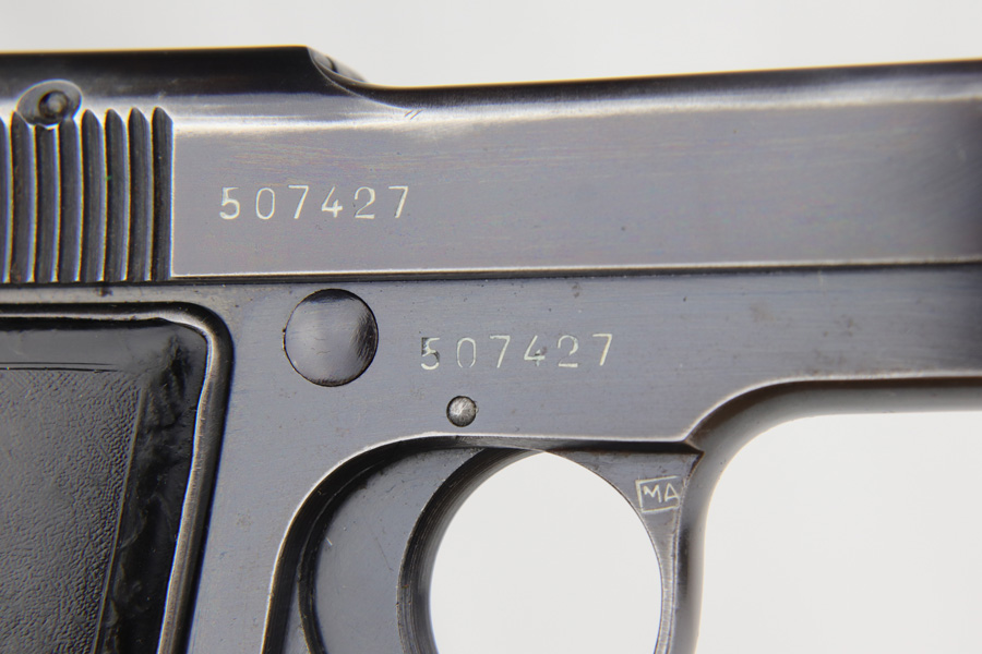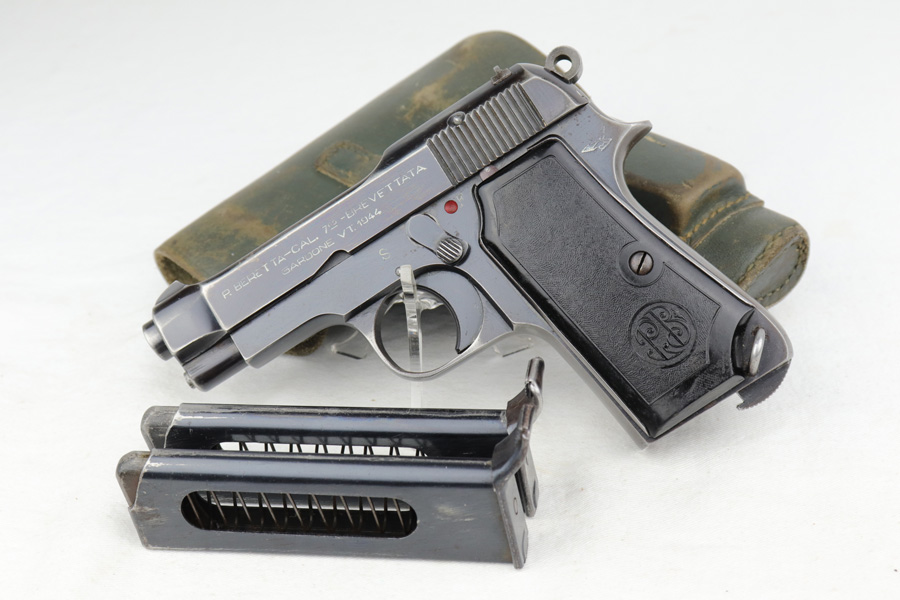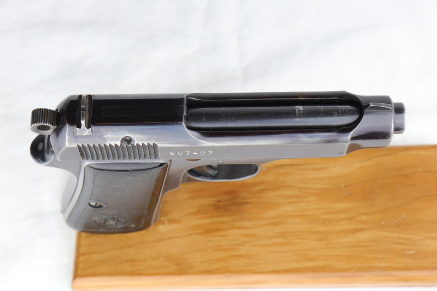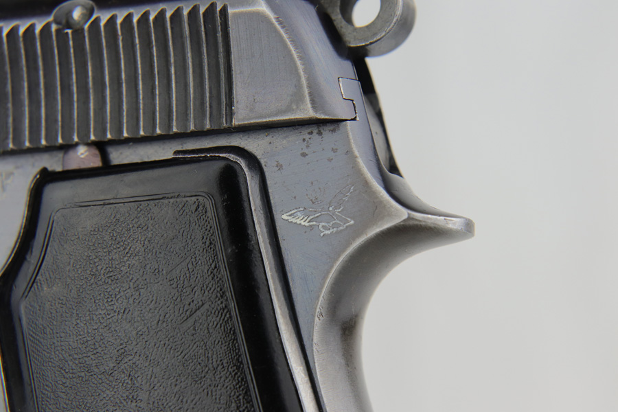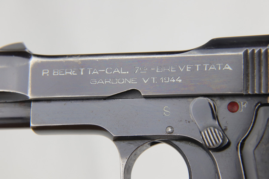 1/11/19 – This is a 1944 production Beretta model 1935 designated for the Italian air force. The pistol is Air Force marked on the left side of the frame on the tang (near the hammer). The pistol has high polish finish that’s in about 90-92% overall condition. The front and back straps are missing just about all of the finish, showing that this gun was used (or at least held a lot) during the end of WW2. There’s also some light bluing loss on the slide – mostly around the edges. The bore has nice rifling but there are a few small areas of light patina. Overall the bore is very nice though: 8/10. Fully functional with smooth action and an original magazine. Comes with an original Italian holster with an interior maker stamp that I can’t decipher. Spare magazine also included. Original and authentic rig.