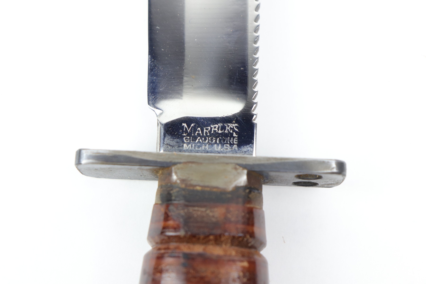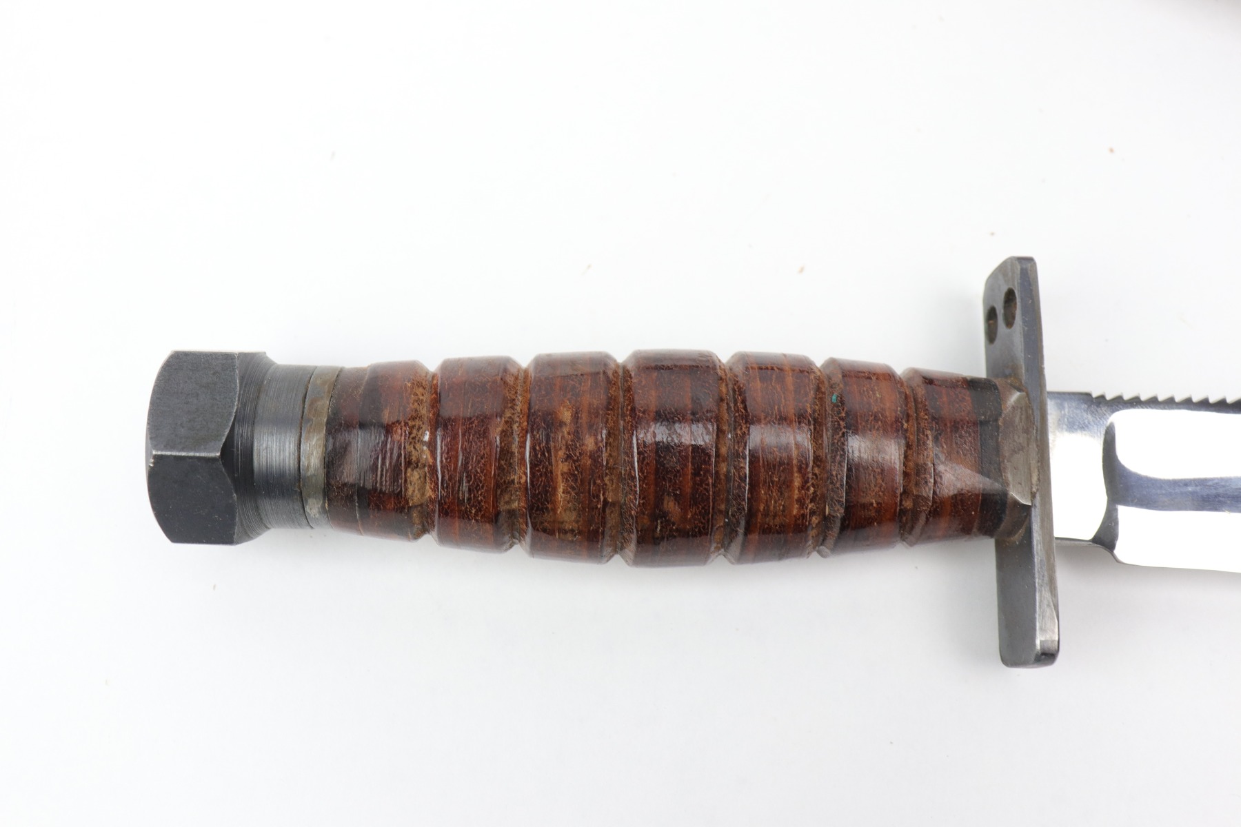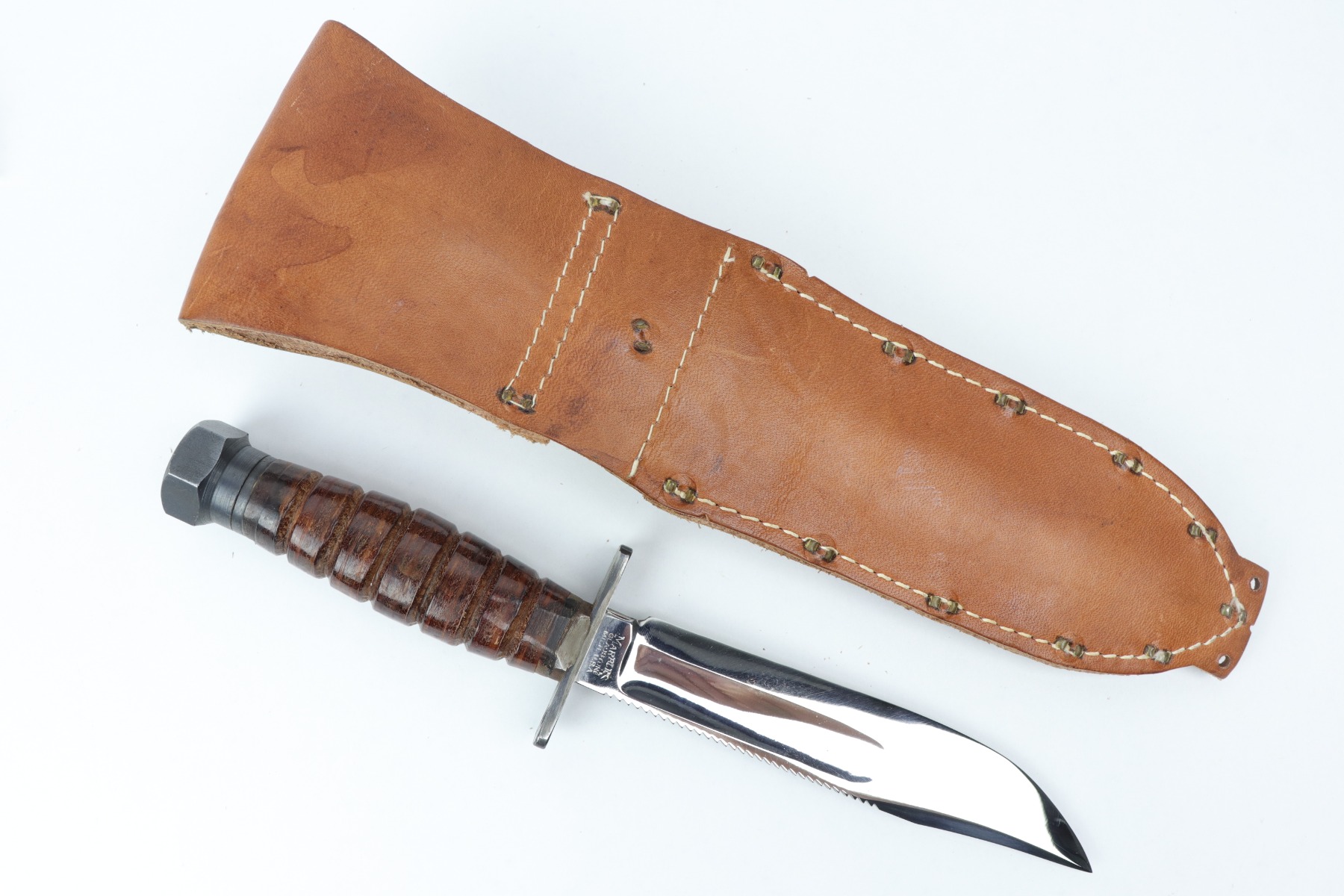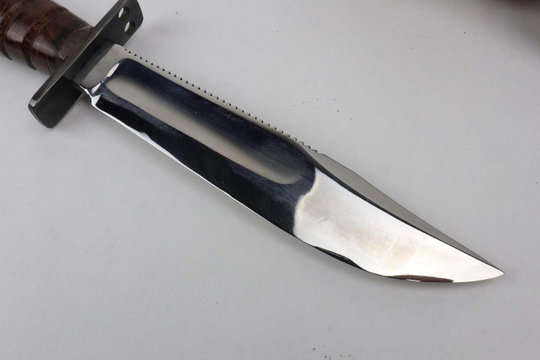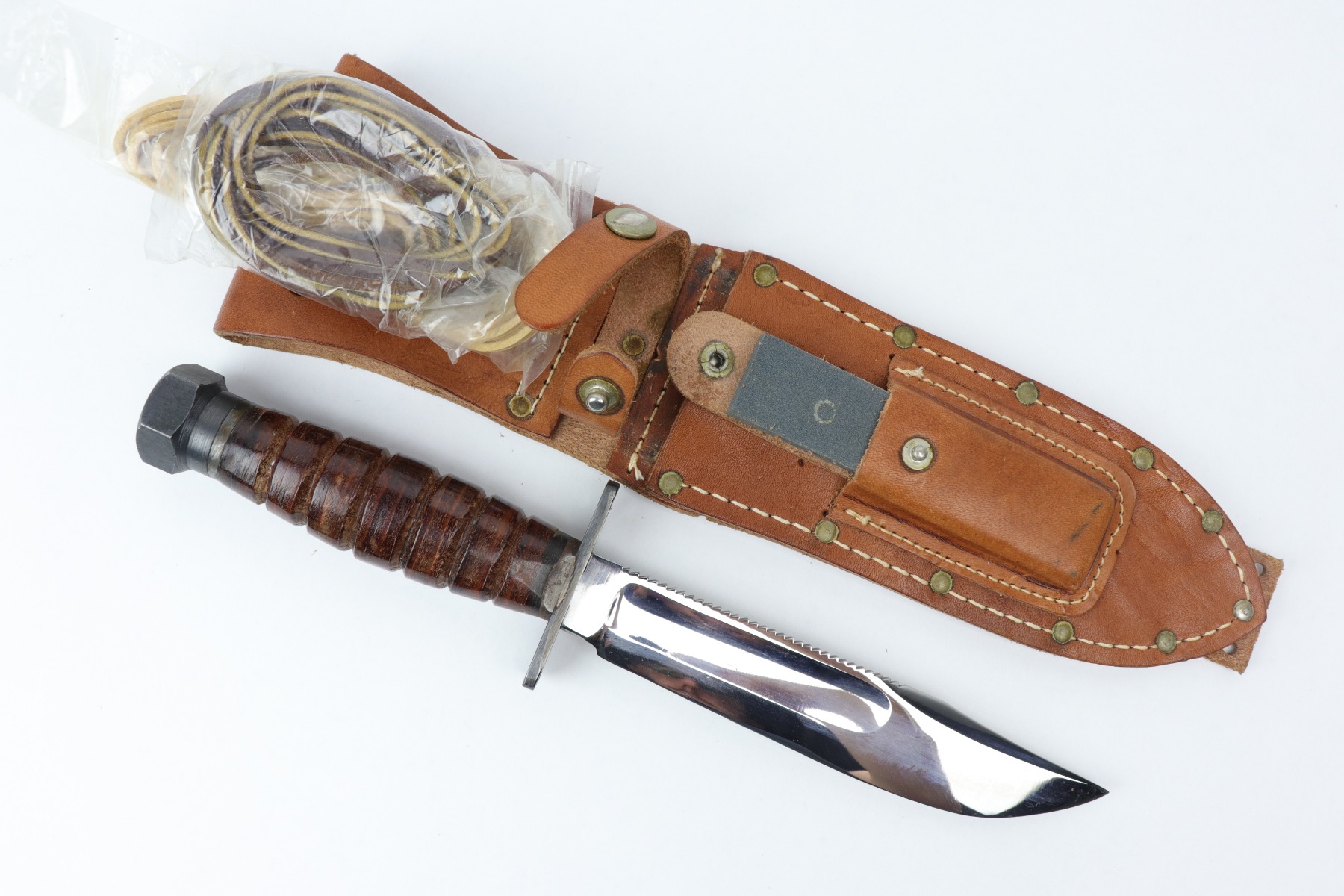 9/14/20 – This is a civilian version of an Air Force survival knife- aka the jet pilot’s survival knife. The blade is polished and is 6″. The sheath also comes with the original leather tie-downs in their original bags.