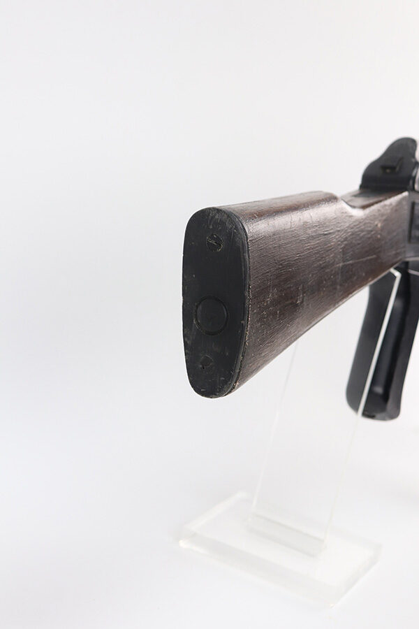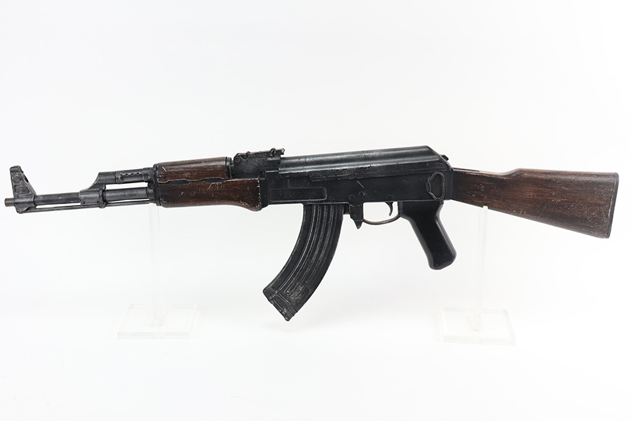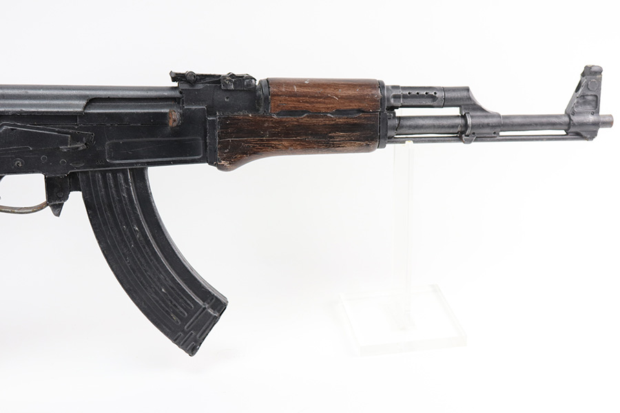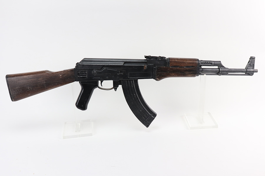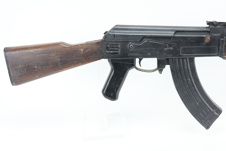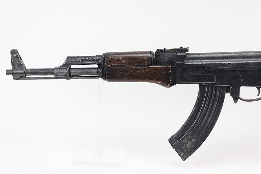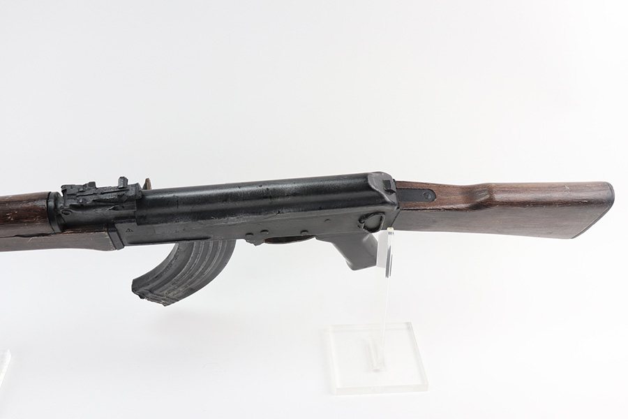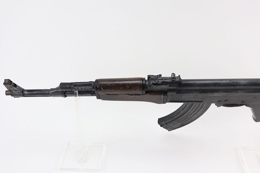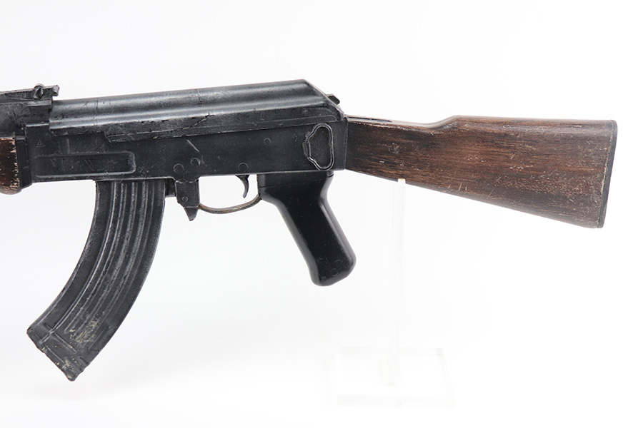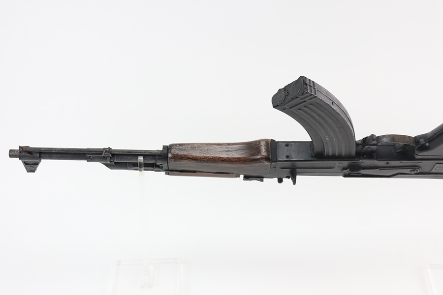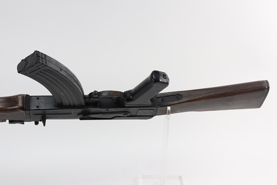 8/16/21 – This is a nice example of a solid dummy AK 47 training rifle. It is cast in hard rubber and has no moving parts. It is painted to look like the real thing and is the exact same size as the original. The paint is slightly worn throughout. There are scuffs here and there, most noticeable on the receiver. There are some very minor casting flaws and a small chip in the rear sight.