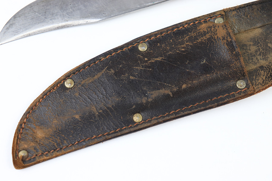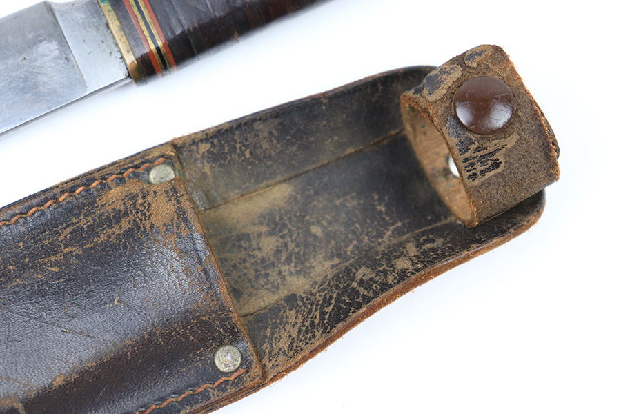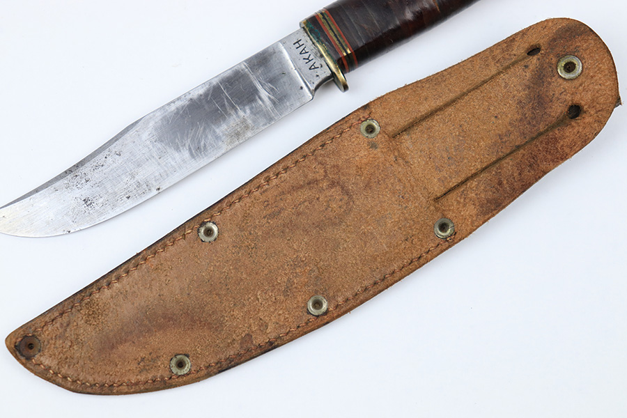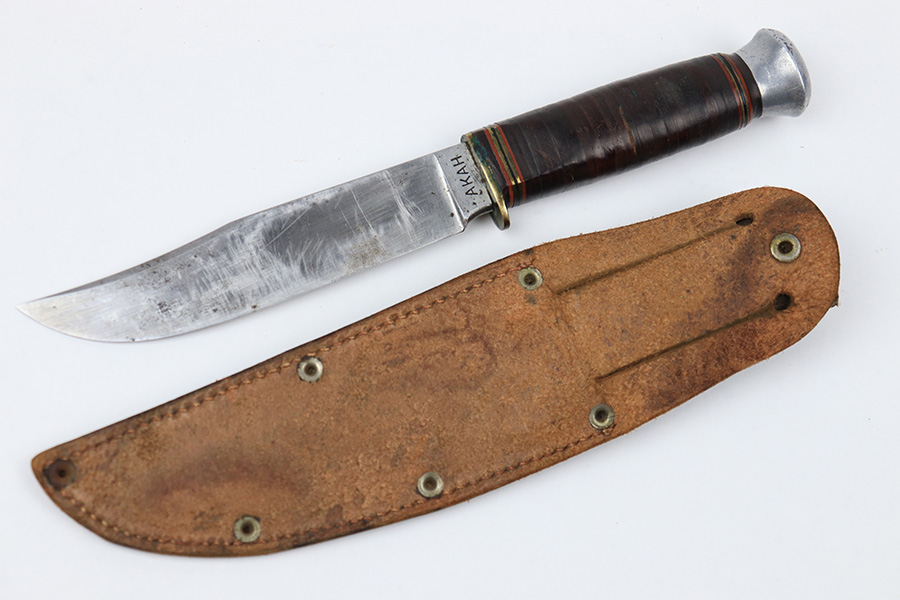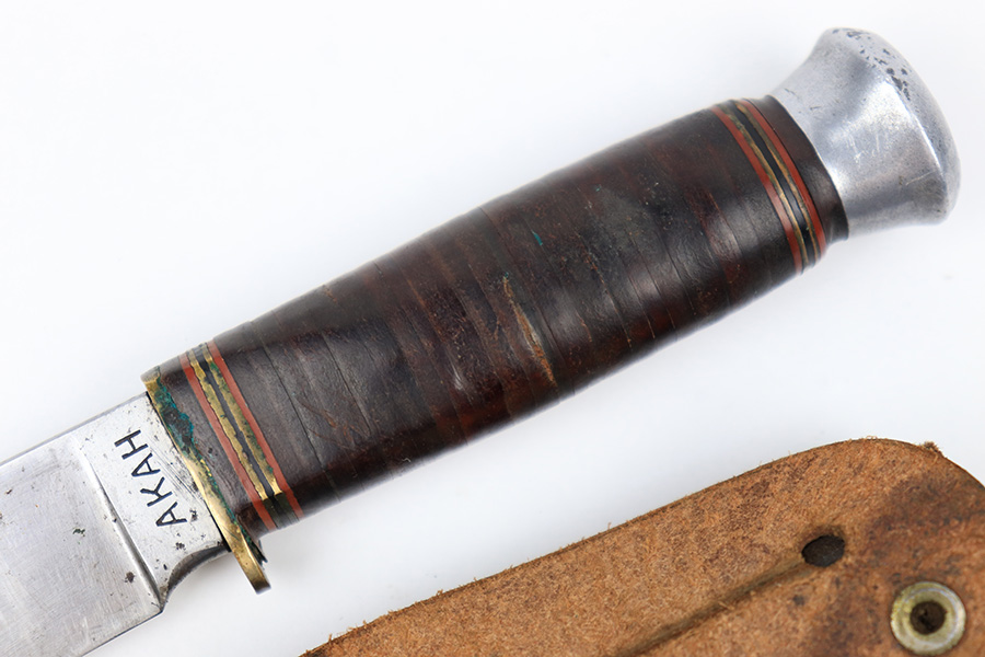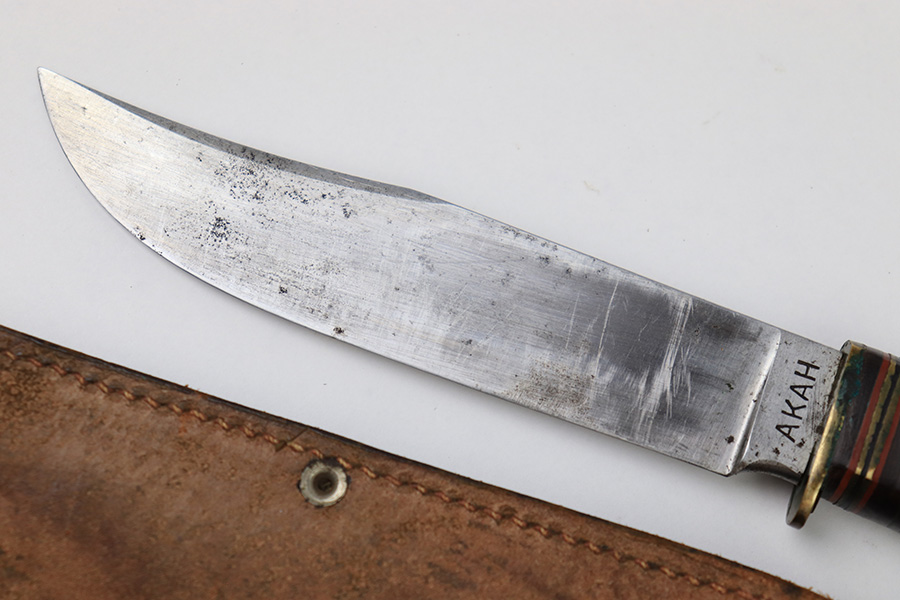 6/30/22 – This is an early / pre WW2 production AKAH knife. The knife was likely a hunting / utility knife made in the 1920s or 1930s (our guess). The knife blade has some surface scratches and signs of sharpening along the edge. The ricasso is AKAH maker stamped on one side. There’s some mild patina and oxidation on the blade but no major issues. The handle is in great condition with black, gold, and red colored spacers. Comes with an unmarked leather scabbard that appears original to the knife. Overall length of the knife is about 8.75 inches.