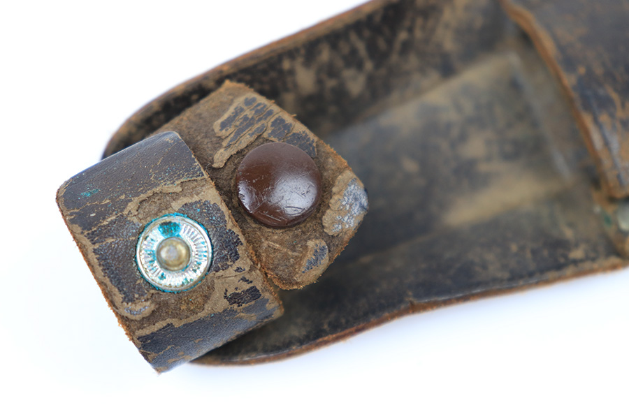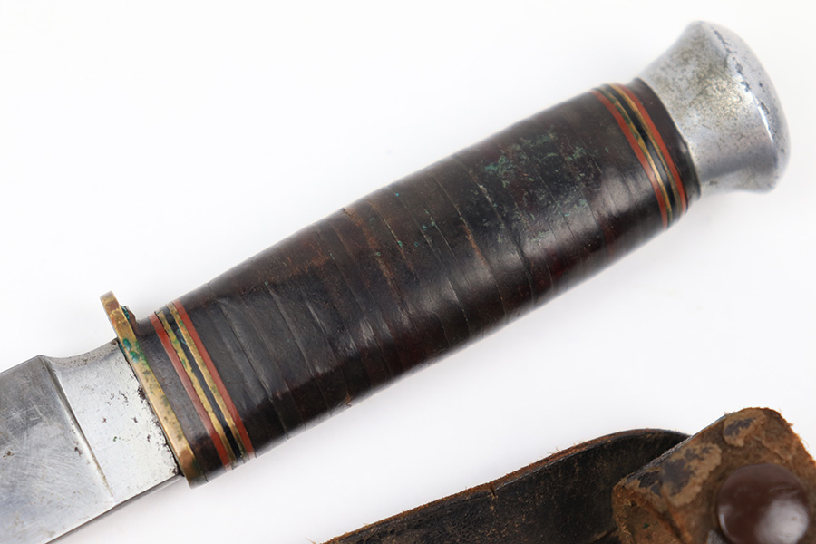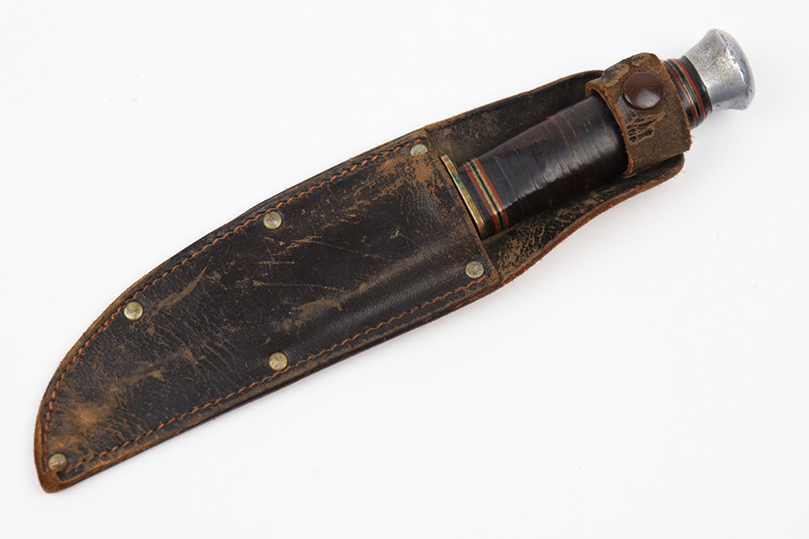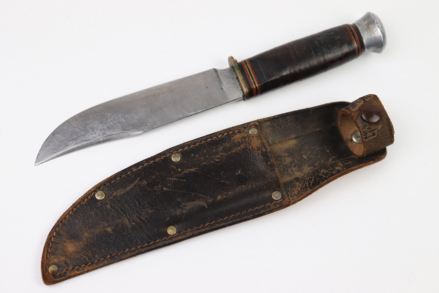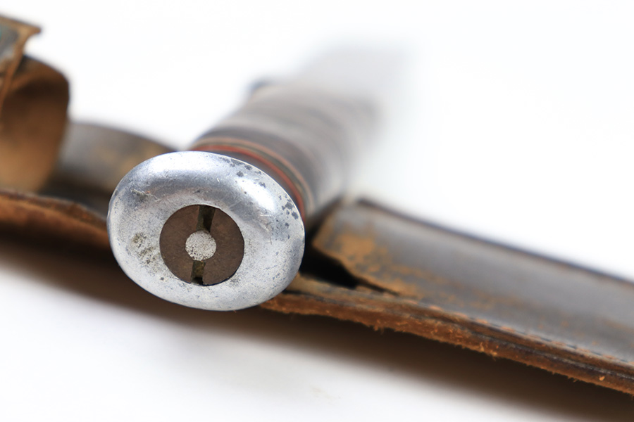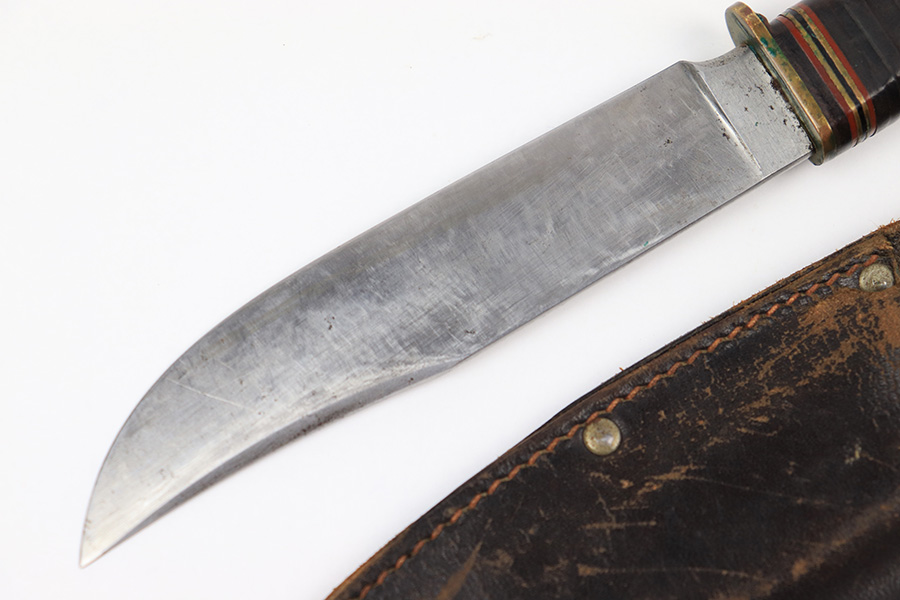 6/30/22 – This is an early / pre WW2 production AKAH knife. The knife was likely a hunting / utility knife made in the 1920s or 1930s (our guess). The knife blade has some surface scratches and signs of sharpening along the edge. The ricasso is AKAH maker stamped on one side. There’s some mild patina and oxidation on the blade but no major issues. The handle is in great condition with black, gold, and red colored spacers. Comes with an unmarked leather scabbard that appears original to the knife. Overall length of the knife is about 8.75 inches.