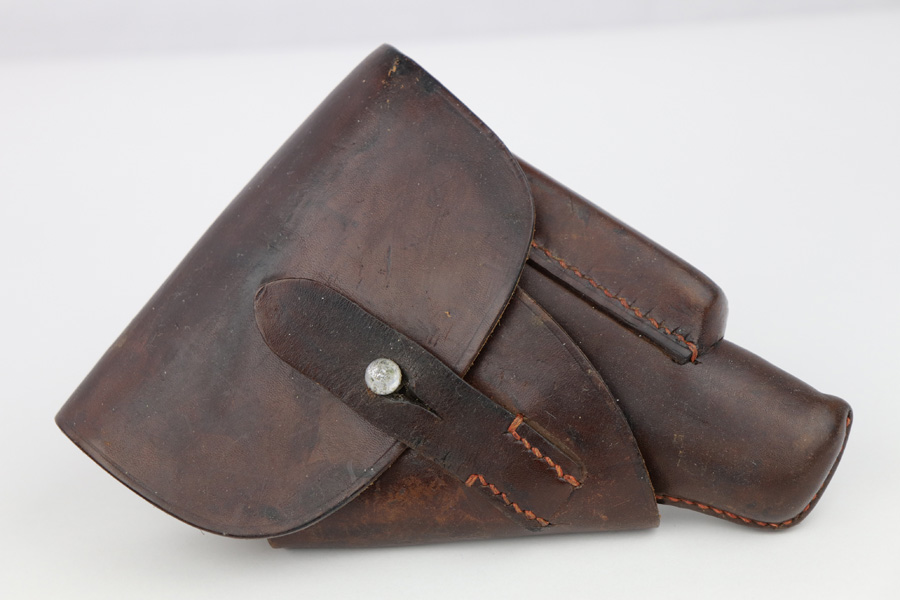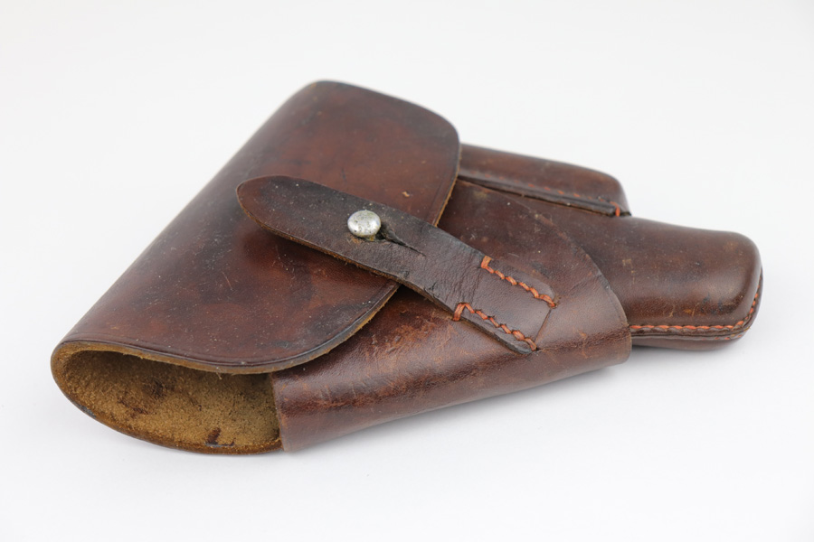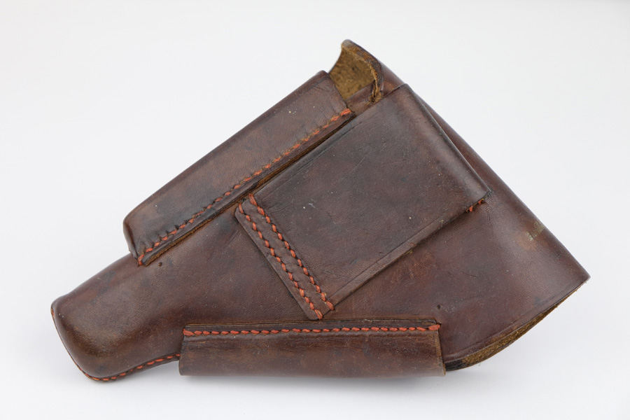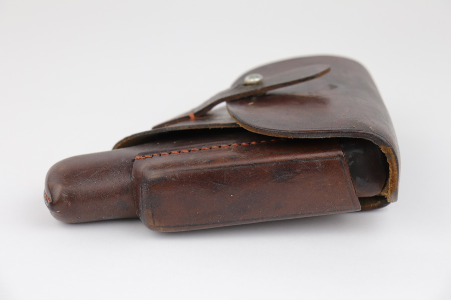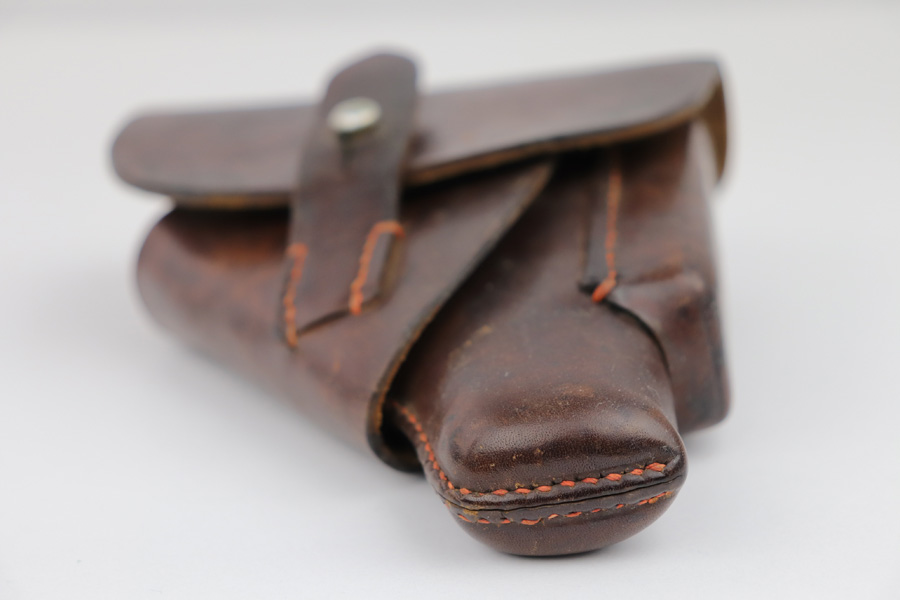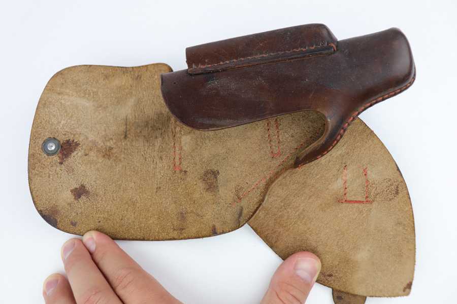8/7/19 – This is an original AKAH leading edge style Walther PPK holster. The holster is in great condition overall with some normal signs of aging and exterior scuffing, but no major issues. The interior leather is clean but there’s no visible ink stamp. The stitching is excellent and original with a nice reddish coloring. AKAH maker stamped under the closure strap. All original and authentic.
