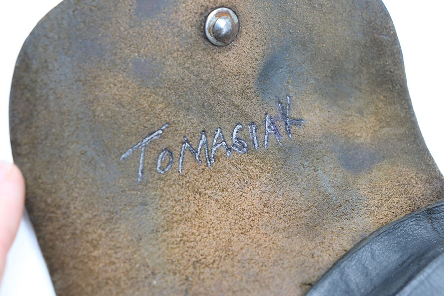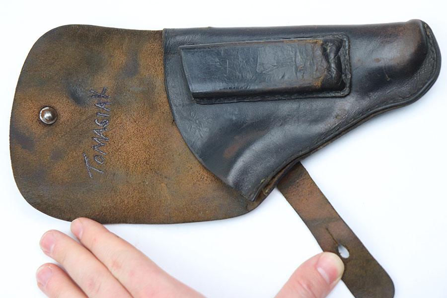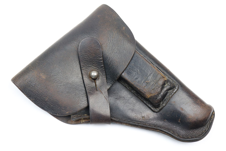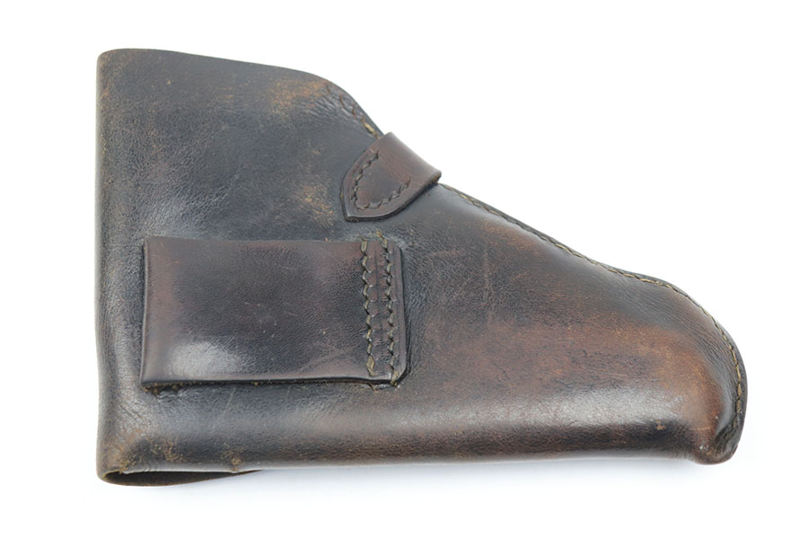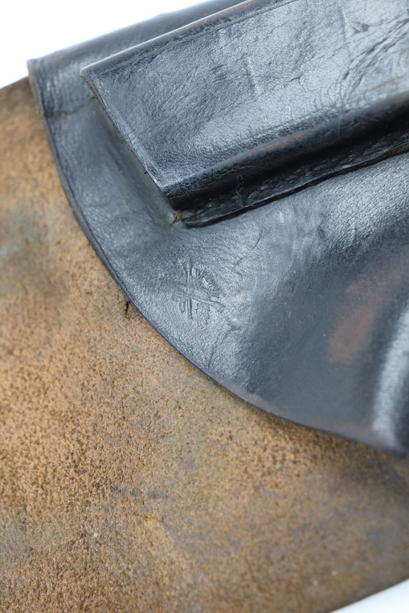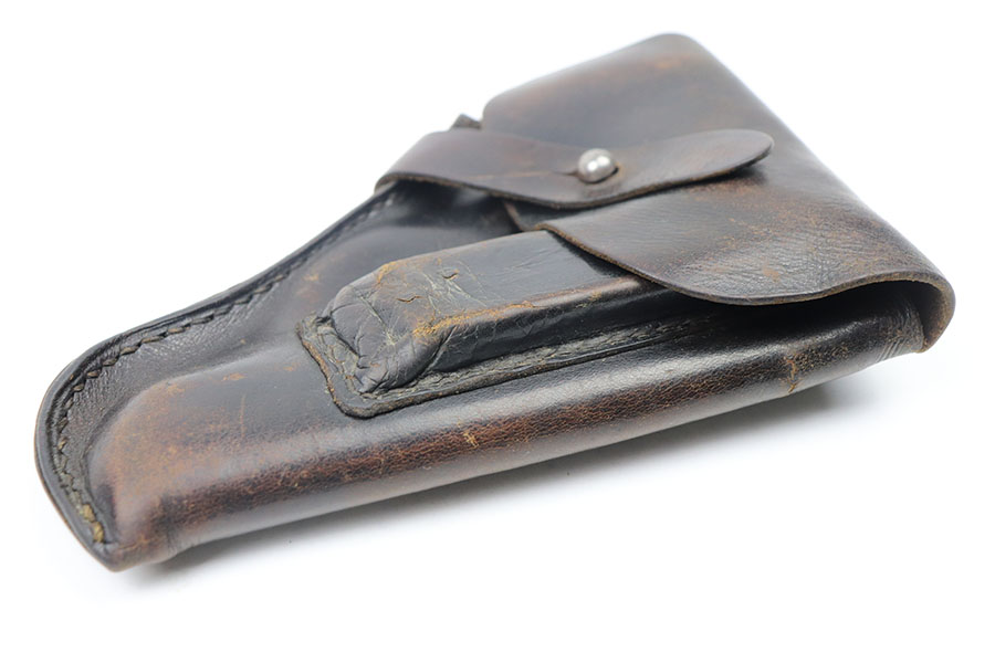 4/21/21 – This is a fairly rare AKAH made holster for a Mauser HSC pistol. This style holster typically isn’t found by AKAH. Would also be appropriate for a CZ-27 or Mauser model 1934. The holster has pliable, worn leather with surface wrinkling but is still completely intact. No notable stitching issues. The biggest takeaway is the name written on the interior leather. AKAH stamped on the front leather next to the magazine pouch.