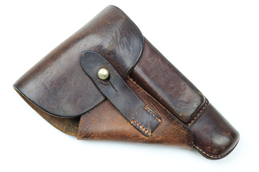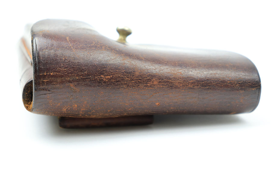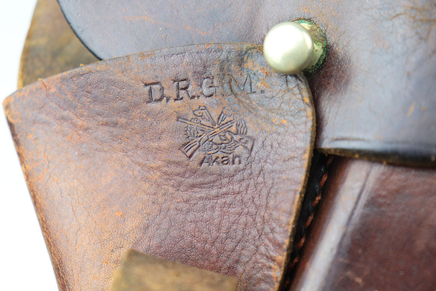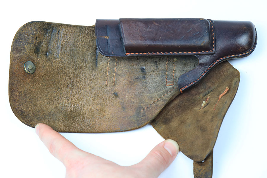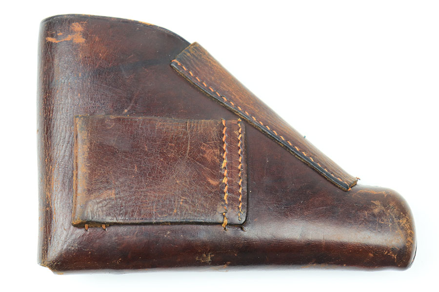 5/25/21 – This is a nice, original WW2 AKAH PPK holster. The holster is in good overall condition with normal signs of use and aging. Some mild scuffing and surface wear on the exterior leather. The stitching is all intact with some minor fraying on the interior stitching that holds the closure strap, but this is a mild flaw. AKAH stamped under the closure strap.