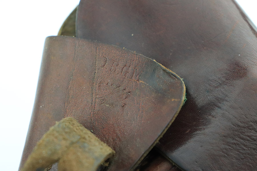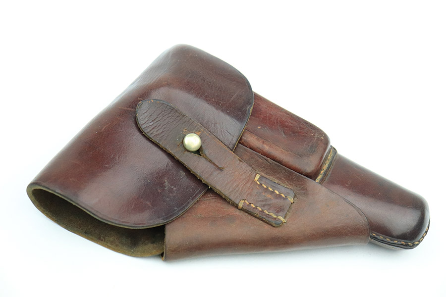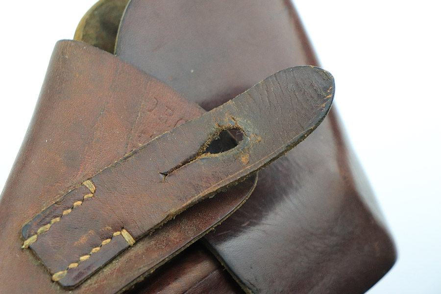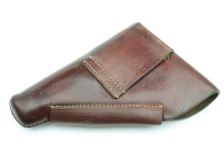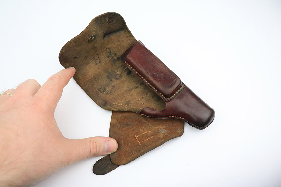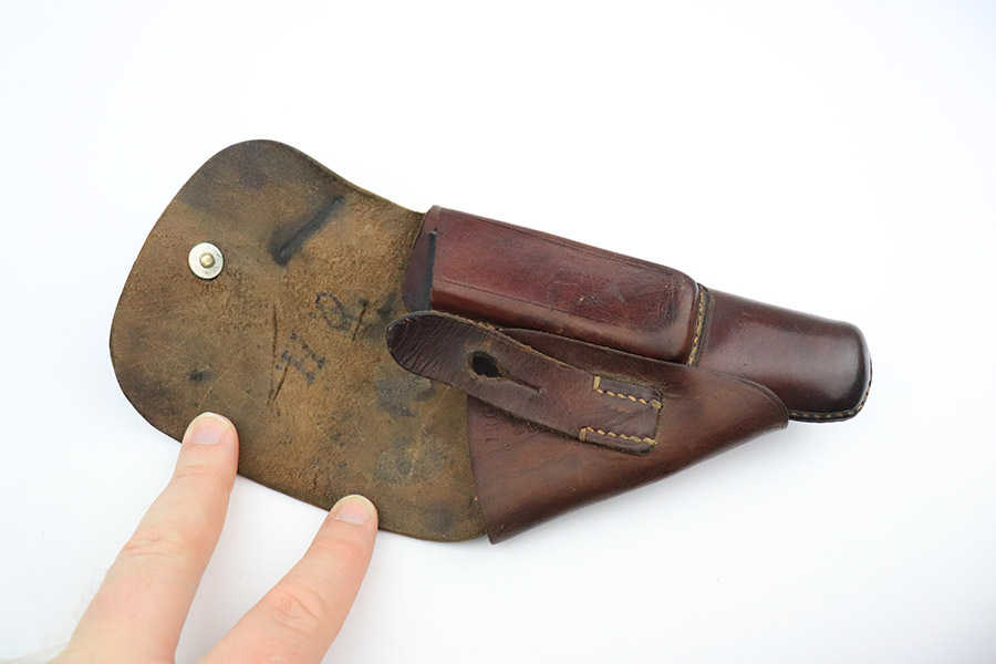 10/24/22 – This is an excellent example of an original AKAH-made, brown Walther PPK Holster from WW2. The exterior leather is in excellent condition overall. There are minor signs of use wear throughout but very little wrinkling anywhere except for the closure strap. The interior leather is in great overall condition with minor signs of wear throughout. There are a few surface cuts into the flap, as well as an ink marking reading “O. H.”. The side flap features a crisp AKAH maker stamp under the closure strap. There are no other markings. The stitching is in excellent, clean condition throughout.