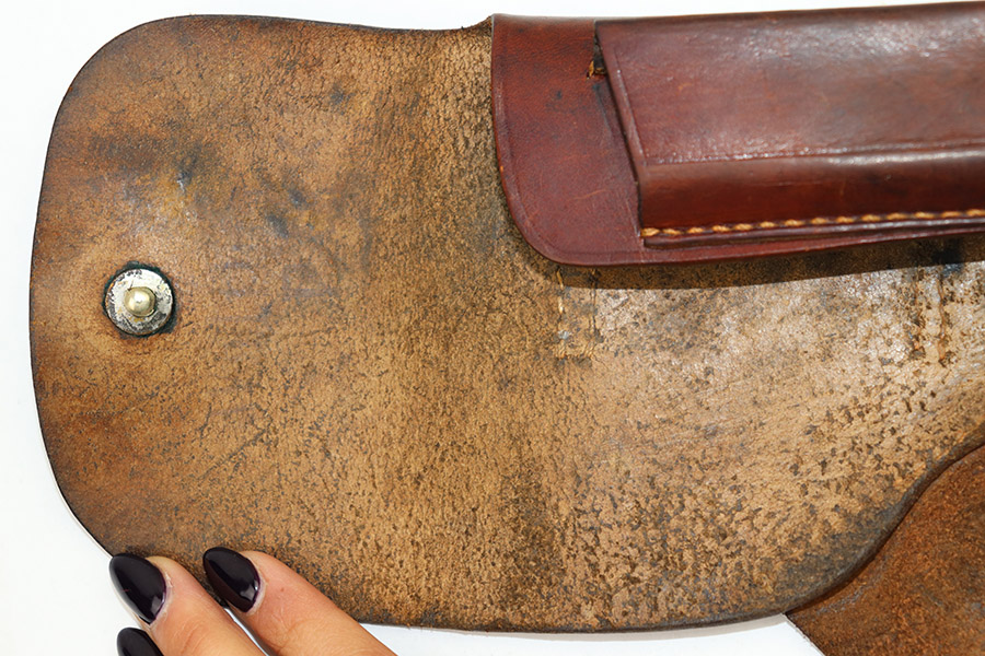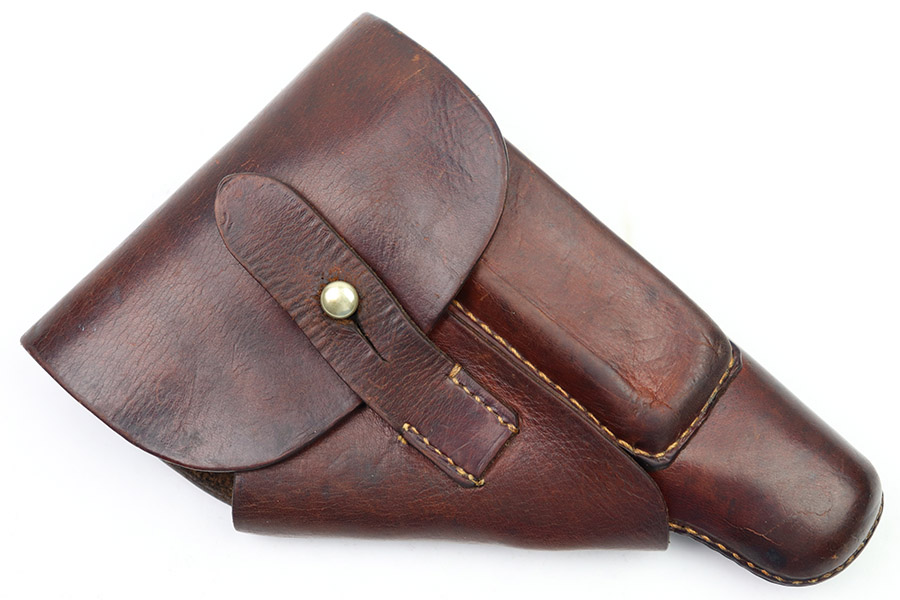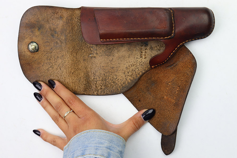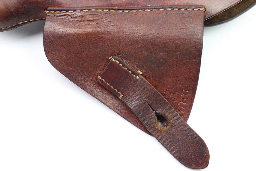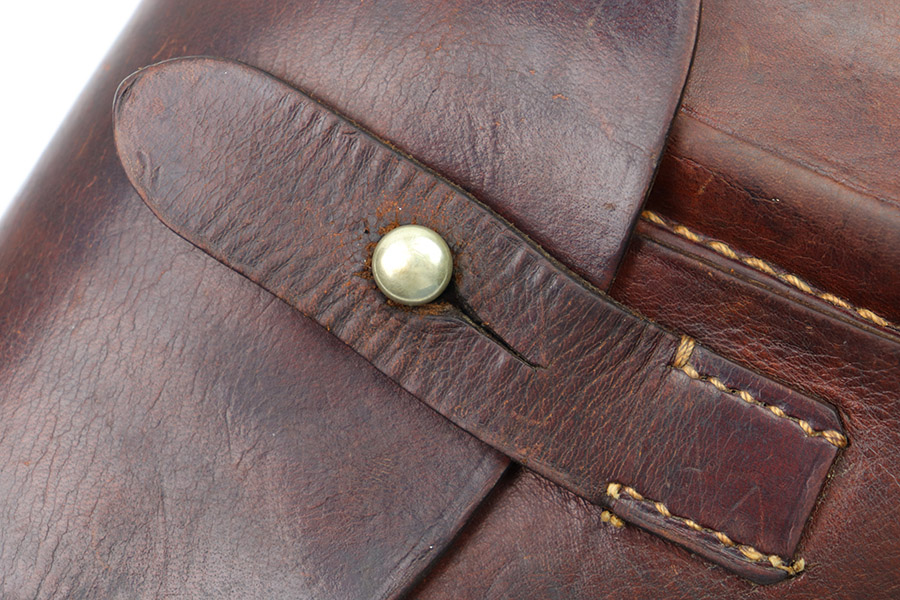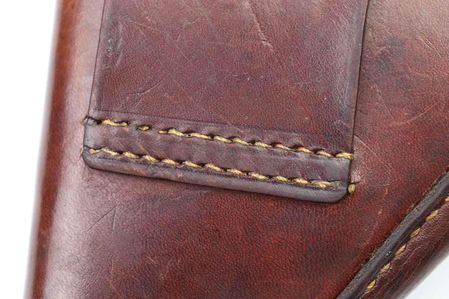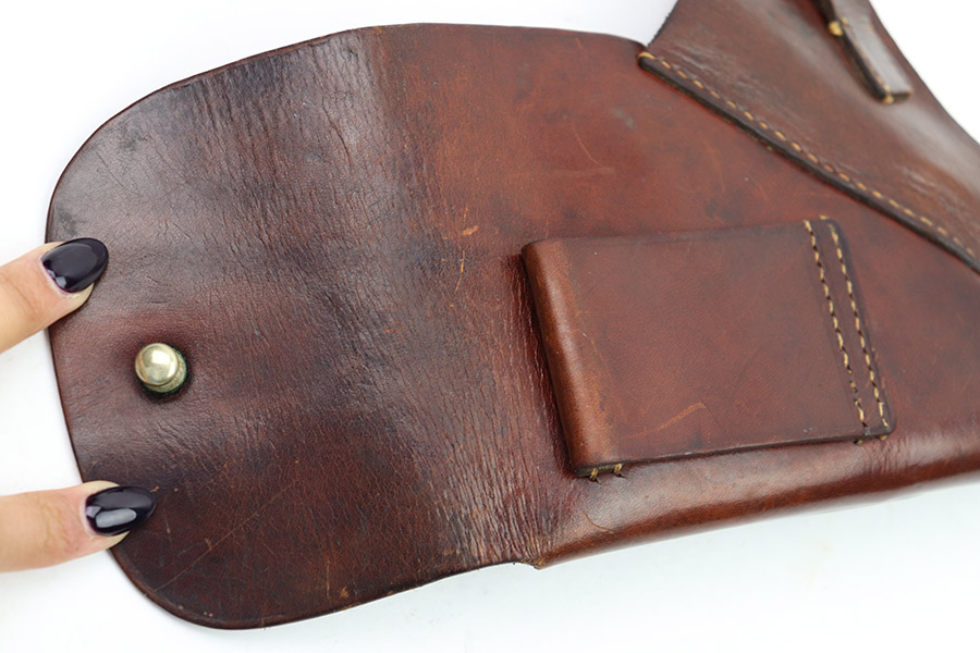 10/31/22 – This is a great example of an original AKAH-made holster for a Walther PPK from WW2. The leather exterior is in great condition overall with minor signs of wear throughout but no major defects to note. The front of the toe has a small crack in the surface and the closure flap has minor wrinkling along its fold. The interior leather is in great condition showing minor signs of use wear throughout. There is a faint ink stamp of some kind that is no longer legible on the interior leather. The interior flap and closure strap both have minor wrinkling throughout but no structural issues. There is a crisp AKAH maker mark under the closure strap. The original stitching is clean and strong throughout.