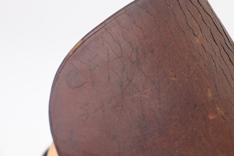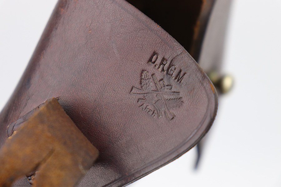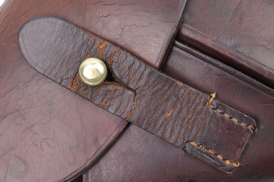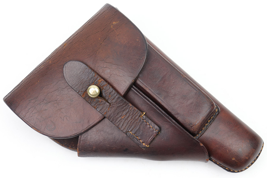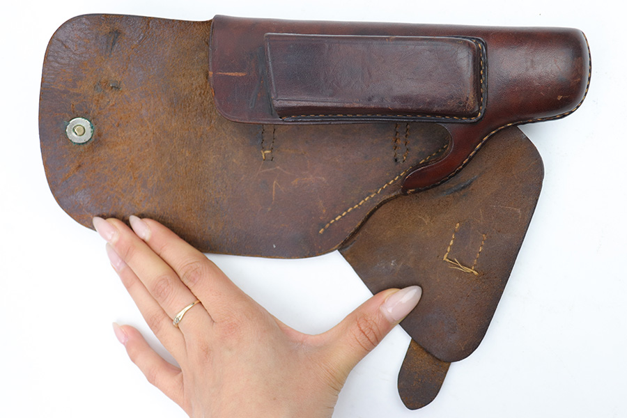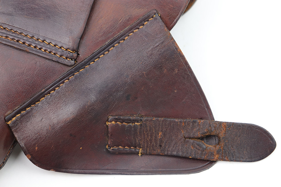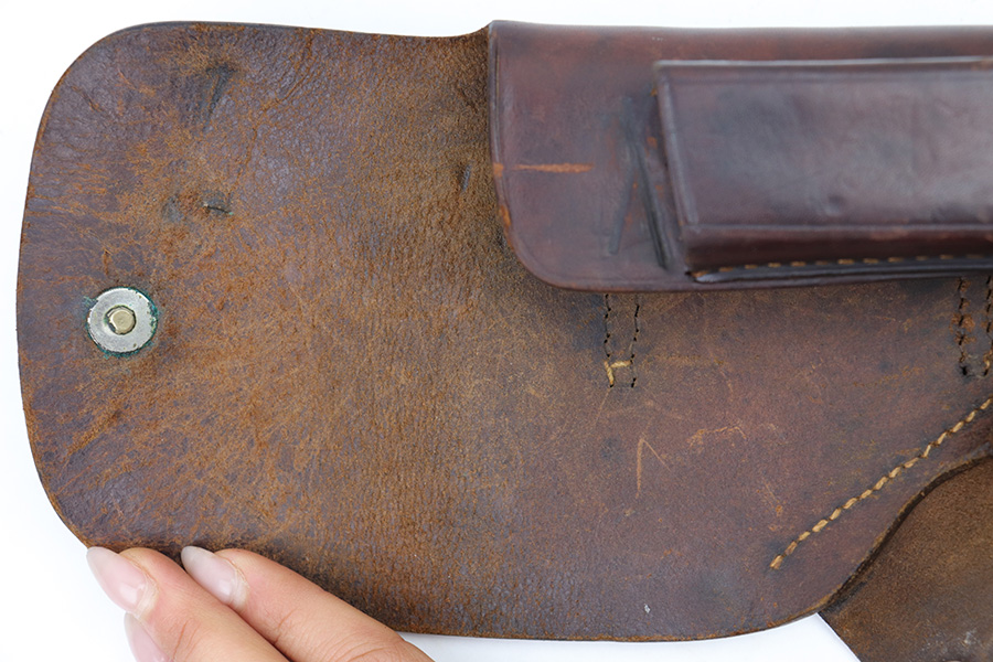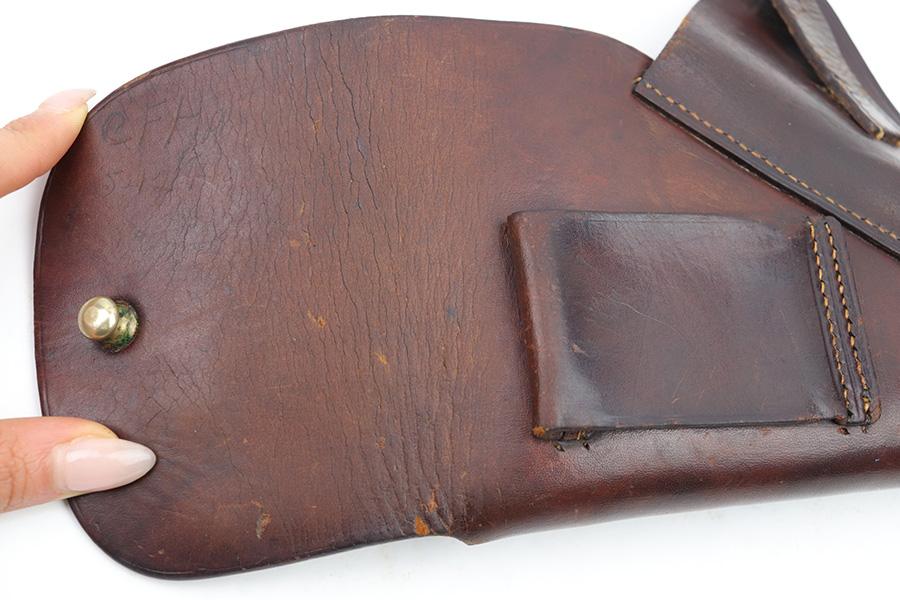 2/8/23 – This is a great example of an original AKAH made holster for a Walther PPK from WW2. The leather exterior is in great condition overall with minor signs of wear throughout but no major defects to note or structural issues. The closure strap shows minor wrinkling, and there is a very light indent of a name scratched into the top leather. The interior leather is in great condition showing minor signs of use wear throughout. There is a crisp AKAH maker mark under the closure strap. The original stitching is clean and strong throughout.