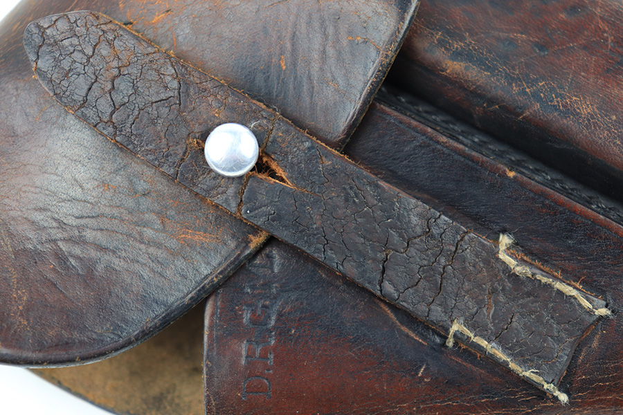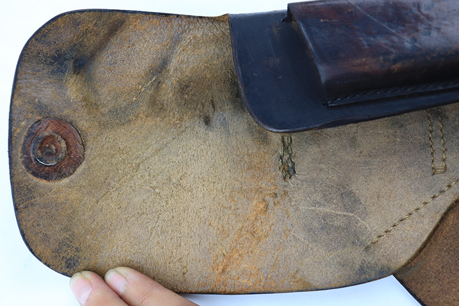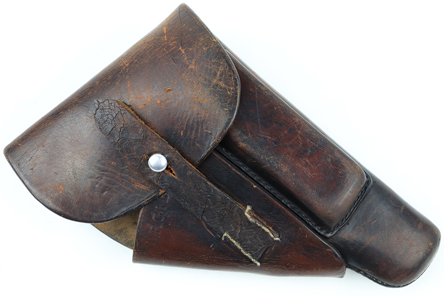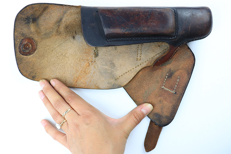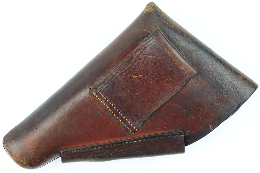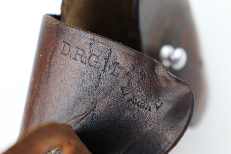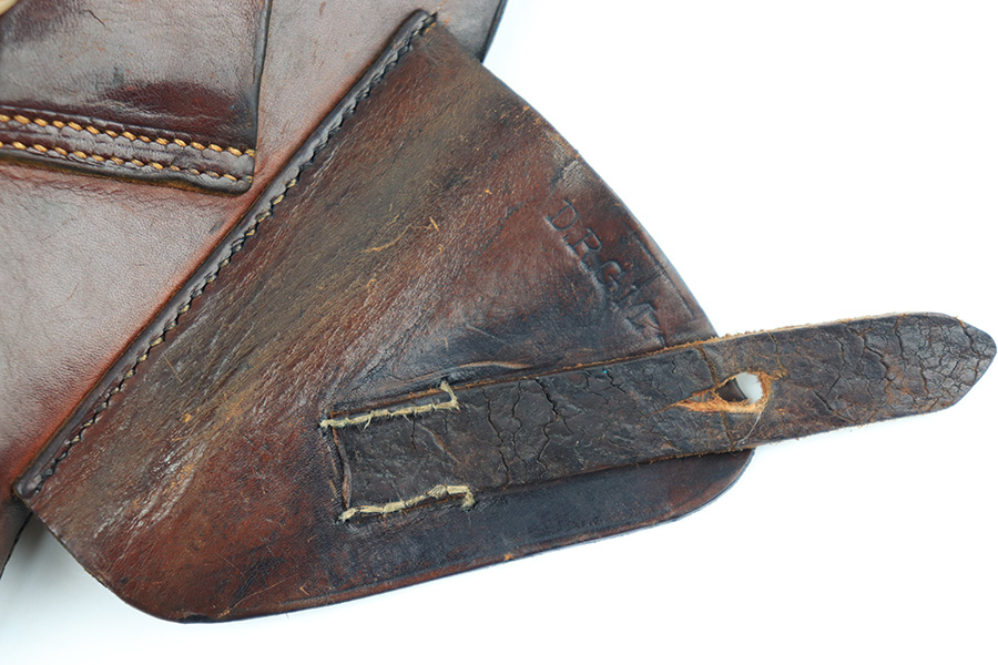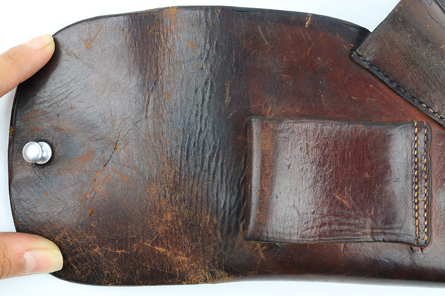 8/3/23 – This is an original WW2 production Walther PPK holster. The holster is stamped on the side flap “D.R.G.M.” and AKAH maker stamped. The closure strap has some surface cracking and wrinkling, and is replaced. The stitching is replacement as well. The rest of the leather is original, as is the rest of the stitching, although the top lines of stitching on the back belt loop are frayed and slightly loose. The leather has normal pliability and typical signs of previous use wear. Mild scuffing throughout the exterior.