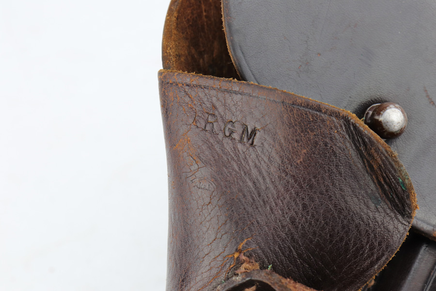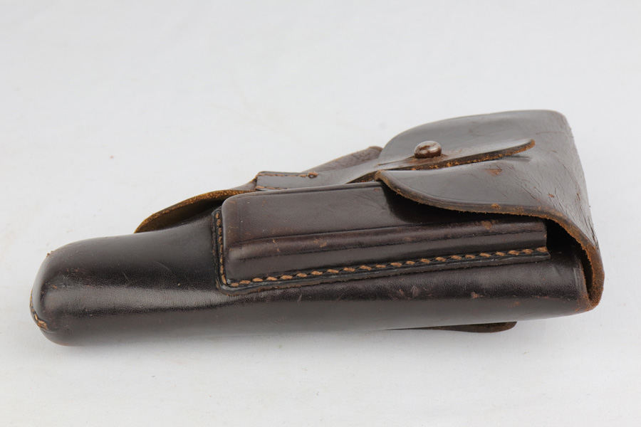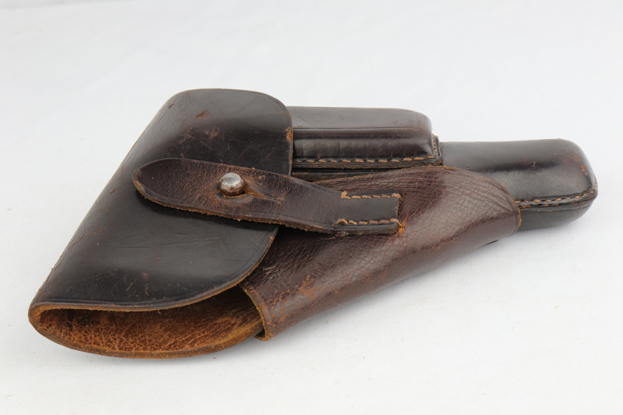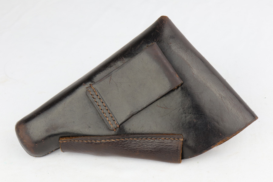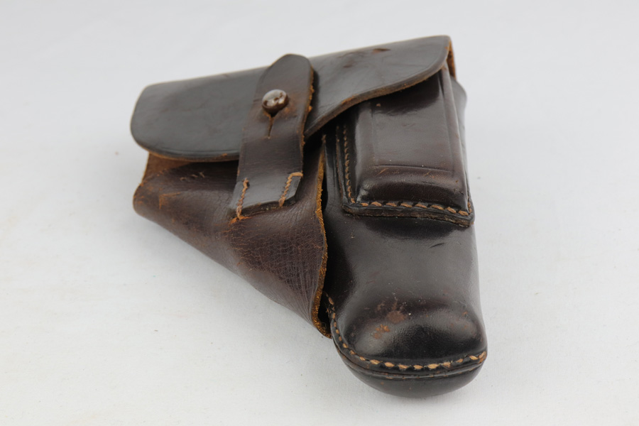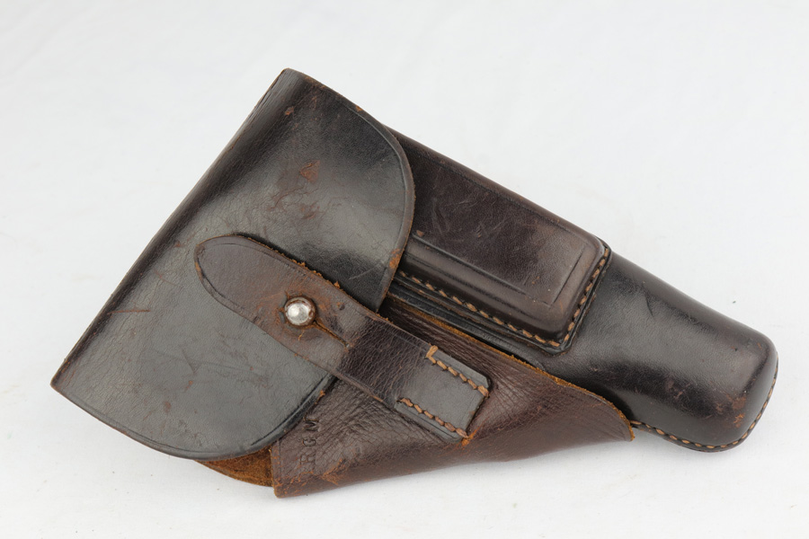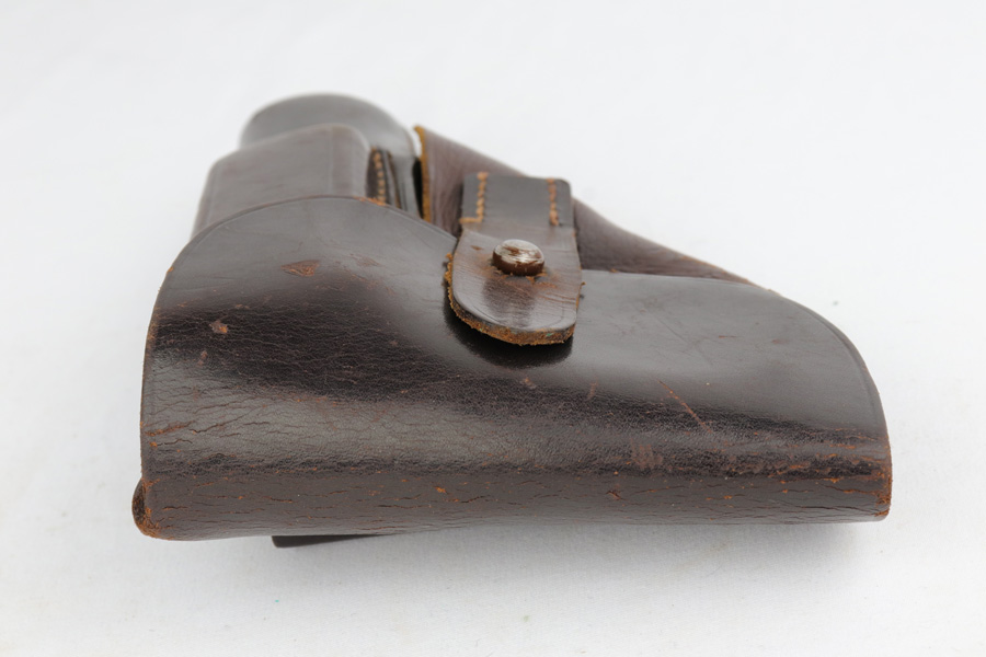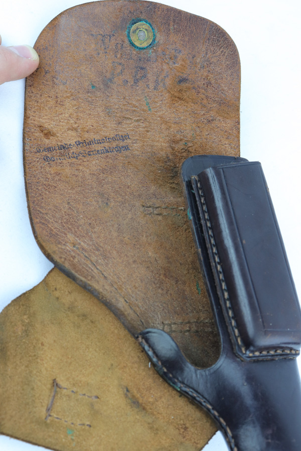 4/24/19 – This is an original WW2 production AKAH PPK holster. The holster is in great overall condition with all original leather and stitching. The interior leather is ink stamped Walther PPK and has a smaller ink stamp on the interior leather as well. We’re not sure the significance of this stamp, likely the German who previously owned this added this as a “customization” or personal touch. There’s some light exterior scuffing and normal wear but overall the leather is strong.