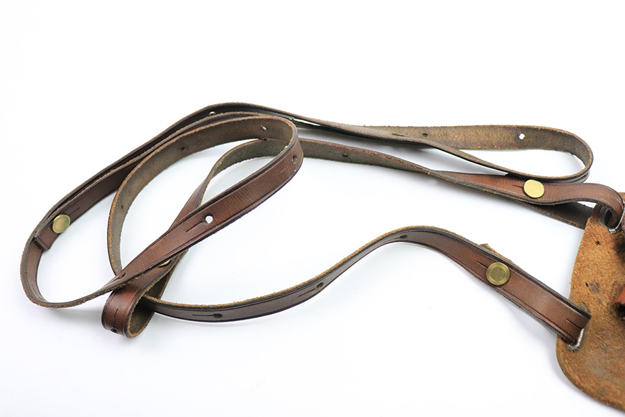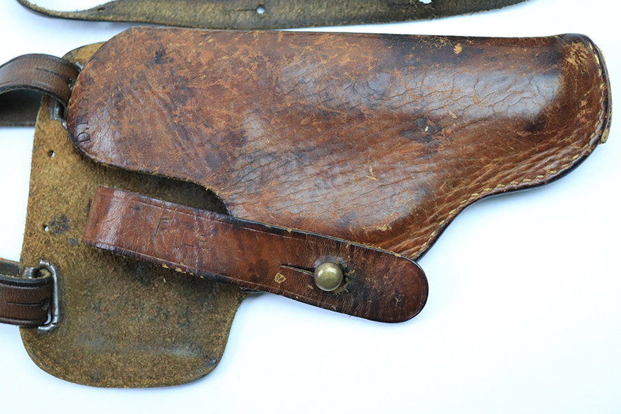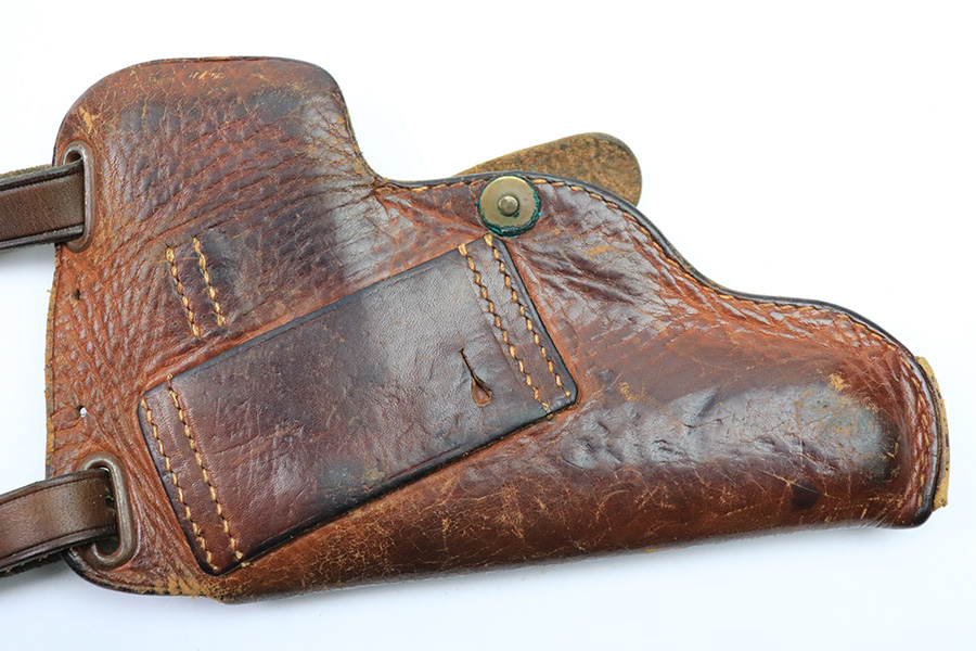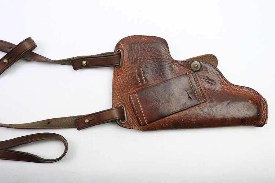 11/29/22 – This is an original AKAH Walther PPK shoulder holster from WW2. The holster comes with post-war production shoulder straps. The holster has surface discoloration and scuffing from prior use and aging. The leather is completely intact with normal pliability. No stitching issues with all original stitching. AKAH stamped on the front leather with “D.R.G.M.” above the maker.