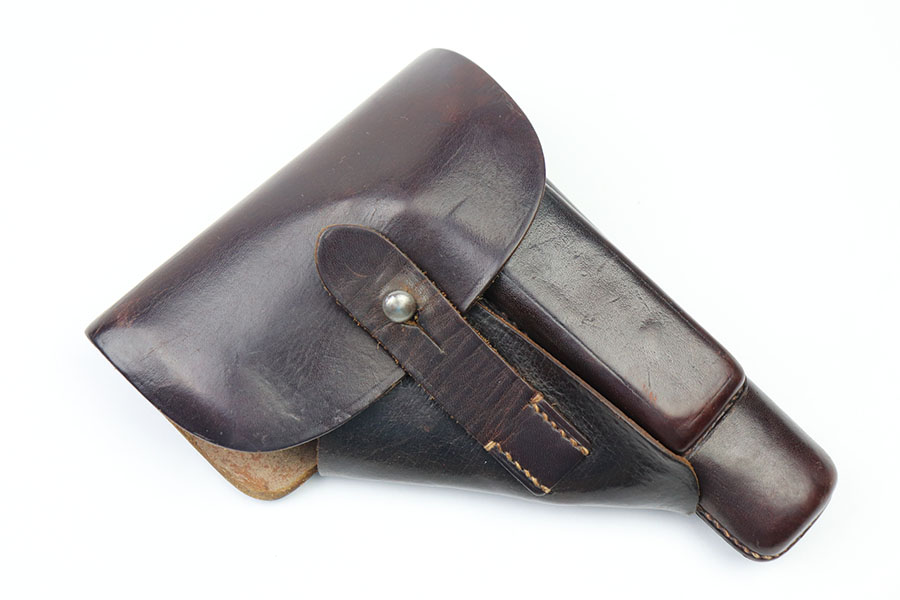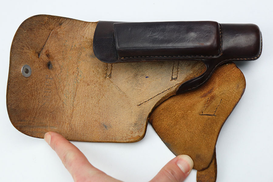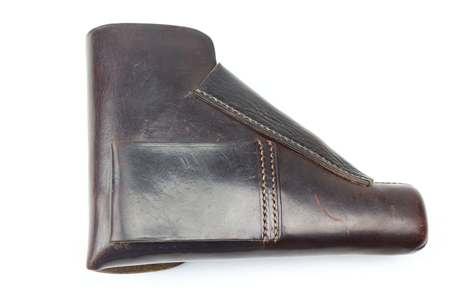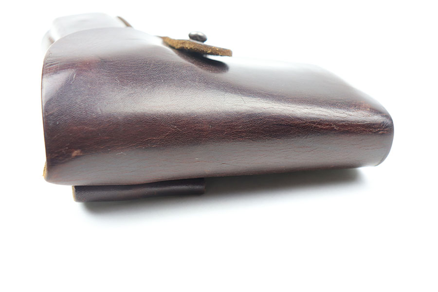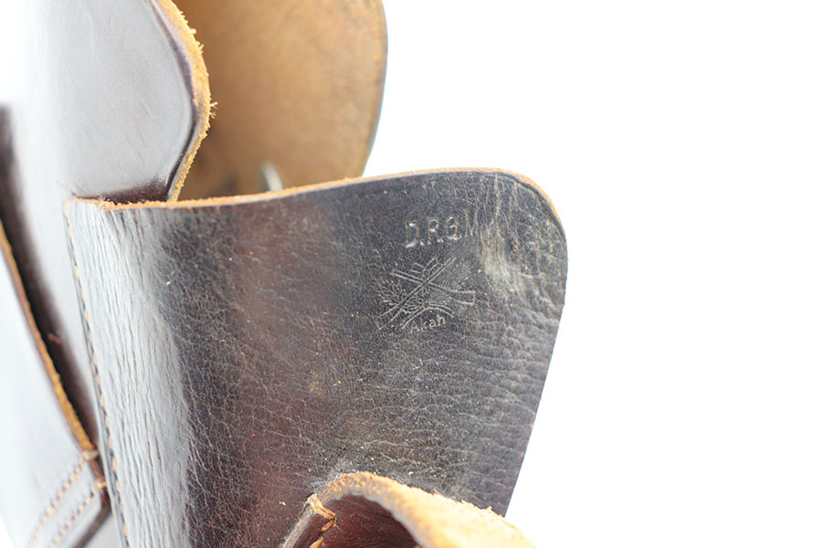 4/20/21 – This is a fairly scarce, excellent condition AKAH made holster for a Sauer 38h pistol. The holster is maker stamped under the closure strap, and the original Sauer 7,65 ink stamp is still somewhat visible on the interior leather. The leather is strong and clean with some mild signs of previous use. Excellent stitching is all original and in tact.