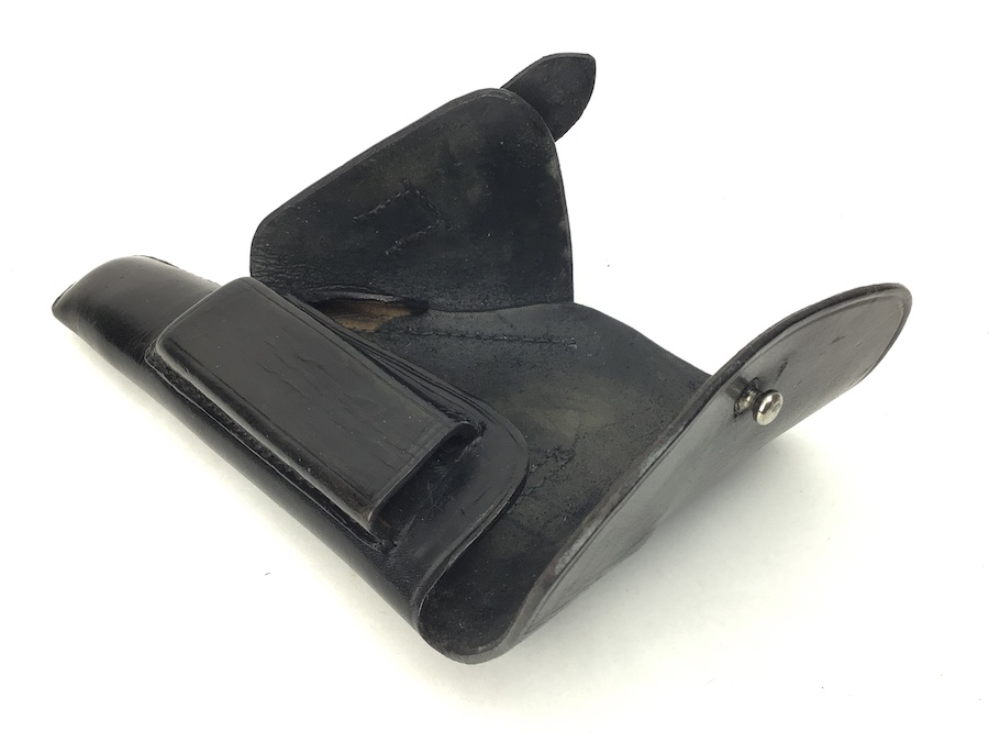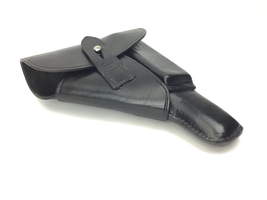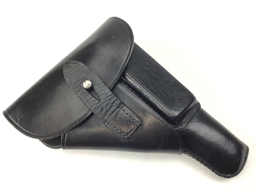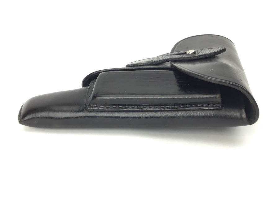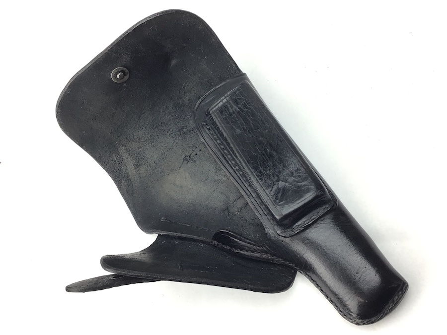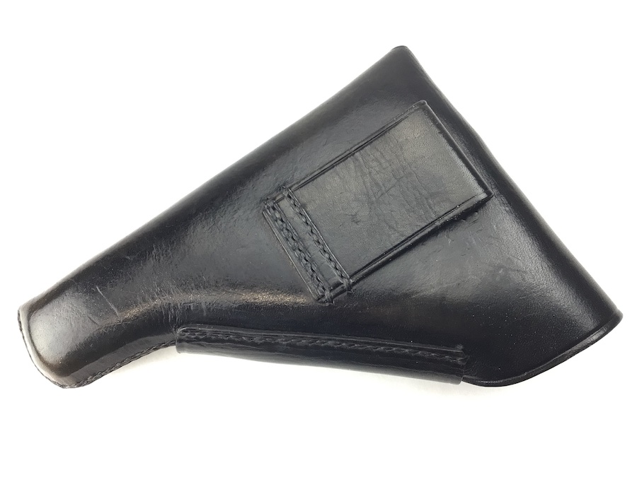 2/9/21 – This is an original AKAH style Walther PP holster from late WW2. Also fits Mauser HSc, 38h and most other 7.65mm axis pistols. No maker mark or date, but the style and stitching indicates late war manufactured. The interior leather is clean. All stitching is intact.