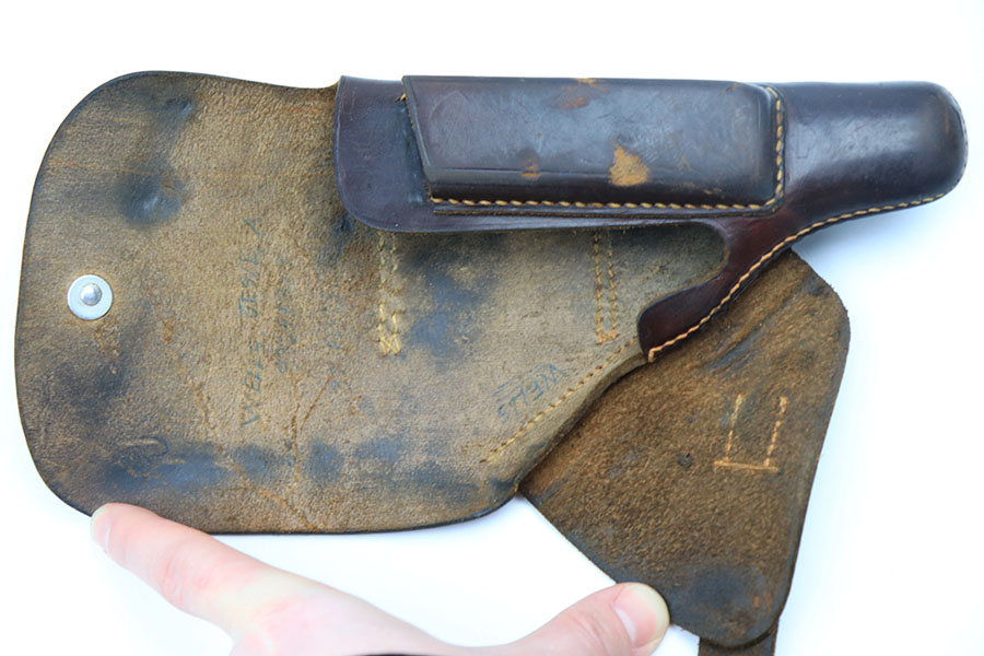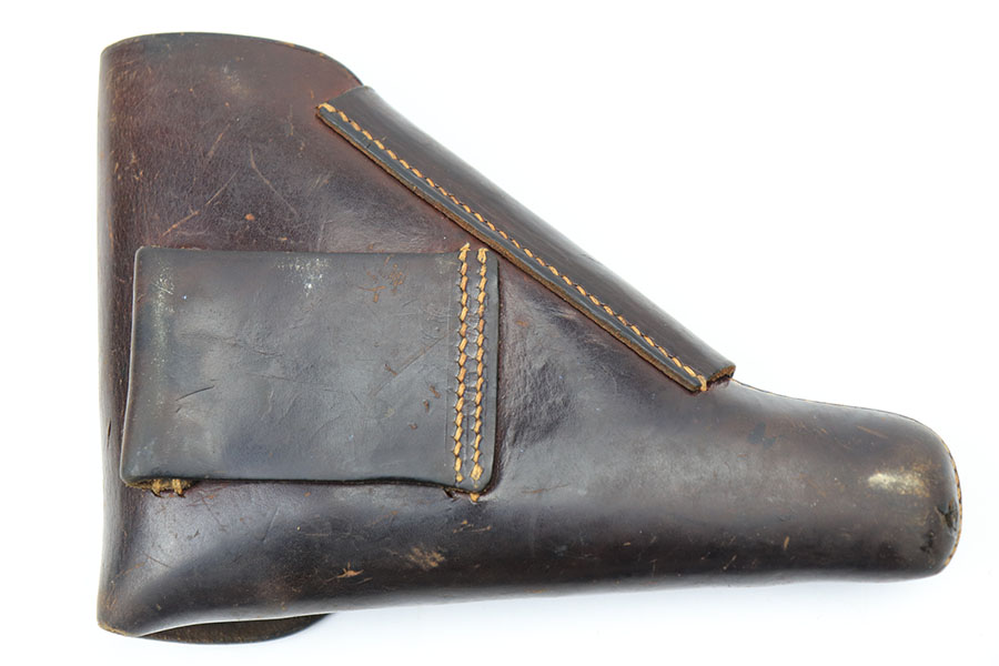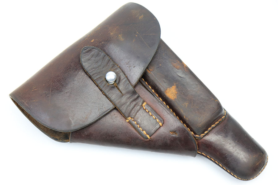 2/11/21 – This is an original WW2 AKAH Walther PP holster. The holster is in good overall condition with some mild wear. There’s a scuff on the front of the magazine pouch and a small hole in the leather below the closure strap. Neither of these are major issues. The stitching is all tight and original. Leather is all original and in tact. There’s an AKAH maker stamp under the closure strap.