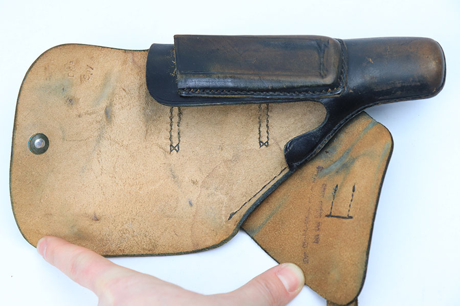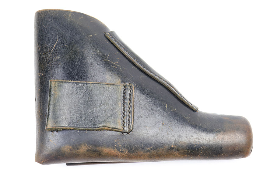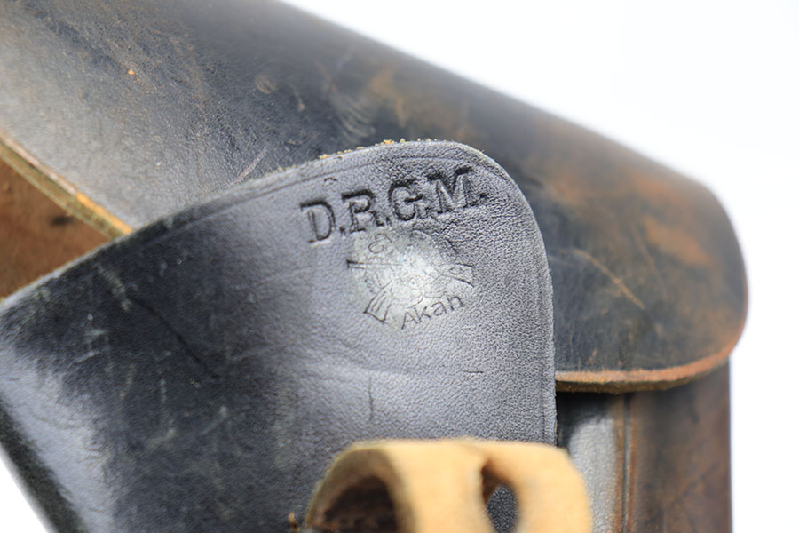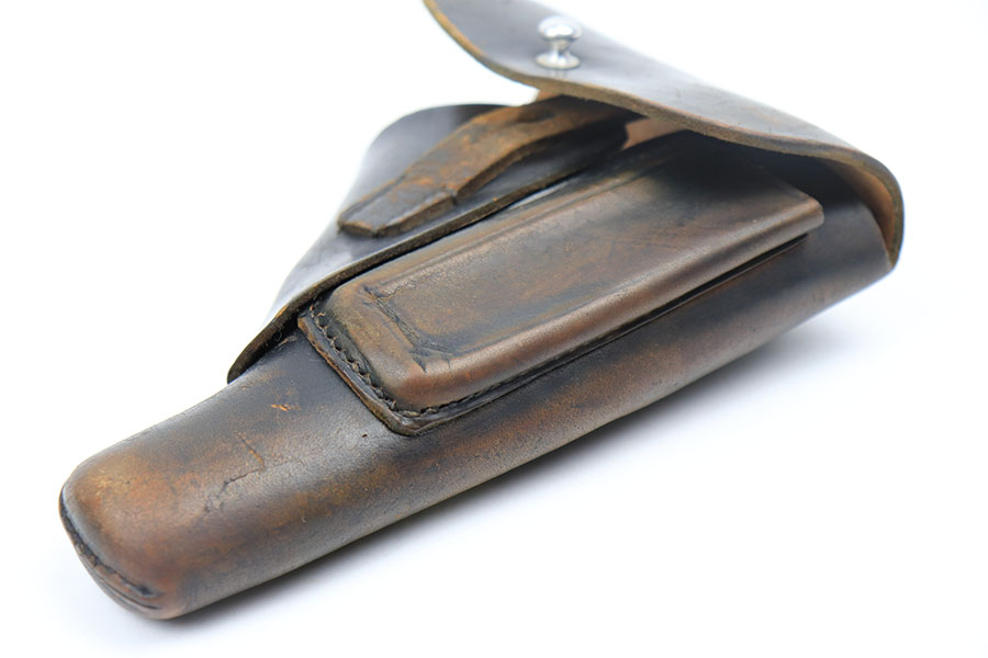 3/4/21 – This is an original AKAH Walther PP holster from WW2. The holster is maker stamped under the closure strap. No other markings. There is fading to the black dyed leather, as shown, but this is normal wear due to aging and use. No excessive damage on the holster. Clean interior leather. All original stitching is in tact.