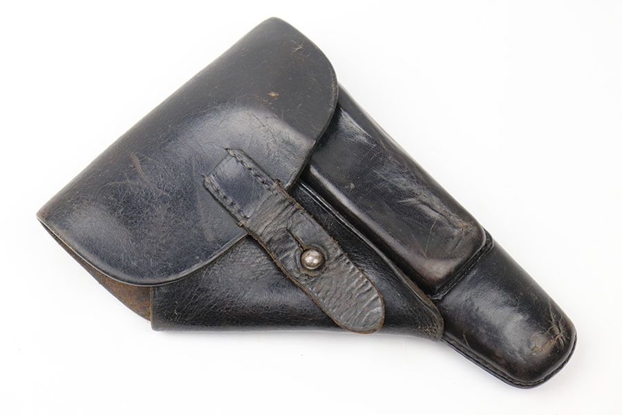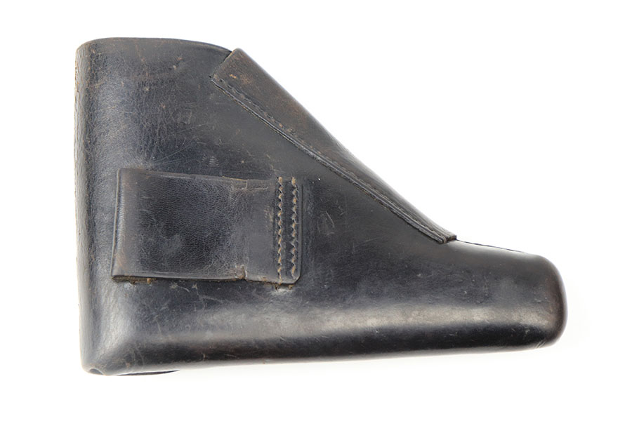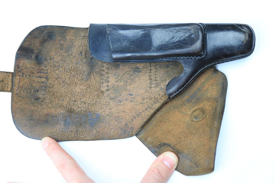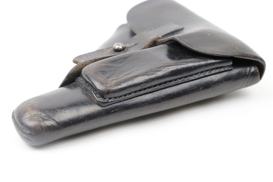6/23/21 – This is an original AKAH Walther PP holster. AKAH stamped “AK” with a faint logo underneath the closure strap. The interior leather still shows the original Walther PP ink stamp, although it’s faint. The stitching is all original and intact, as is the leather. There is some surface wrinkling near the toe and on the magazine pouch, but no major issues.