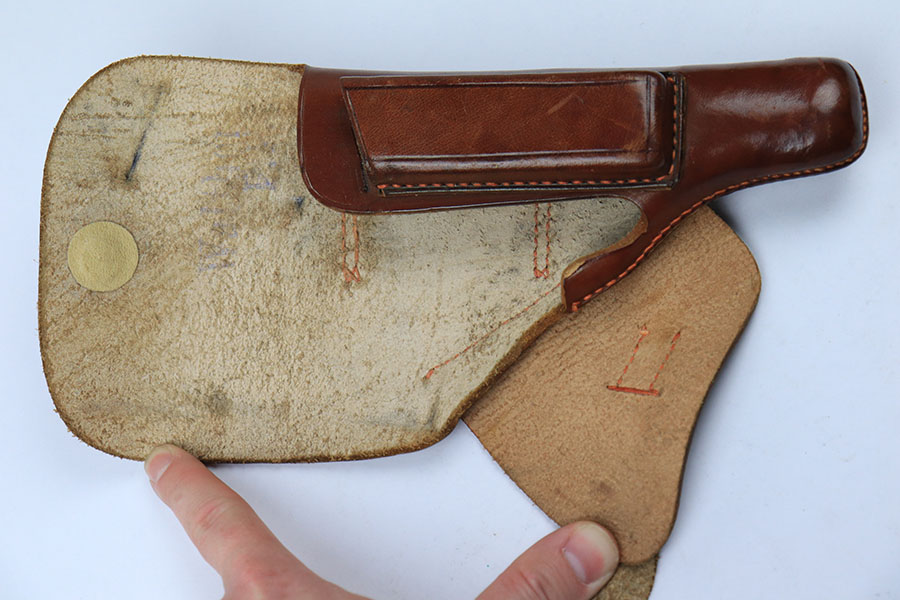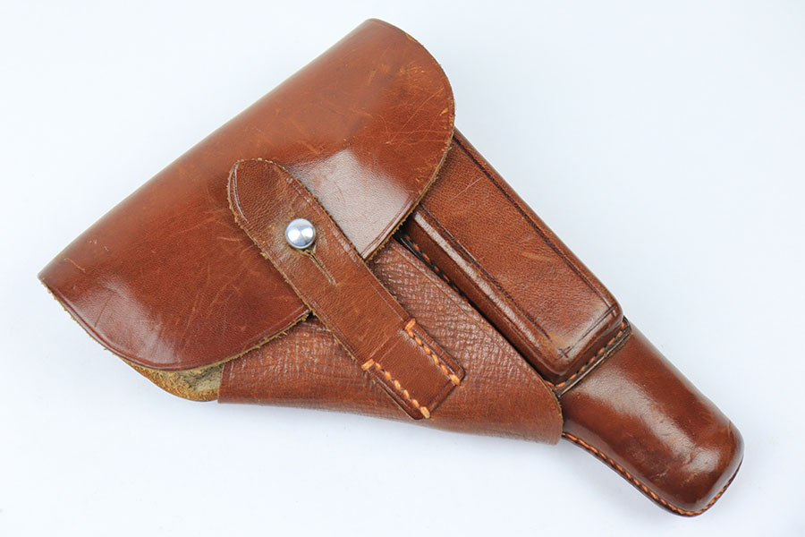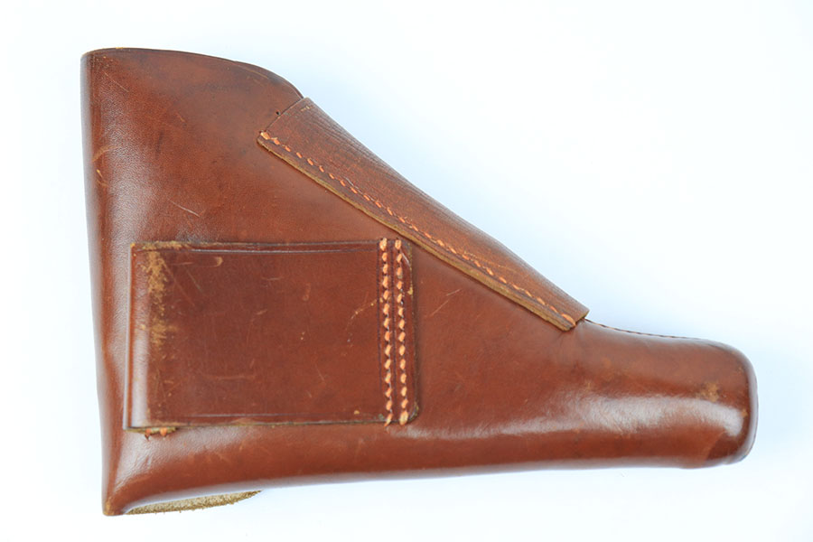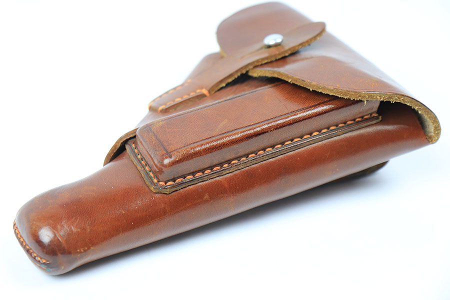 7/30/21 – This is a mint condition, high-end AKAH Walther PP holster from WW2. The holster has beautiful brown leather and a very clean interior. Original Walther PP ink stamp is still visible, though faint. There’s a crisp AKAH stamp under the closure strap. Excellent stitching is completely in tact.