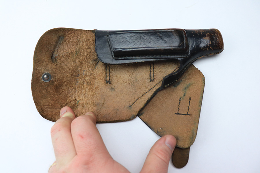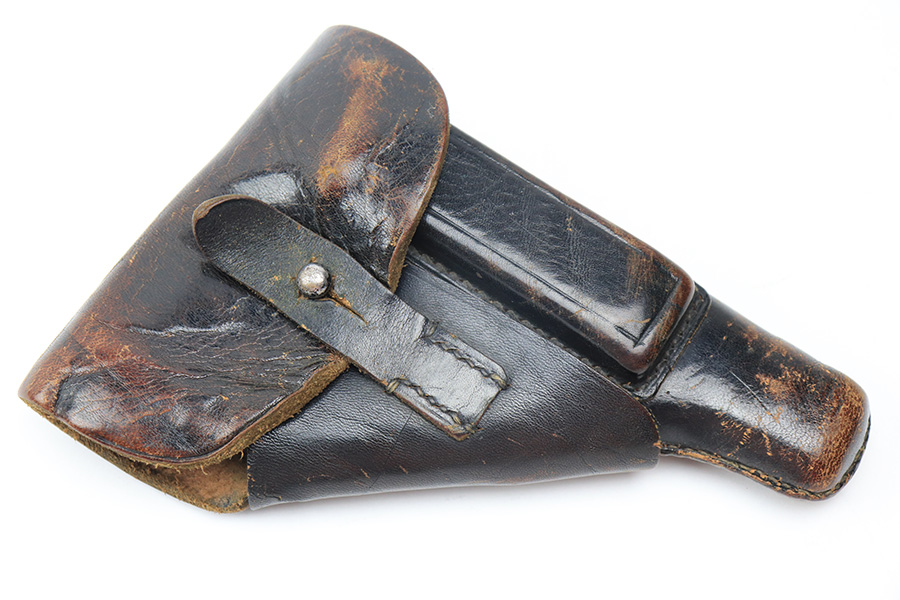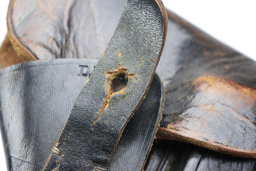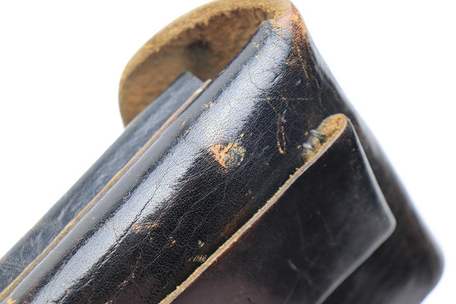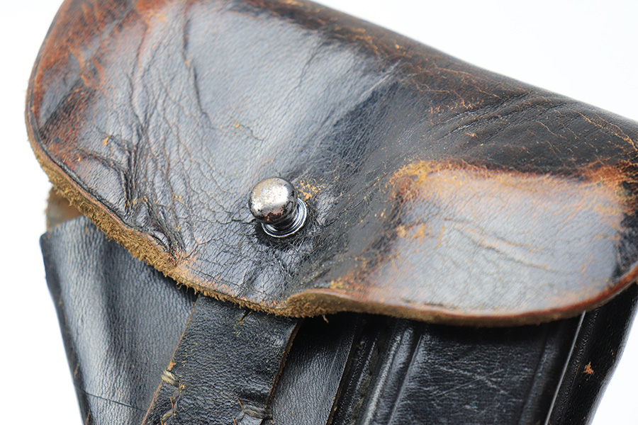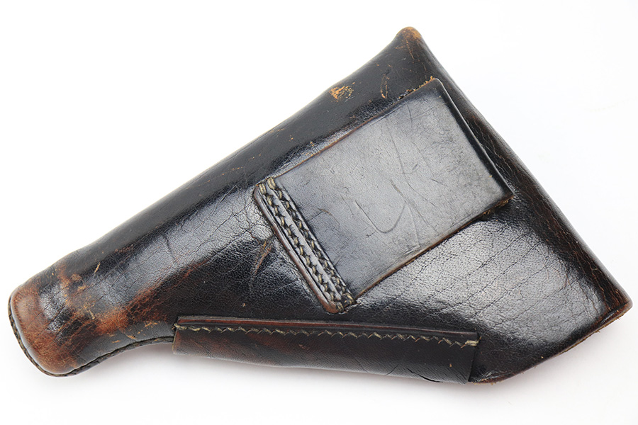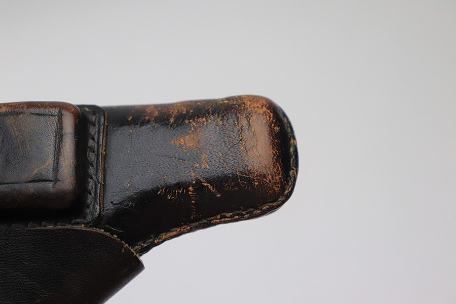 12/7/21 – This is an original WW2 AKAH Walther PP holster. The holster is in good overall condition with no major issues but some honest use wear and typical aging throughout. The leather shows surface wear and wrinkling throughout but no holes or tares. The interior leather shows a faint remnant of the original Walther PP ink stamp. Under the closure strap is an AKAH maker stamp. No notable stitching flaws.